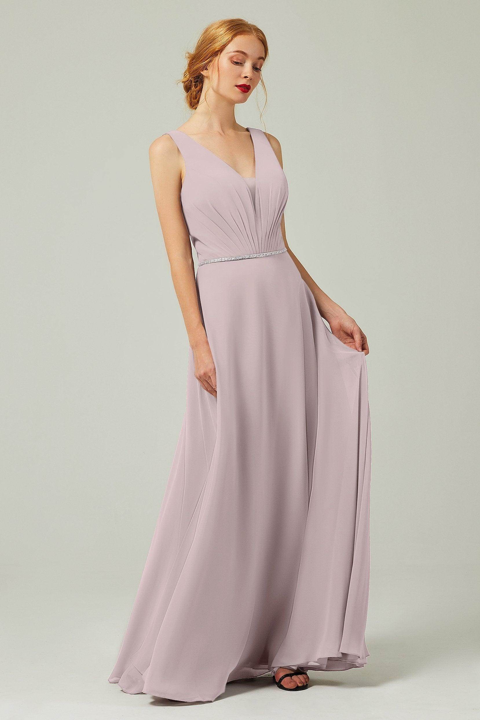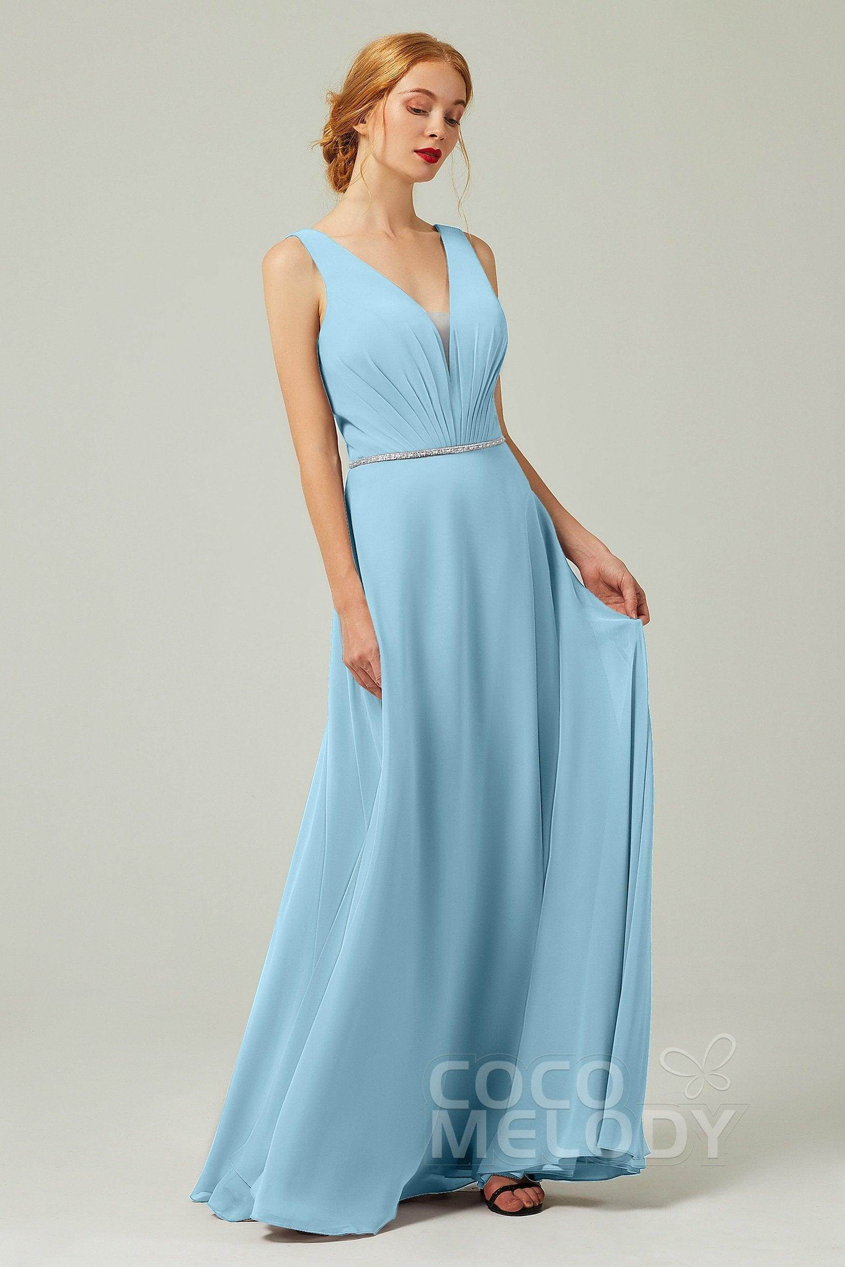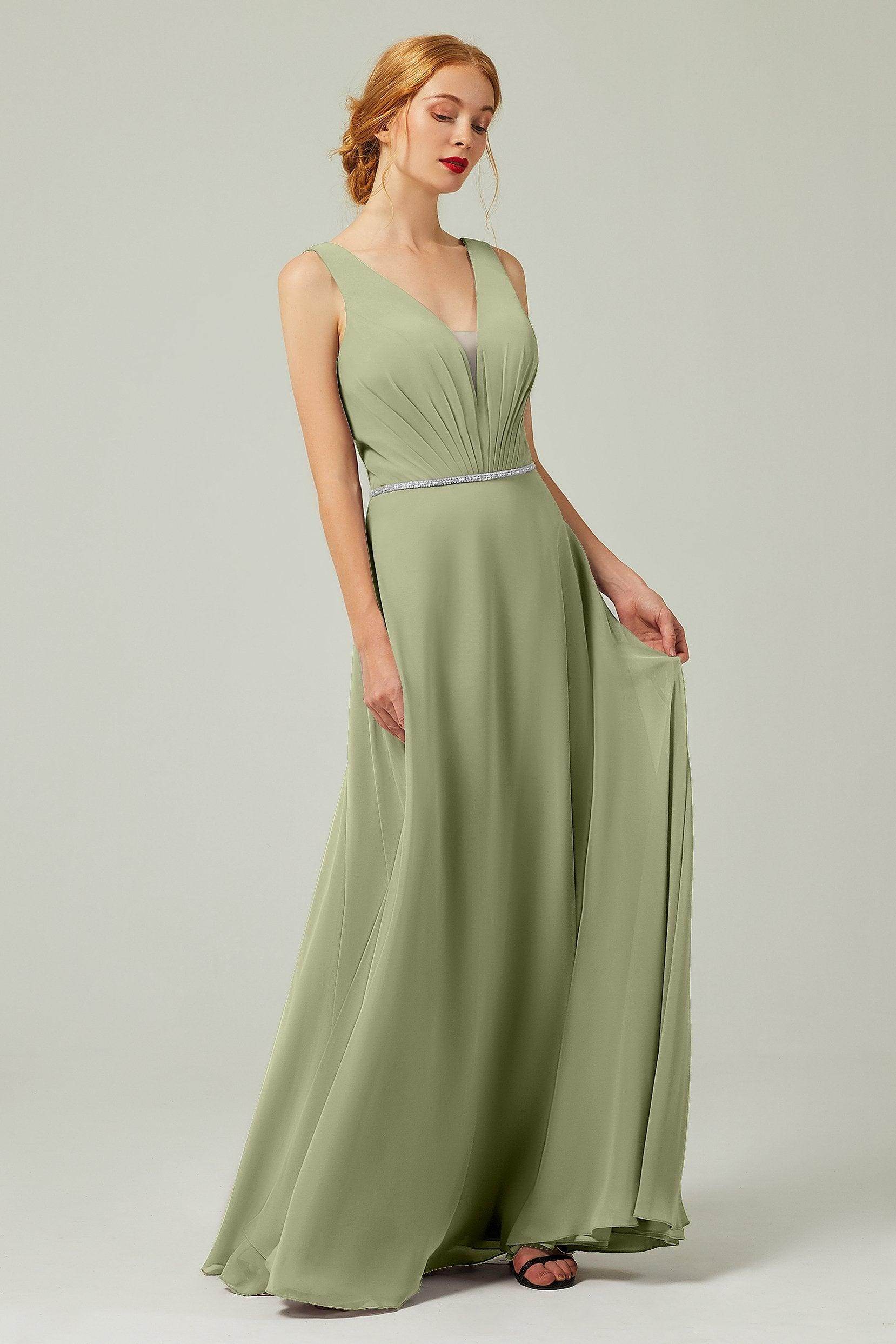 Back Details: Zipper Embellishment: Pleating, Sashes Fabrics: Chiffon Length: Floor Length Neckline: V-Neck Silhouette Style: Sheath-Column Sleeve Length: Sleeveless Waist...