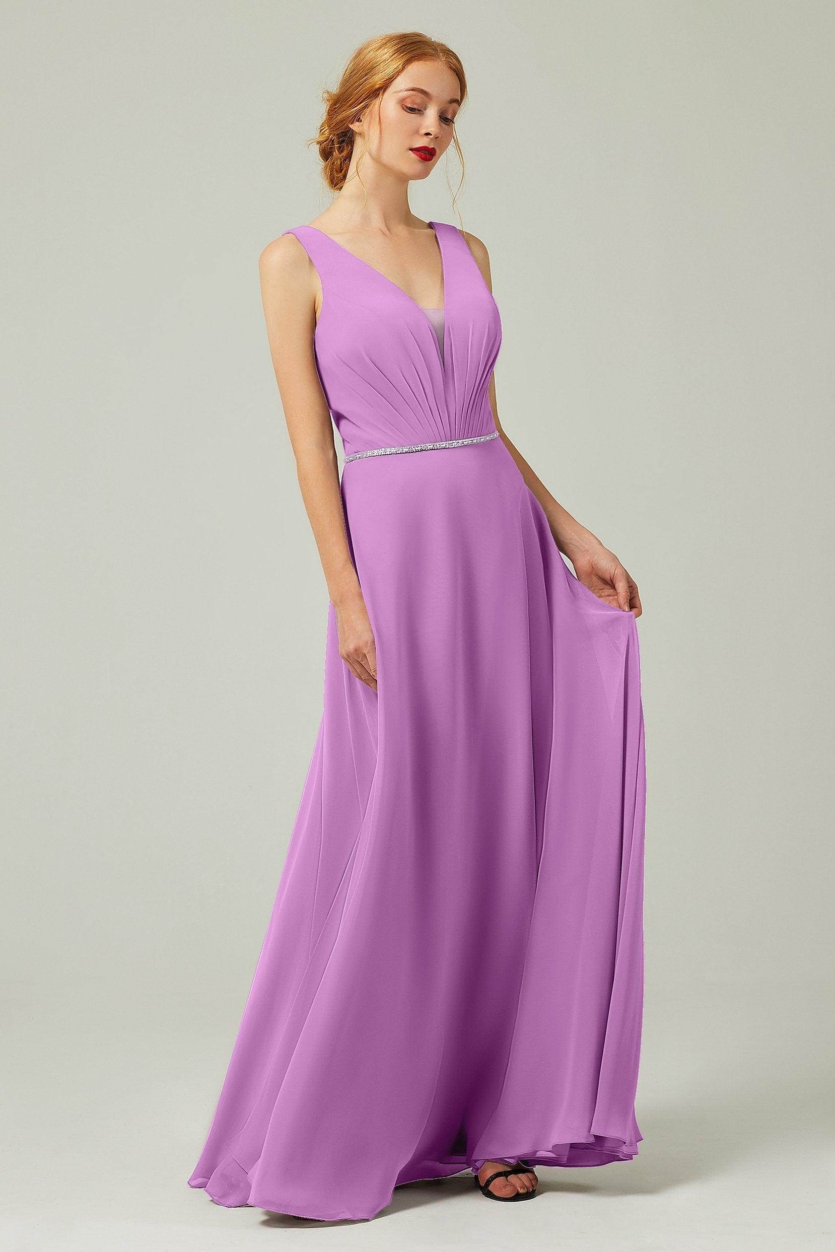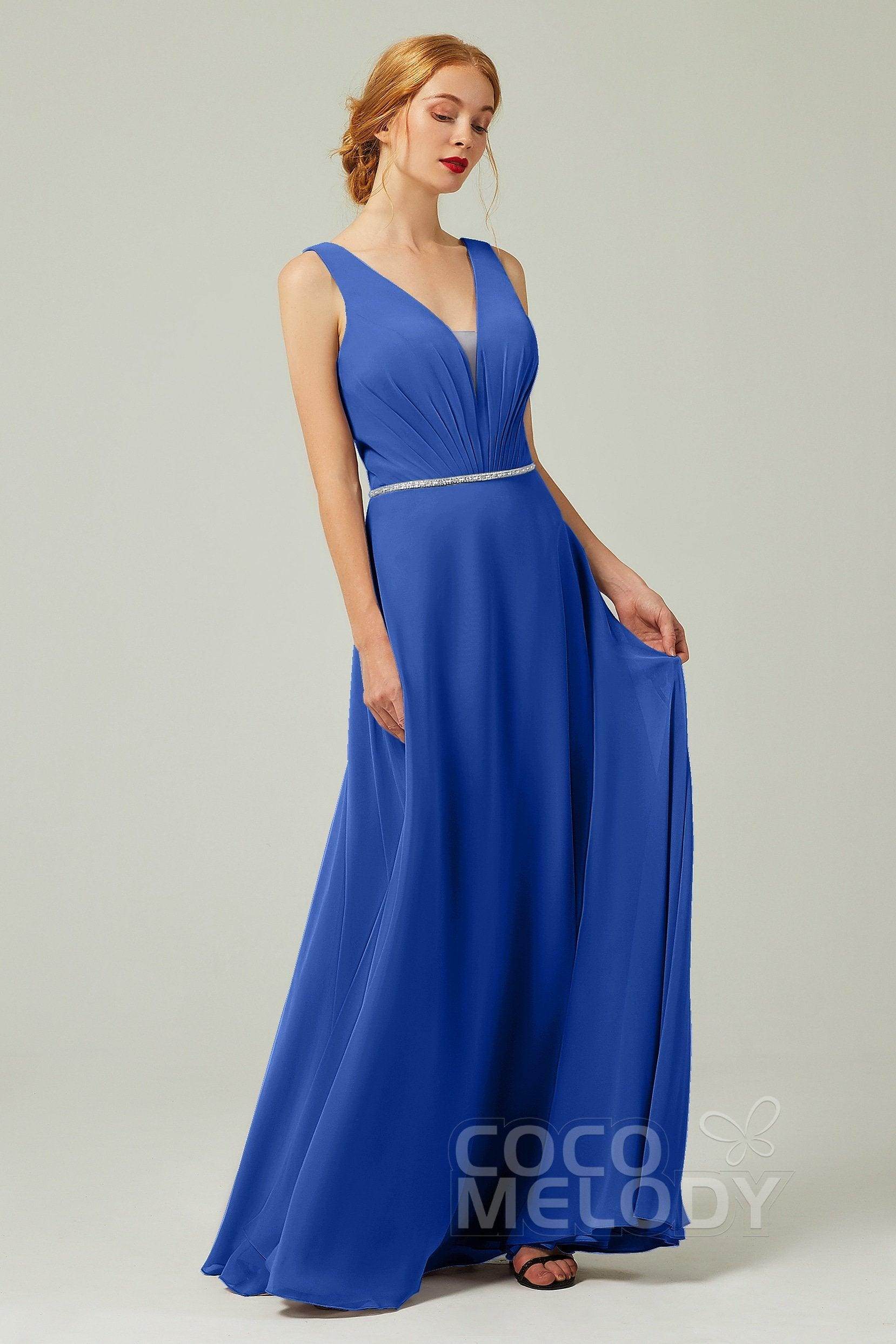 Back Details: Open Back Embellishment: Pleating Fabrics: Chiffon Length: Floor Length Neckline: V-Neck Silhouette Style: A-Line Sleeve Length: Sleeveless Waist...