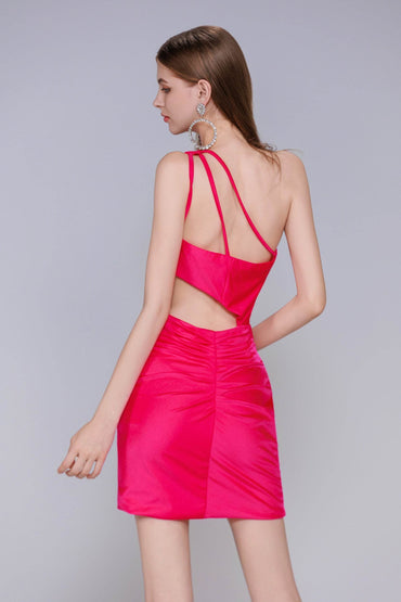 Silhouette Style: Sheath-Column Neckline: One Shoulder Sleeve Length: Sleeveless Waist Style: Natural Back Details: Side Zipper Length: Mini Embellishment: Split...