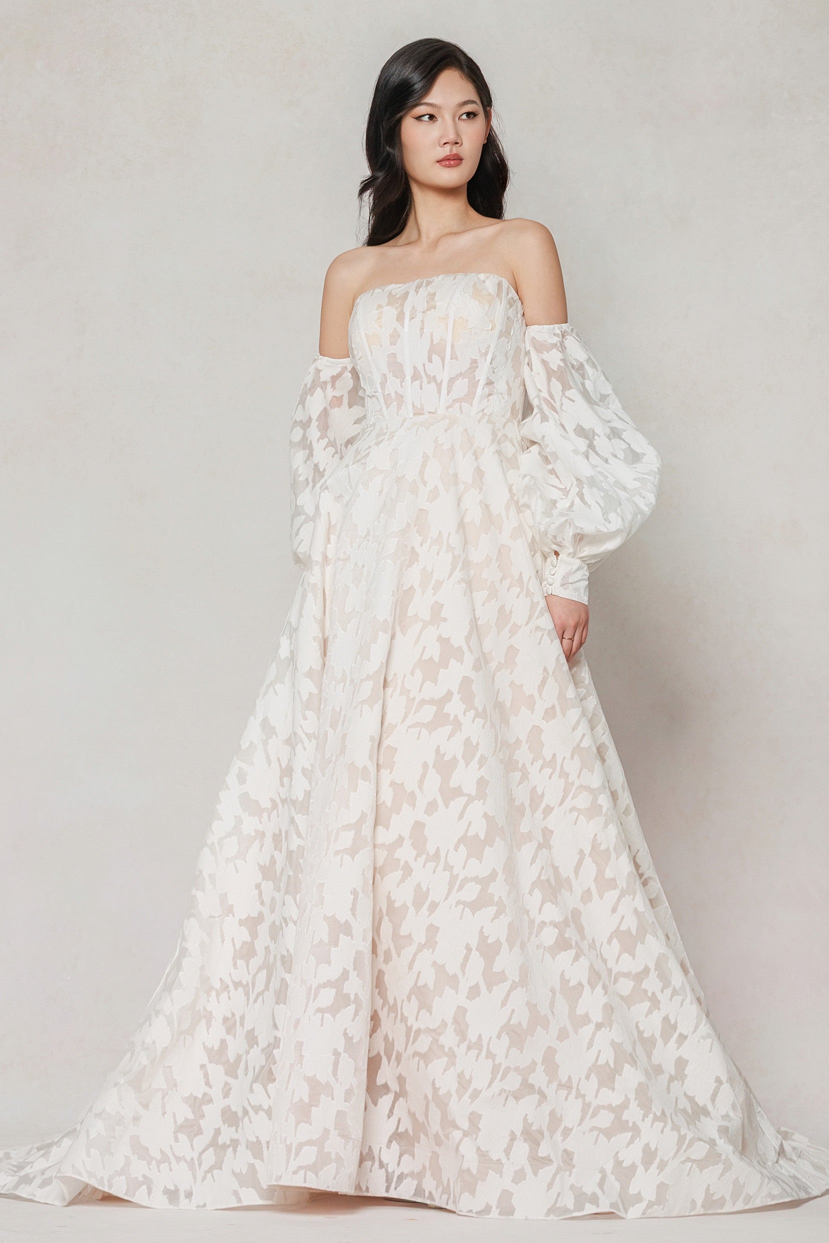 Style Name: EUNICE Silhouette Style: A-Line Neckline Style: Strapless Sleeve: Long Sleeve Waist: Natural Back Detail: Zipper With Buttons Hemline/Train:...