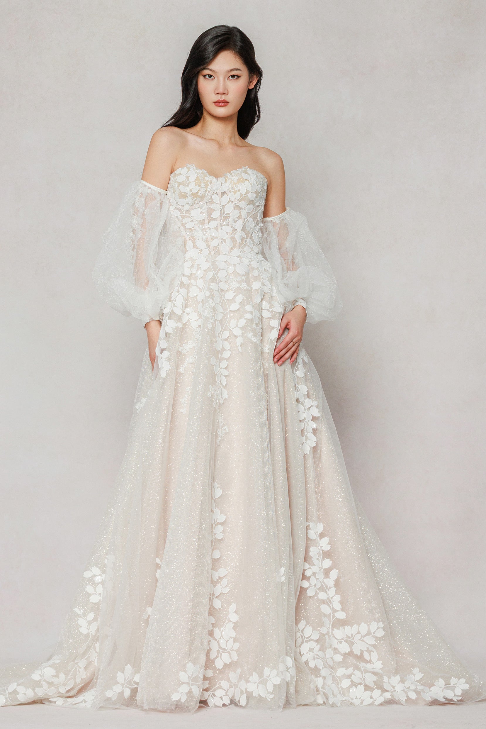 Style Name: ROSALINA Silhouette Style: A-Line Neckline Style: Strapless Sleeve: Puff Sleeves Waist: Natural Back Detail: Zipper With Buttons Hemline/Train:...
