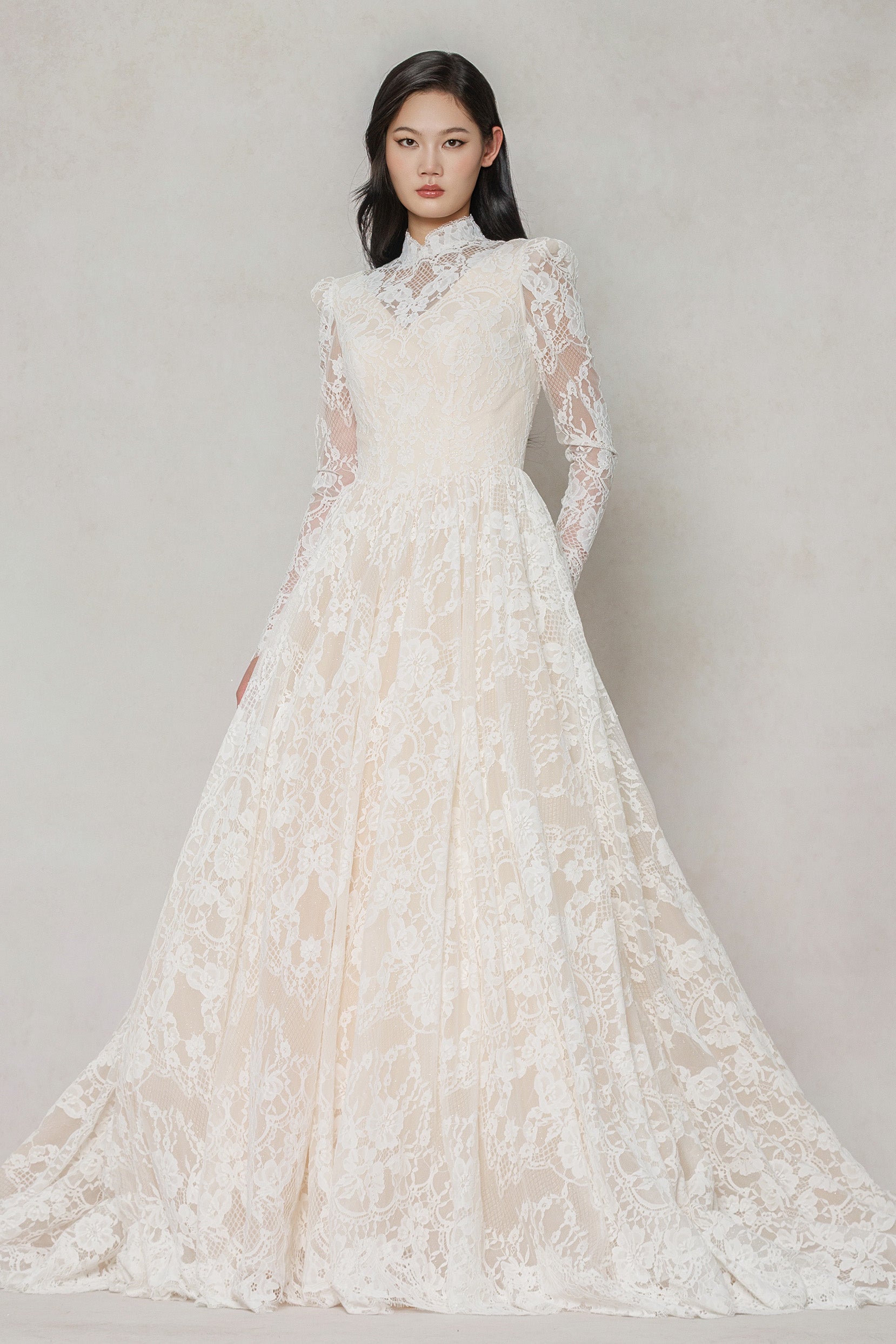 Style Name: SYMPHONY Silhouette Style: A-Line Neckline Style: High Neck Sleeve: Long Sleeve Waist: Natural Back Detail: Zipper With Buttons...