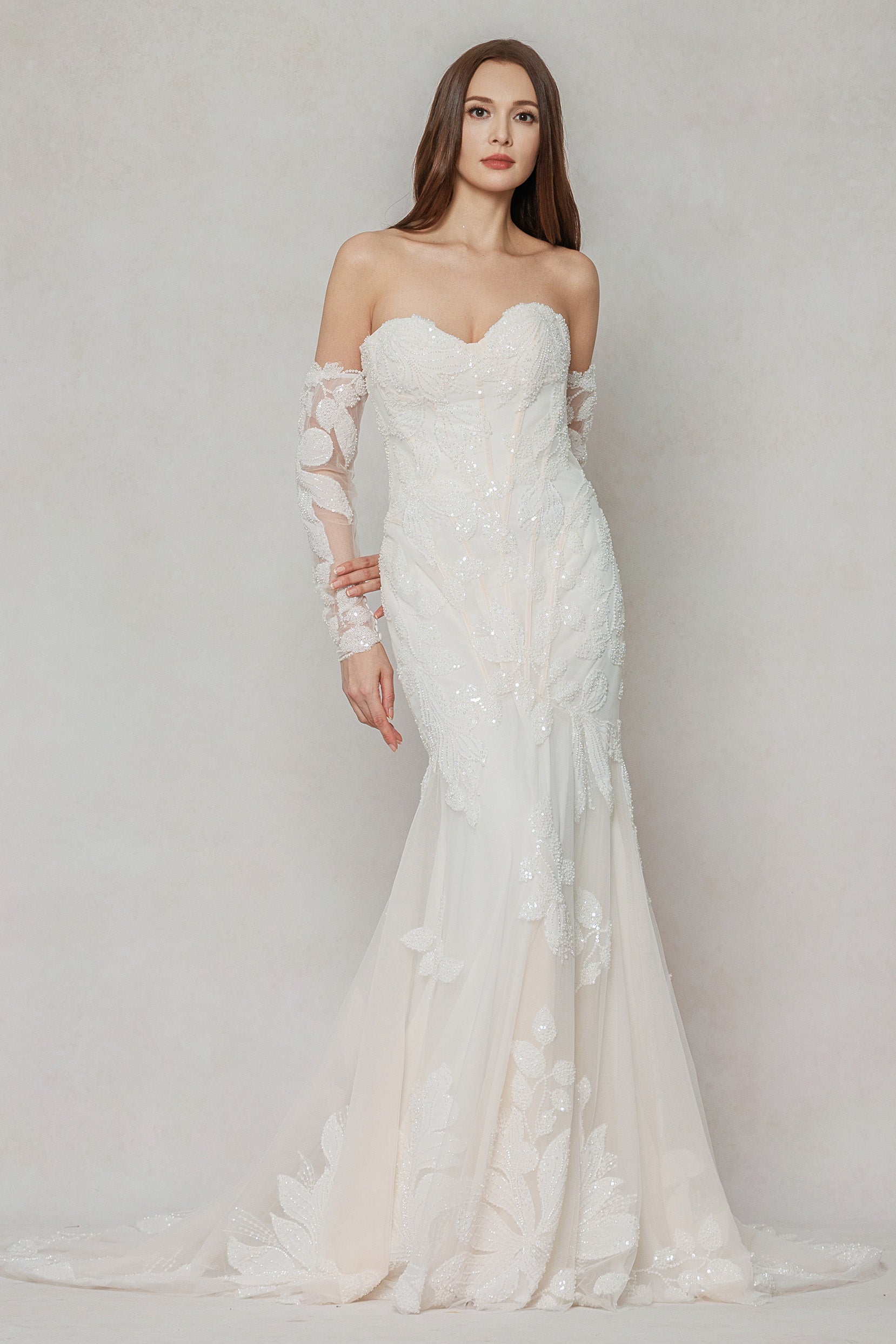Style Name: ZIVA Silhouette Style: Trumpet-Mermaid Neckline Style: Sweetheart Sleeve: Long Sleeve Waist: Natural Back Detail: Zipper Hemline/Train: Court Train...