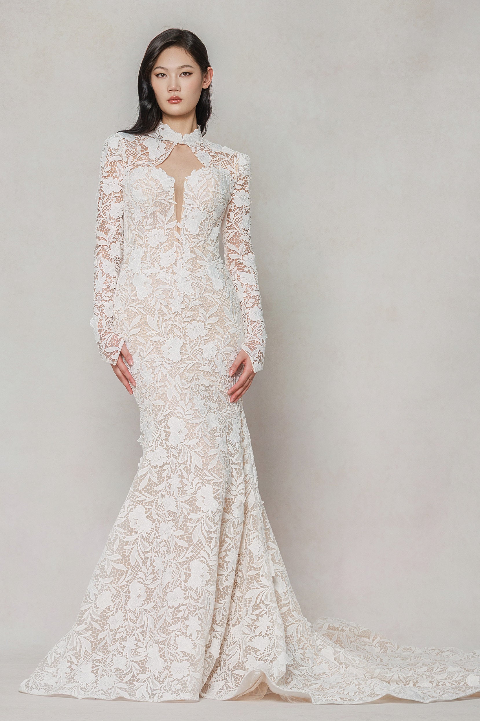 Style Name: ZAIRA Silhouette Style: Trumpet-Mermaid Neckline Style: V-Neck Sleeve: Long Sleeve Waist: Natural Back Detail: Zipper Hemline/Train: Chapel Train...