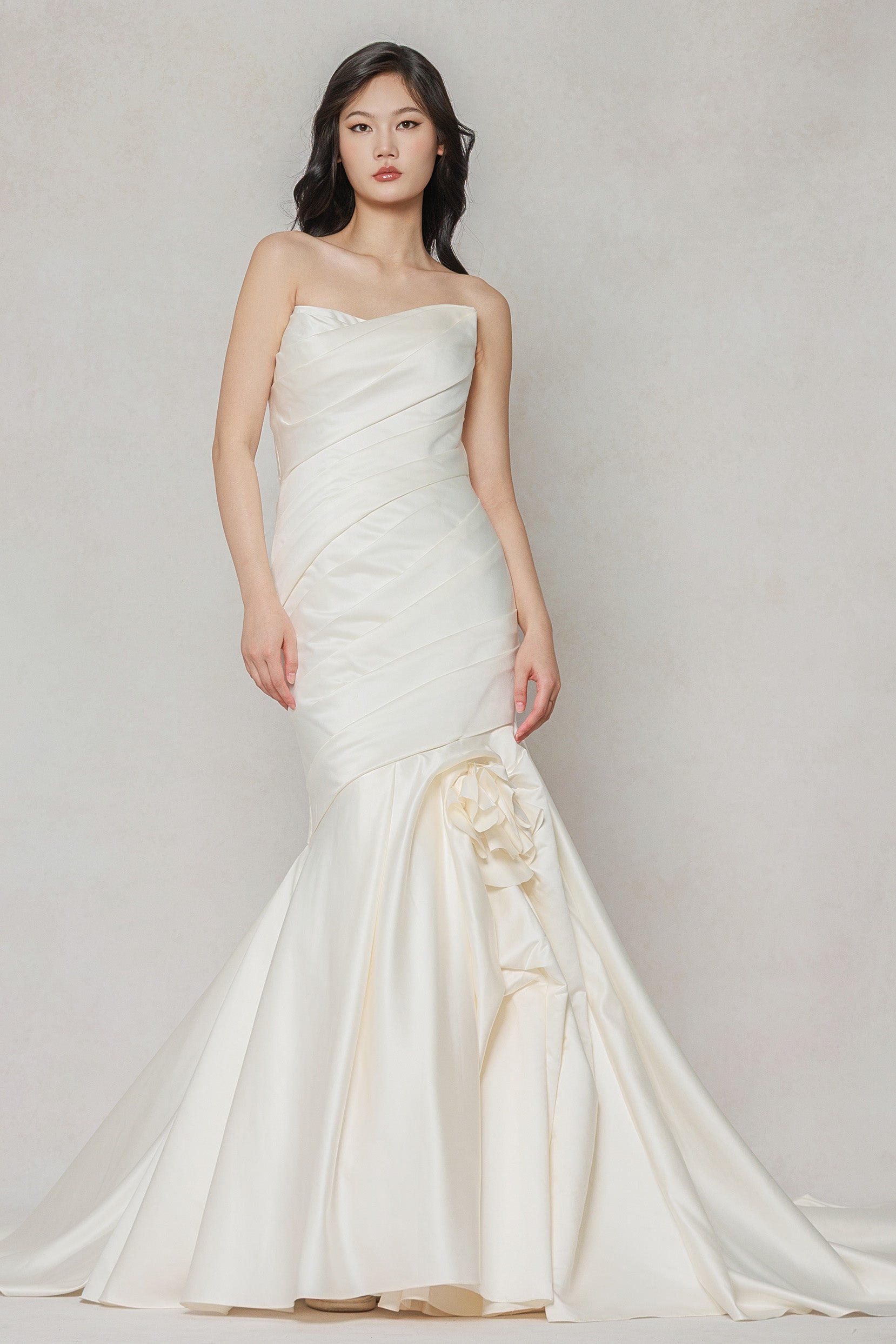 Style Name: JAQUELINE Silhouette Style: Trumpet-Mermaid Neckline Style: Strapless Sleeve: Sleeveless Waist: Natural Back Detail: Zipper Hemline/Train: Court Train Boning:...