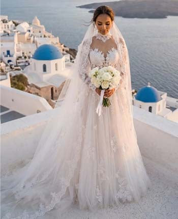 Style Name: CALEIGH Customization: Yes Color Category: Ivory/Nude Embellishments: Appliques, Beading Neckline Style: High Neck Waist: Natural Sleeve: Long Sleeve...