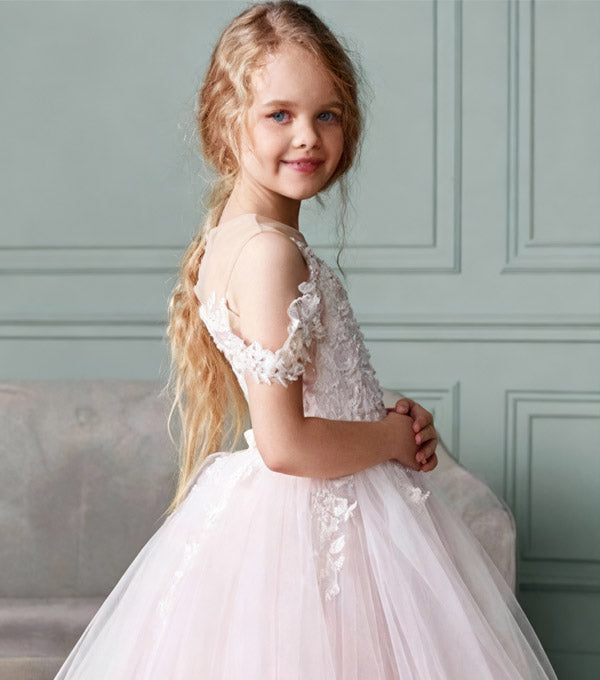 Ball-Gown Illusion Neck Princess Tulle Flower Girl Dresses With Appliques Lace 626723738802