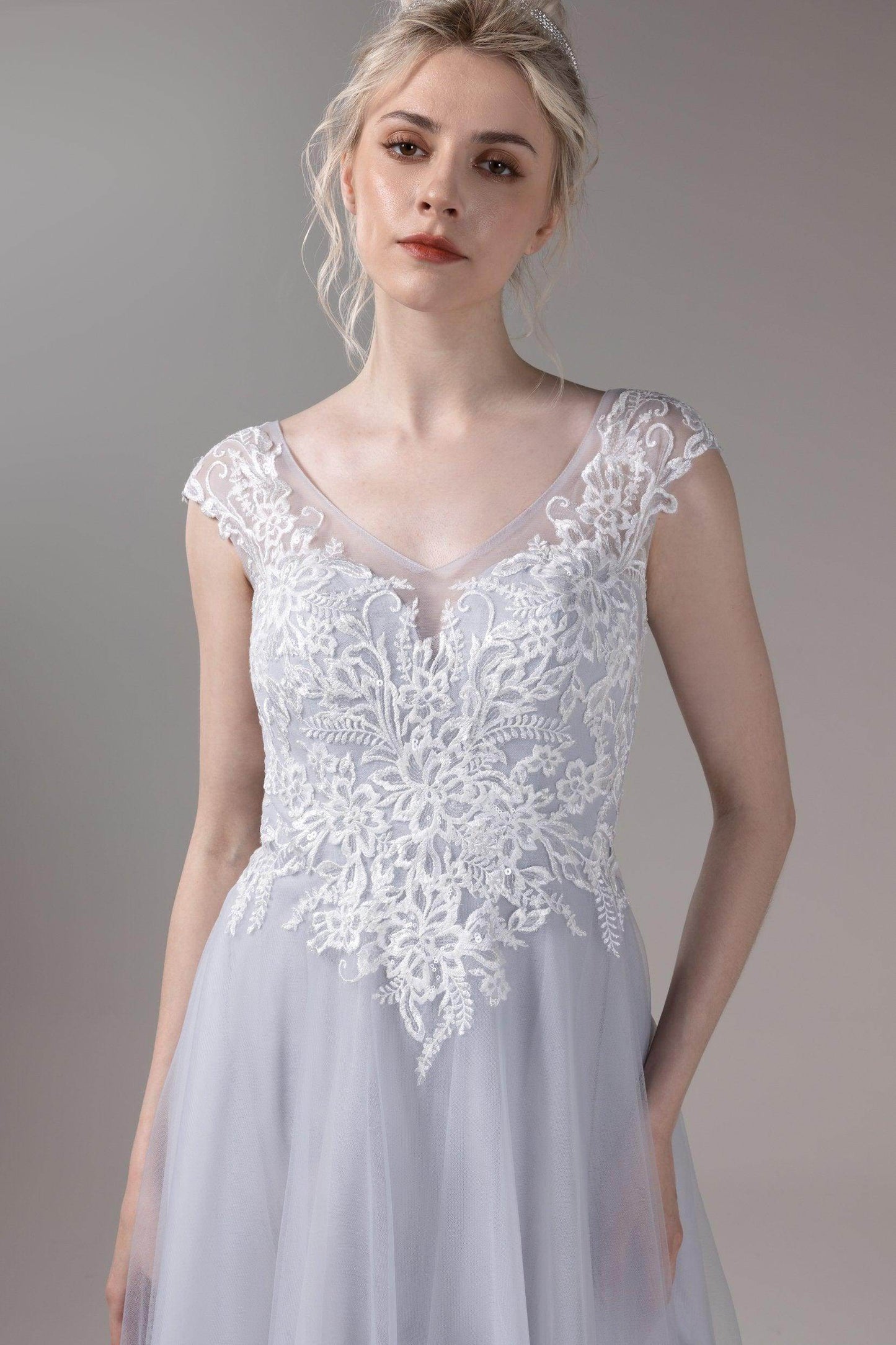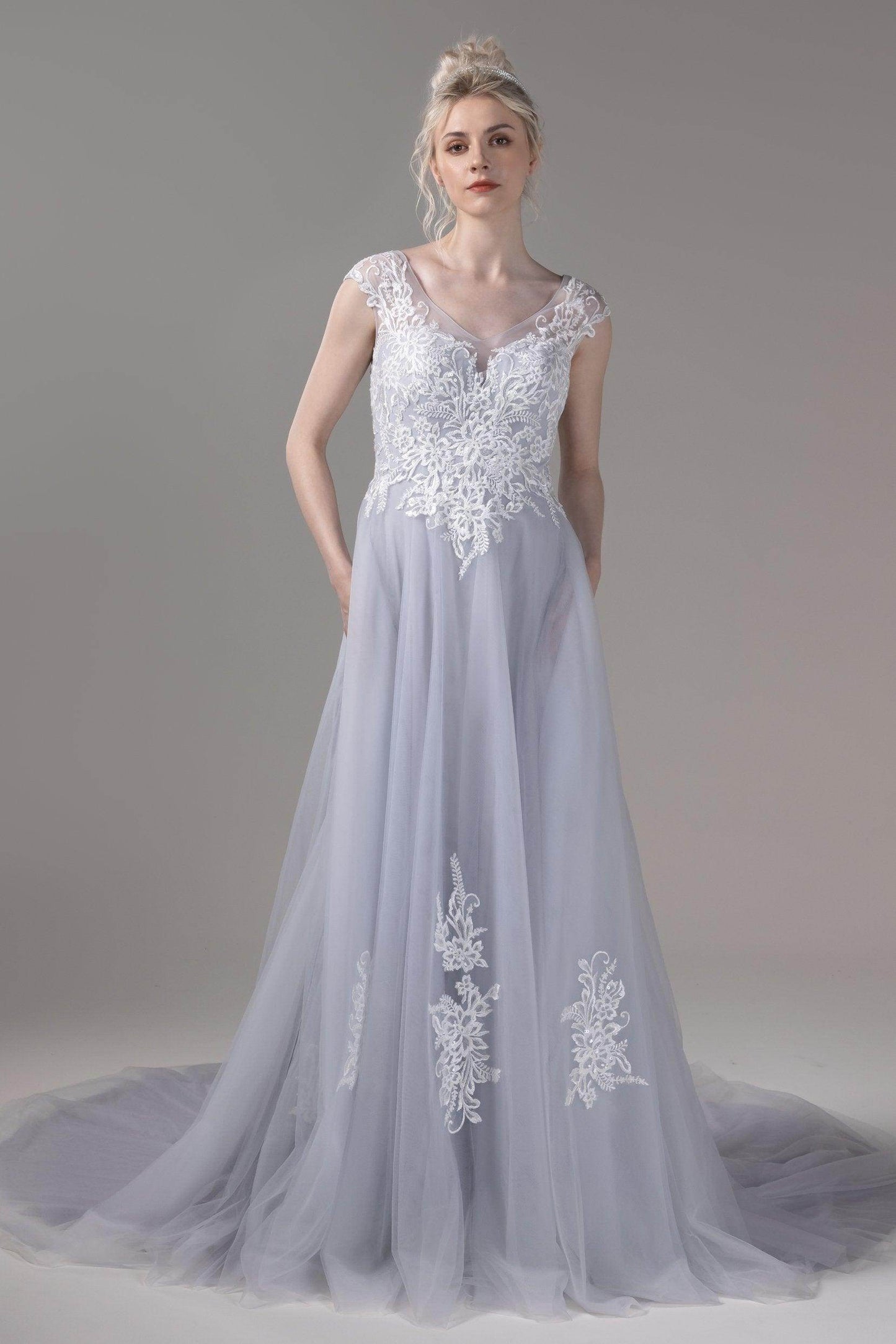 Introducing the GRACELYNN wedding dress: a breathtaking A-line design in Ivory/Silver Cloud. With a flattering V-neck, exquisite appliques, and convenient pockets, it's perfect for beach, garden, or hotel weddings. Customizable to fit every bride's dream!