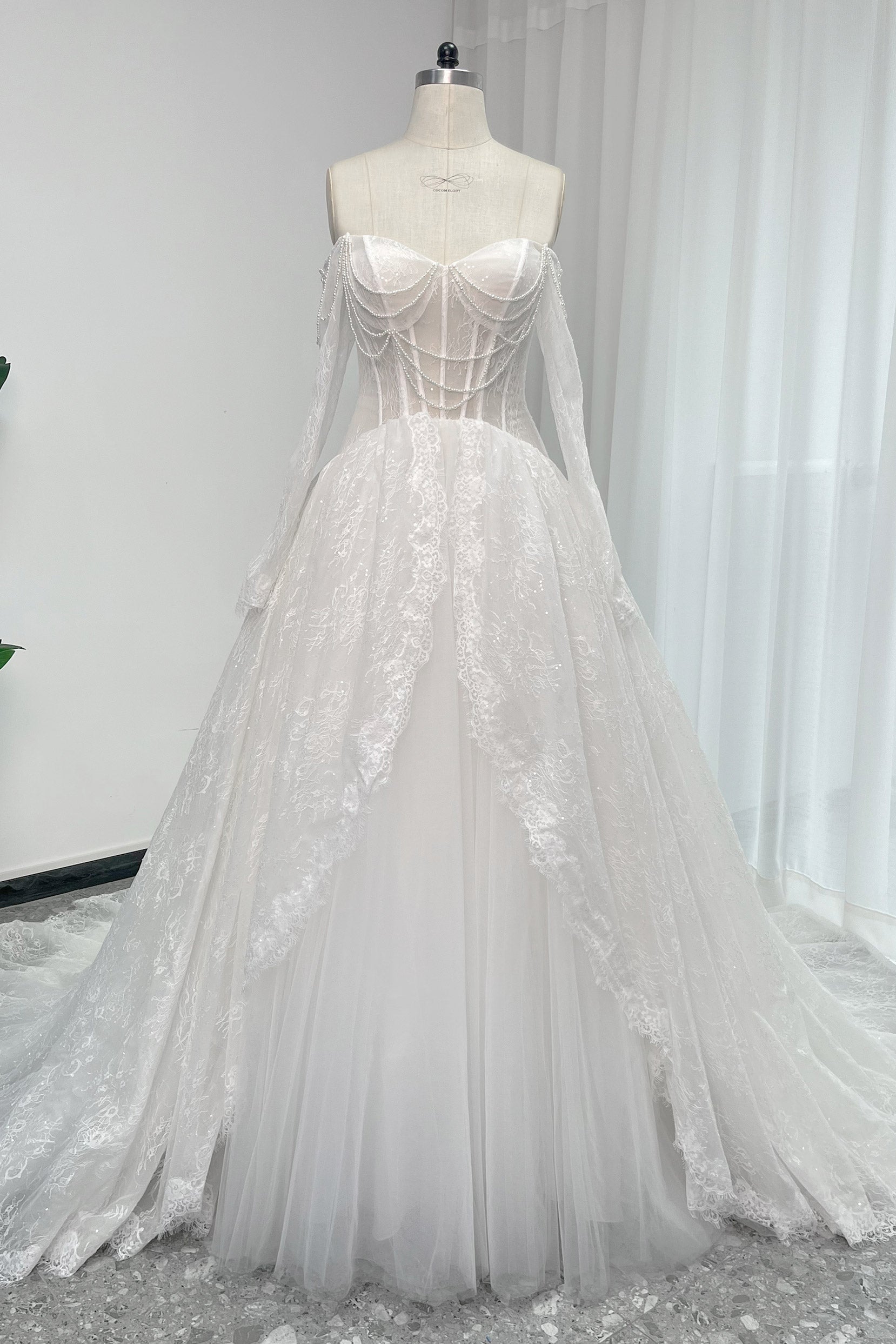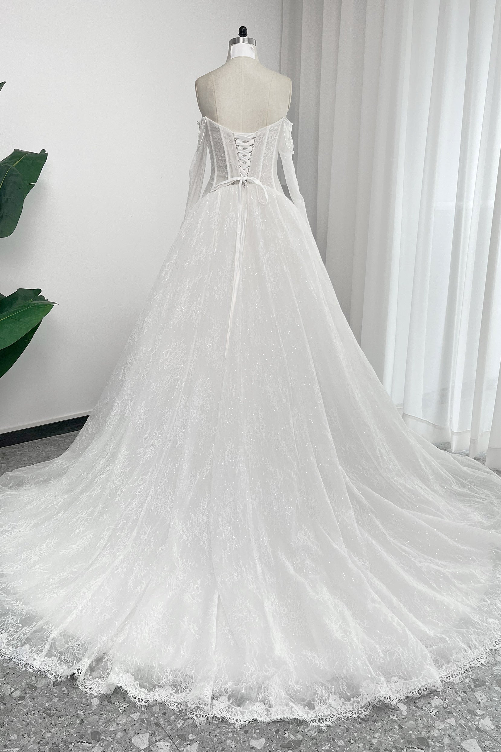 A-Line Chapel Train Sequined Lace Tulle Wedding Dress CW3351