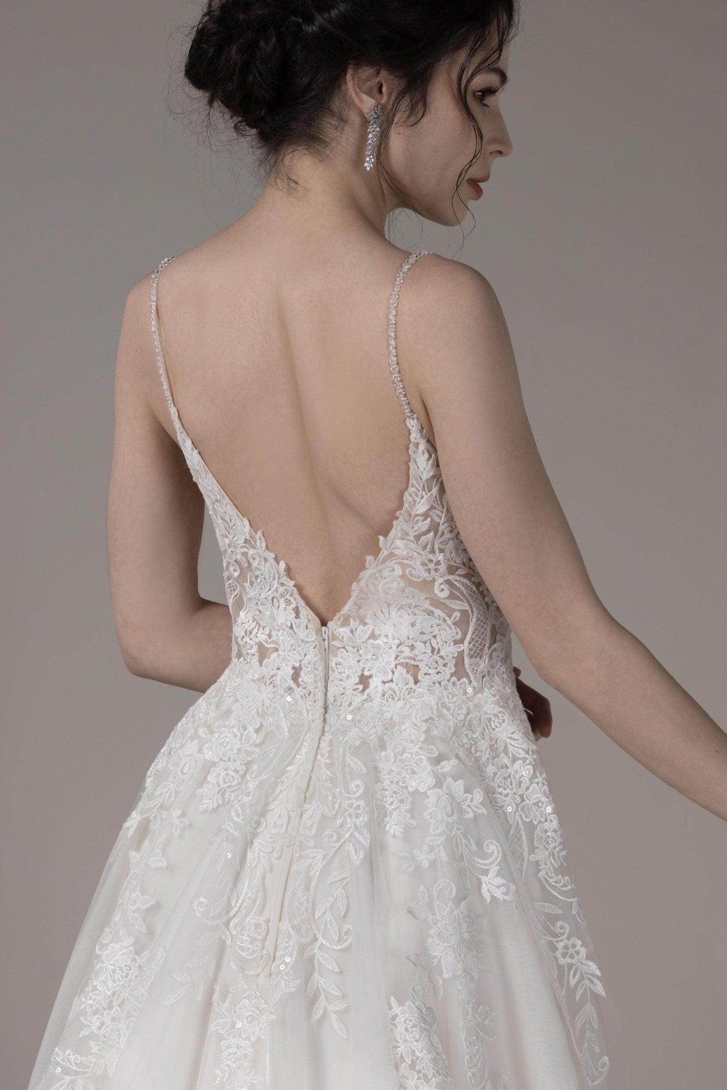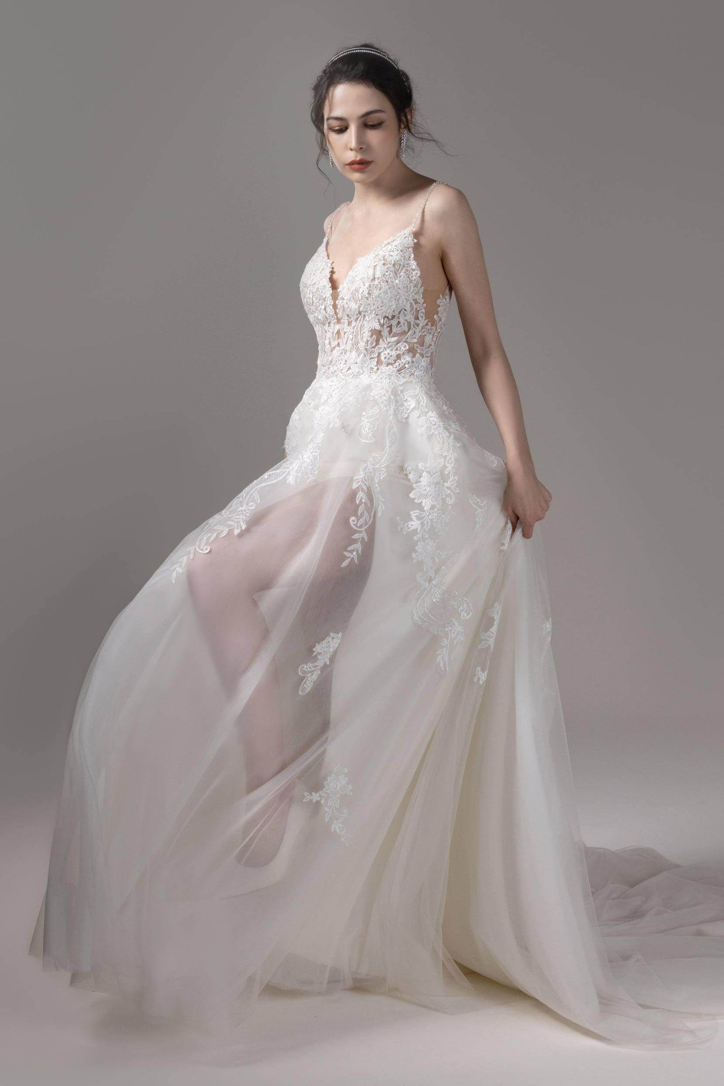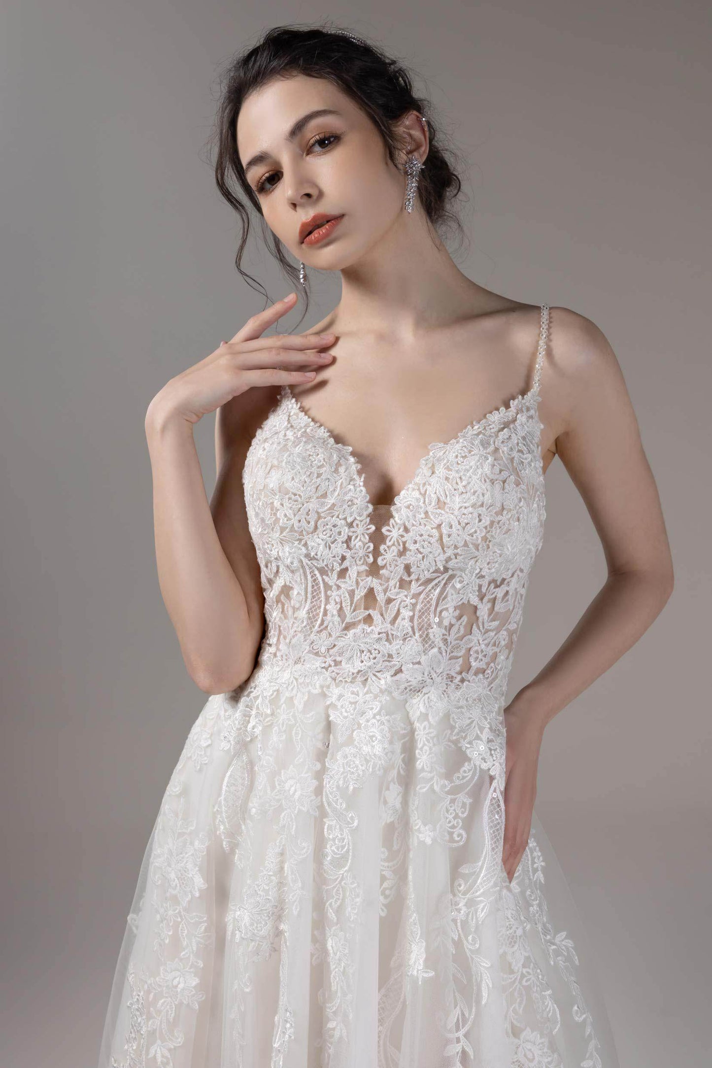 Introducing the ADDILYN wedding dress: an elegant A-line design in Ivory/Champagne. With a flattering V-neck, delicate appliques, and sparkling beading, it's perfect for garden or outdoor weddings. Customizable to bring your bridal vision to life!