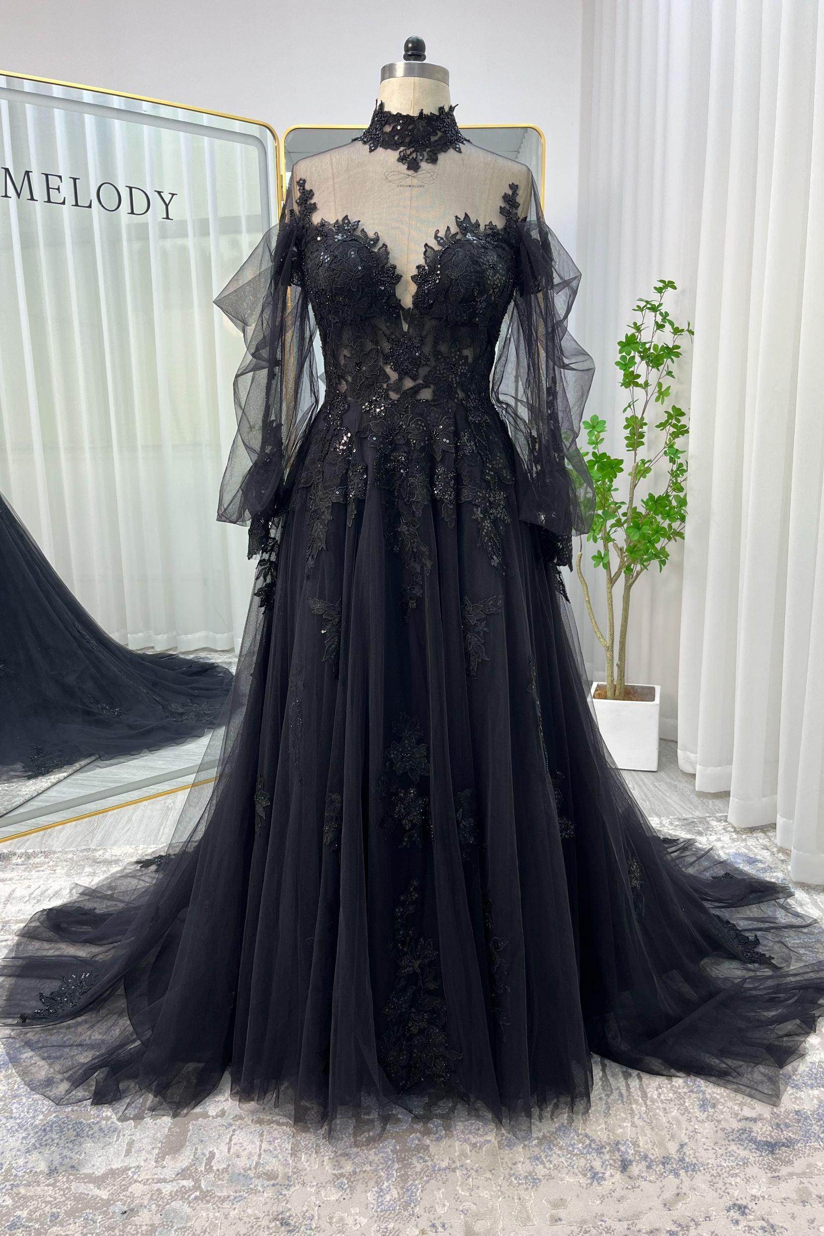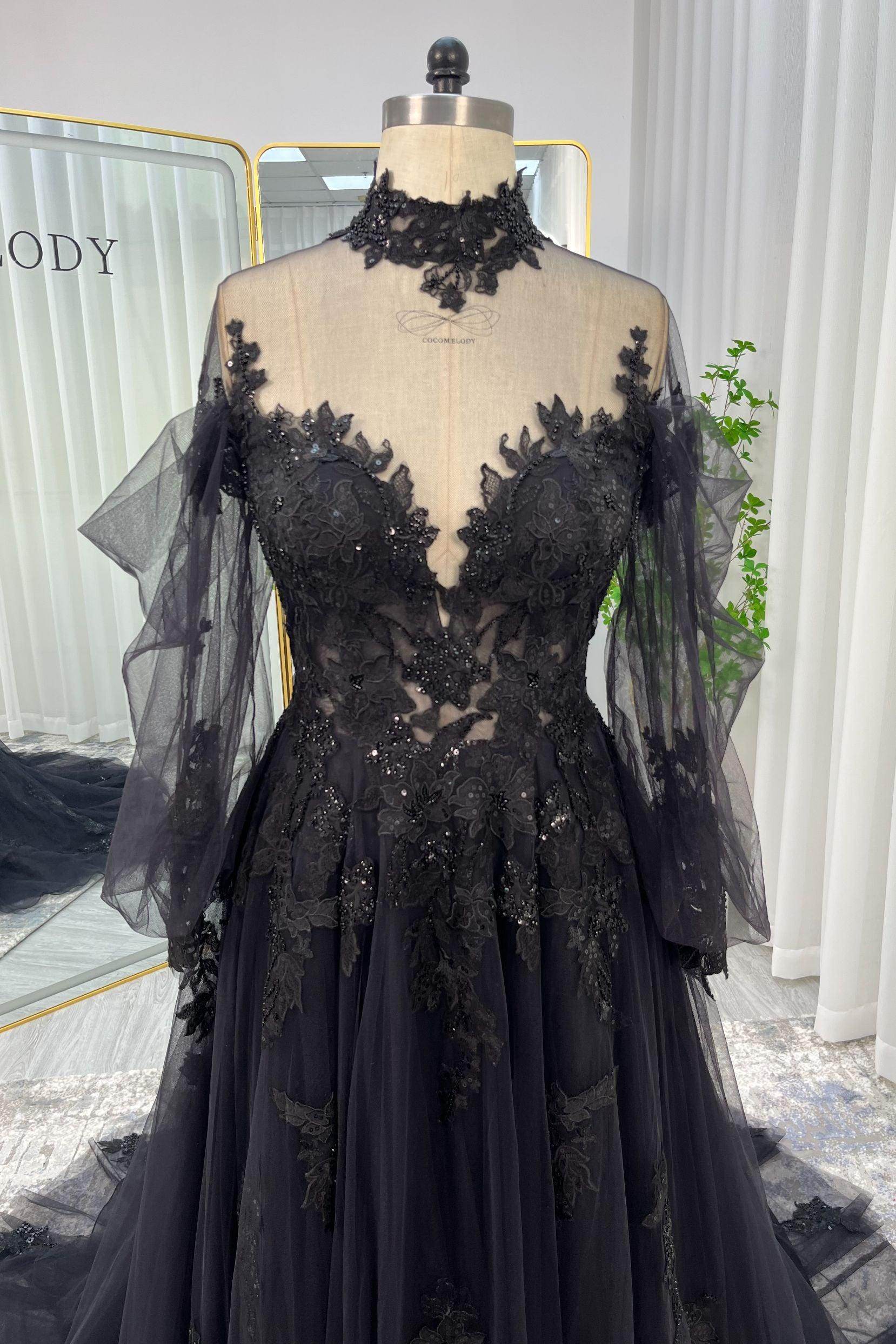 A-Line High Neck Court Train Lace Tulle Wedding Dress COCOMELODY CW3156 Skip to content
