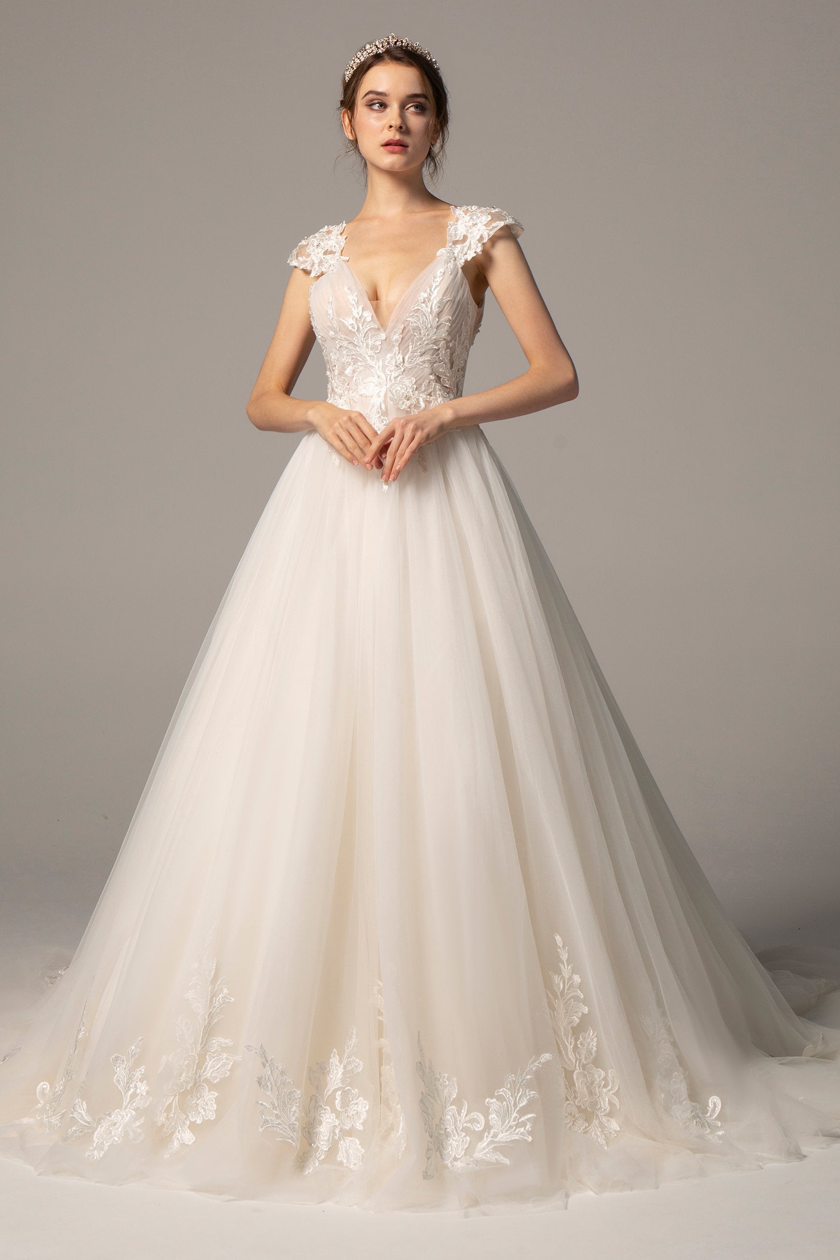 Introducing the exquisite OLIVE wedding dress, a perfect blend of elegance and charm. With its stunning A-line silhouette, delicate appliques, and flattering V-neck, this dress is ideal for hotel, church, garden, and hall weddings. Available in all sizes for the radiant bride!