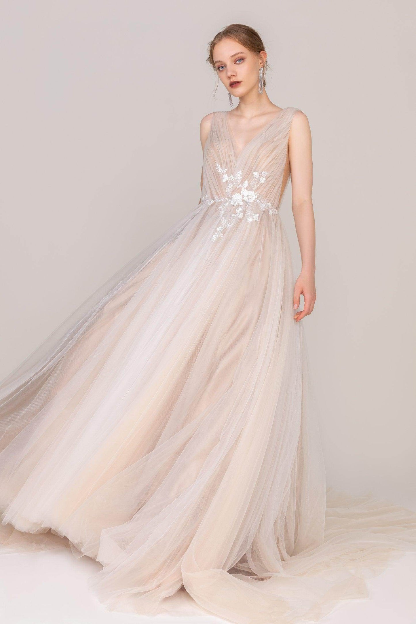 Introducing the "Carolina" wedding dress—an elegant A-line gown with delicate appliques and a graceful V-neck. Its long sleeves and court train add timeless charm. Perfect for hotel, church, garden, or hall weddings, this stunning dress exudes effortless sophistication.