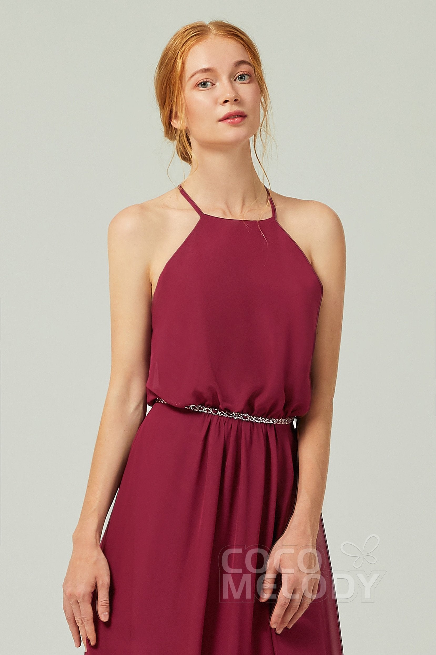 This stunning bridesmaid gown showcases elegance with its flowing chiffon fabric, cascading to the floor in a graceful A-line silhouette. The halter neckline beautifully frames the shoulders, while delicate beading and sashes add a touch of glamour. Perfect for any formal occasion, this dress ensures you’ll shine!