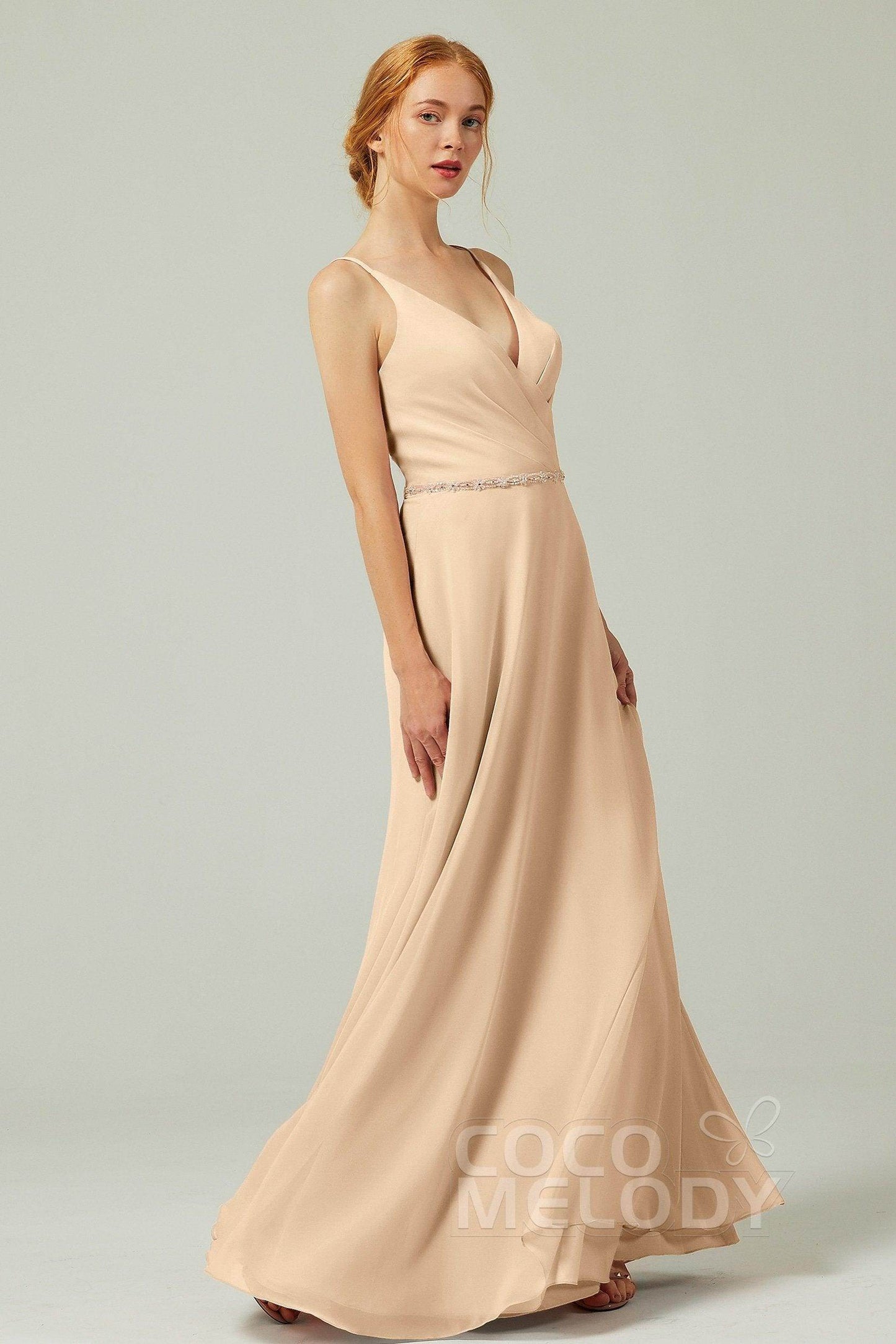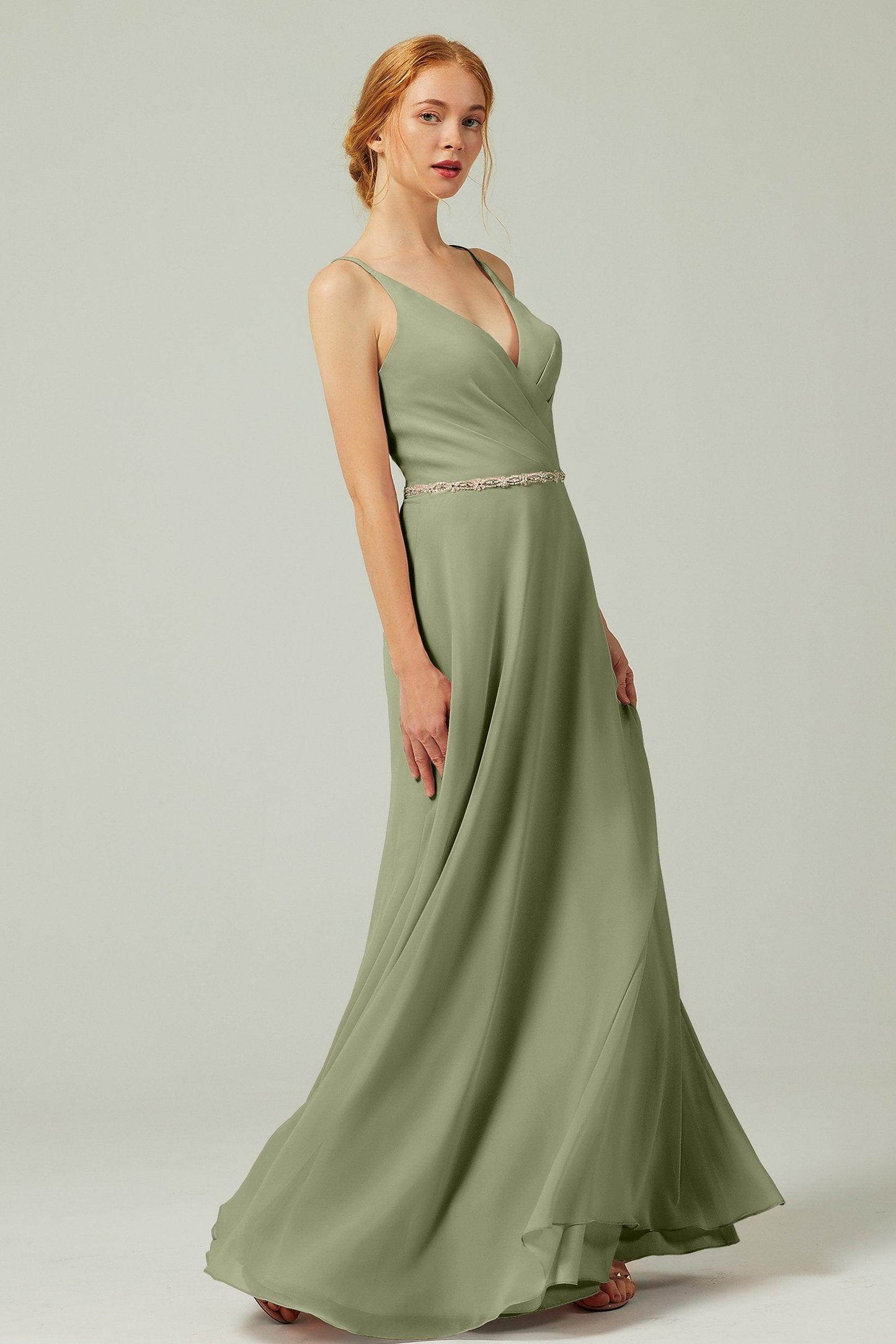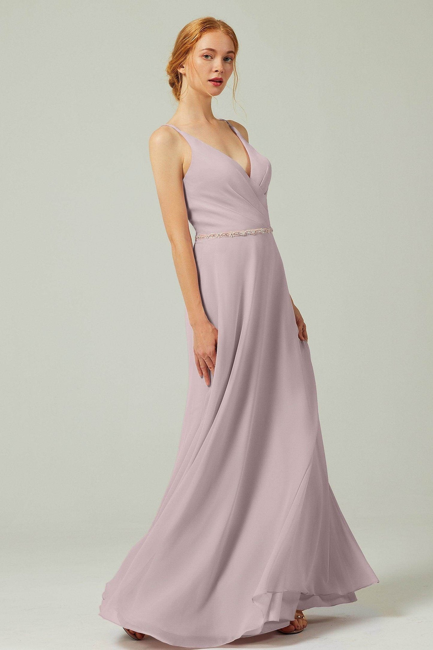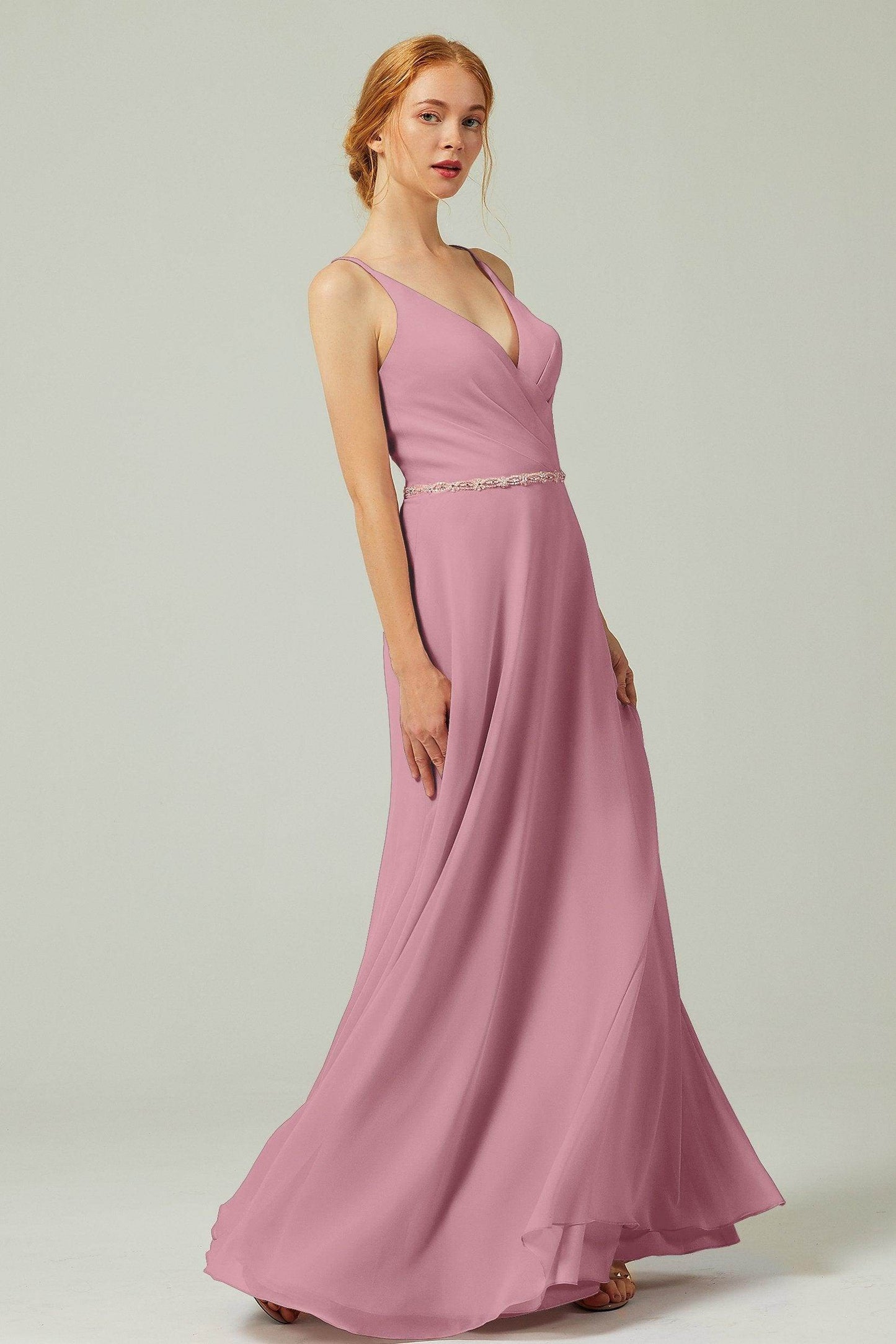 This elegant bridesmaid dress features a back zipper and flowing chiffon fabric that drapes beautifully to the floor. The V-neckline and sleeveless design enhance grace, while pleating, beading, and sashes add luxurious detail, perfect for any special occasion.