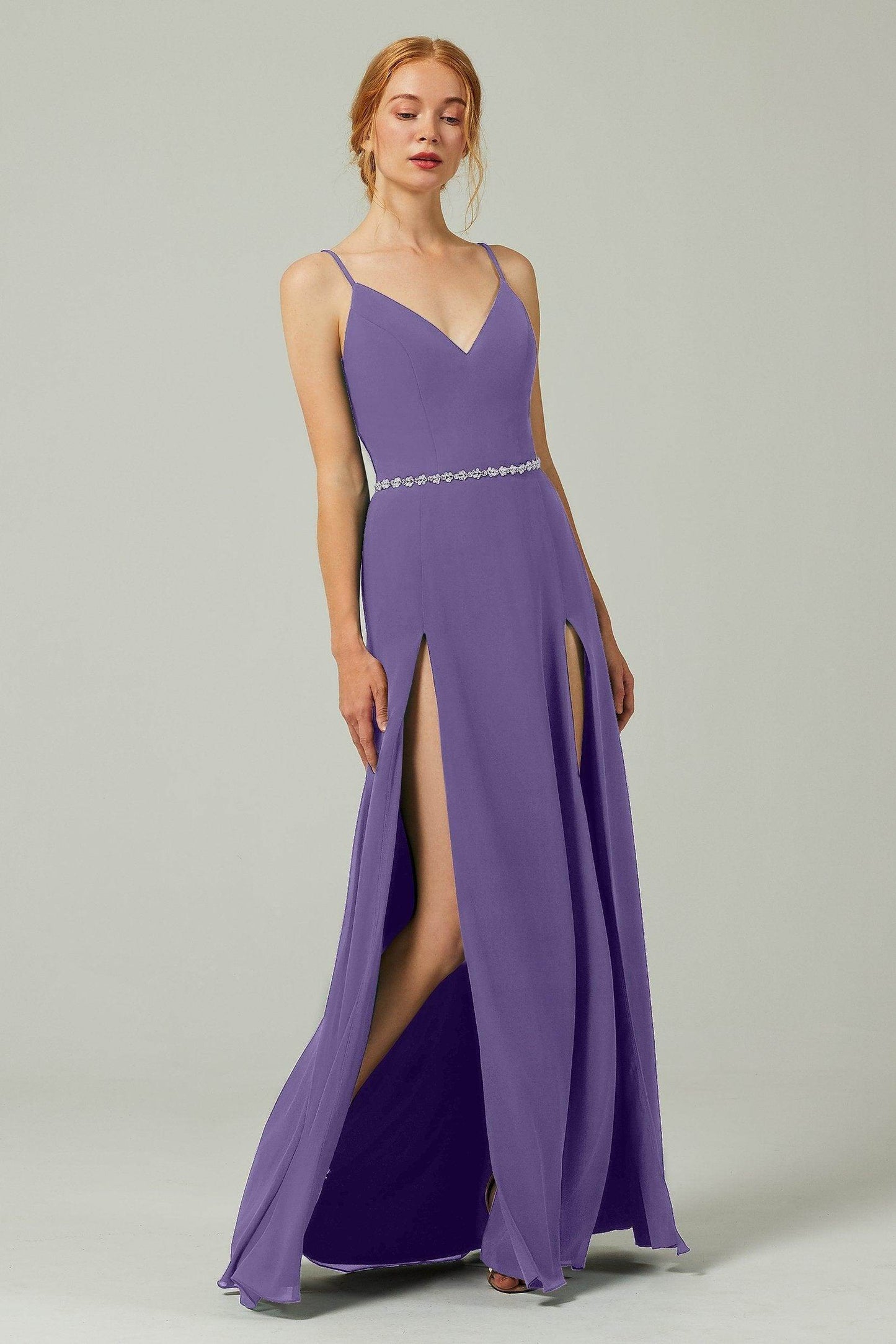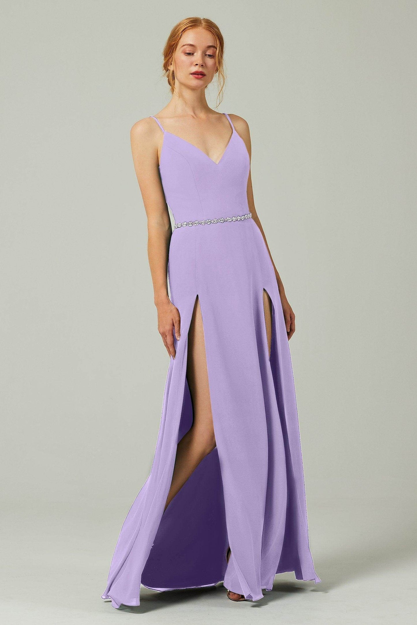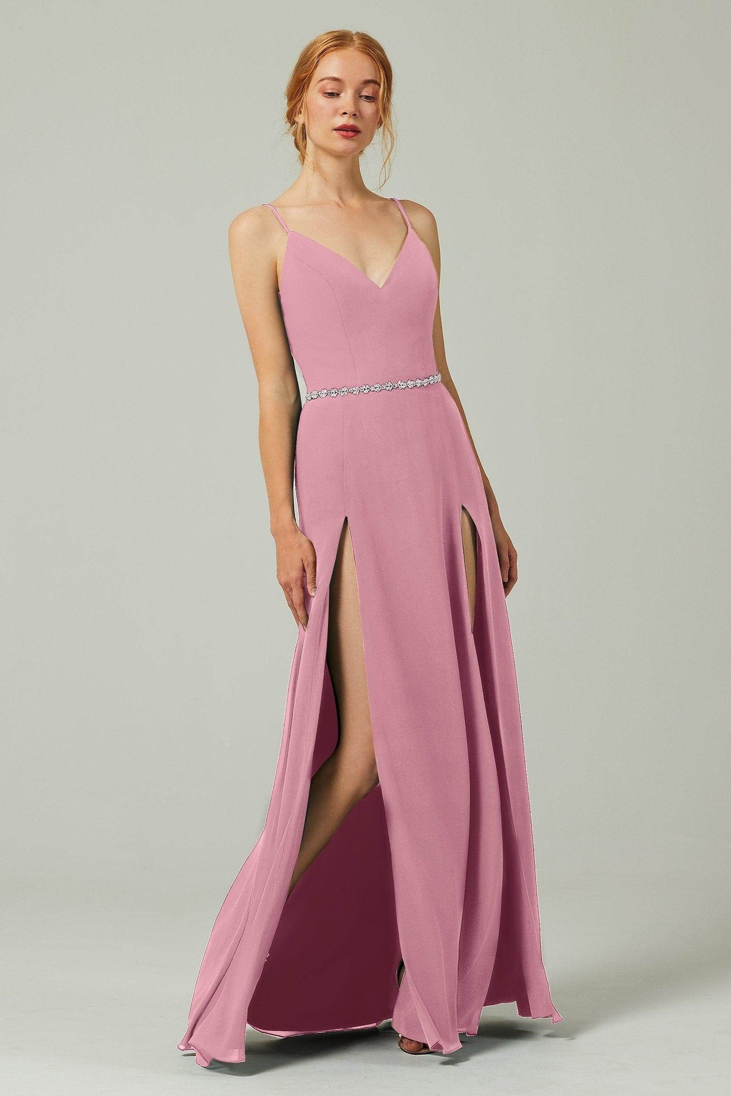 This enchanting bridesmaid gown features lightweight chiffon that flows elegantly to the floor in a stunning A-line silhouette. Delicate spaghetti straps and a hidden zipper ensure comfort, while exquisite beading, sashes, and a side split add a touch of glamour, making it perfect for any formal occasion!