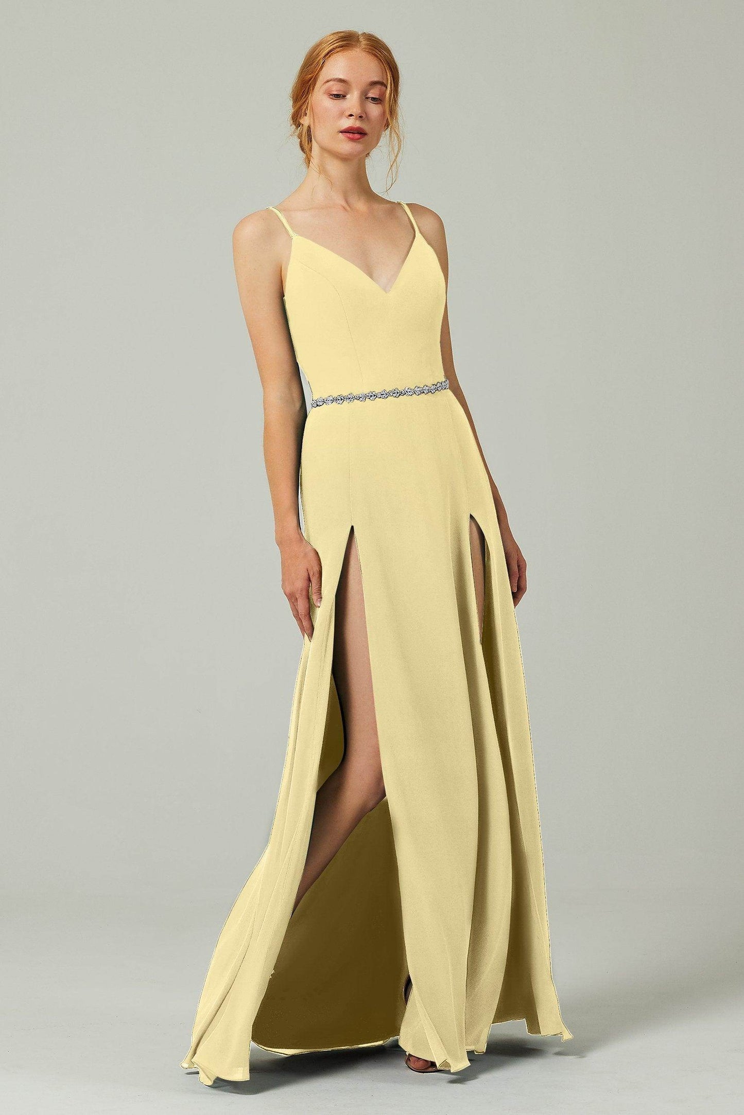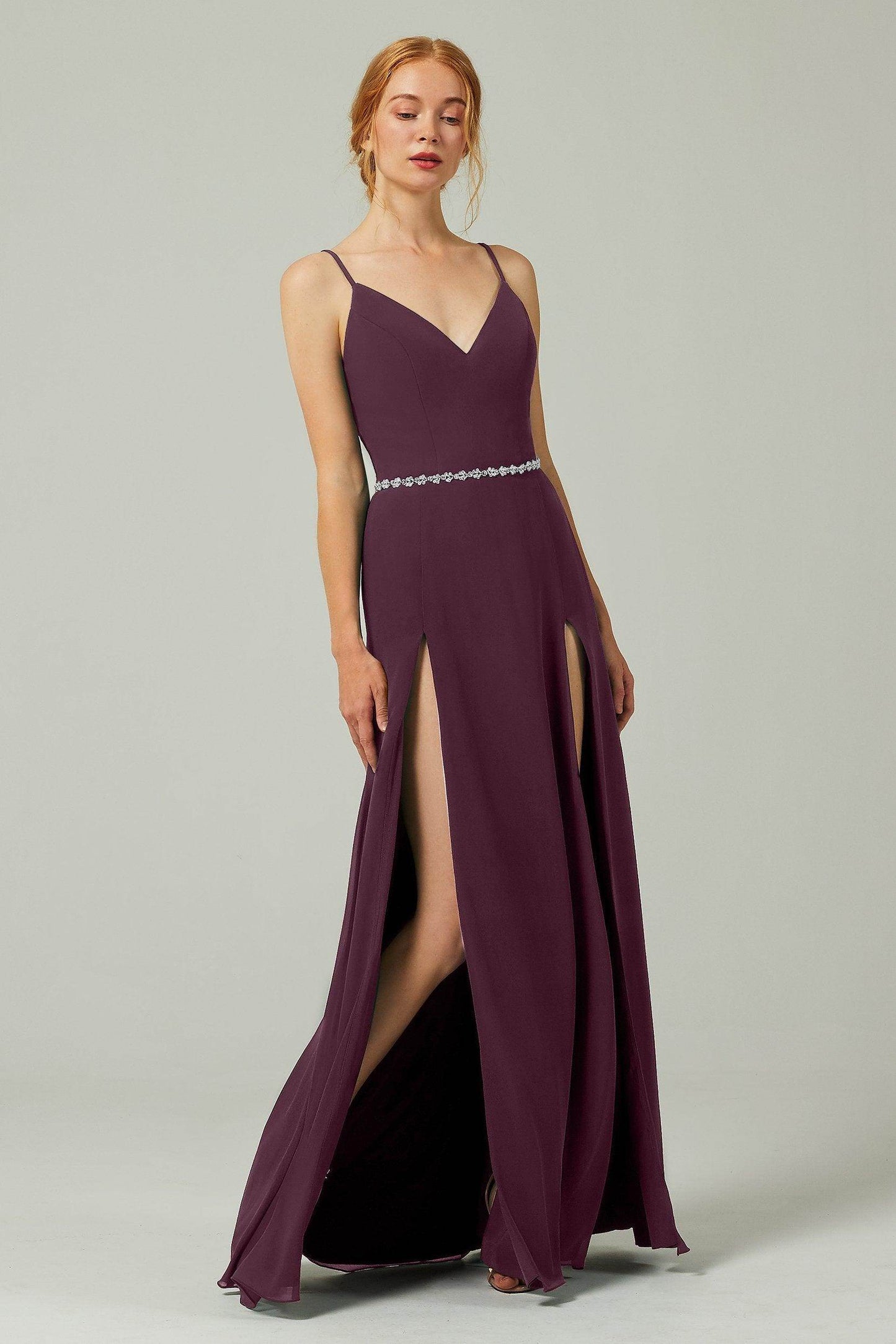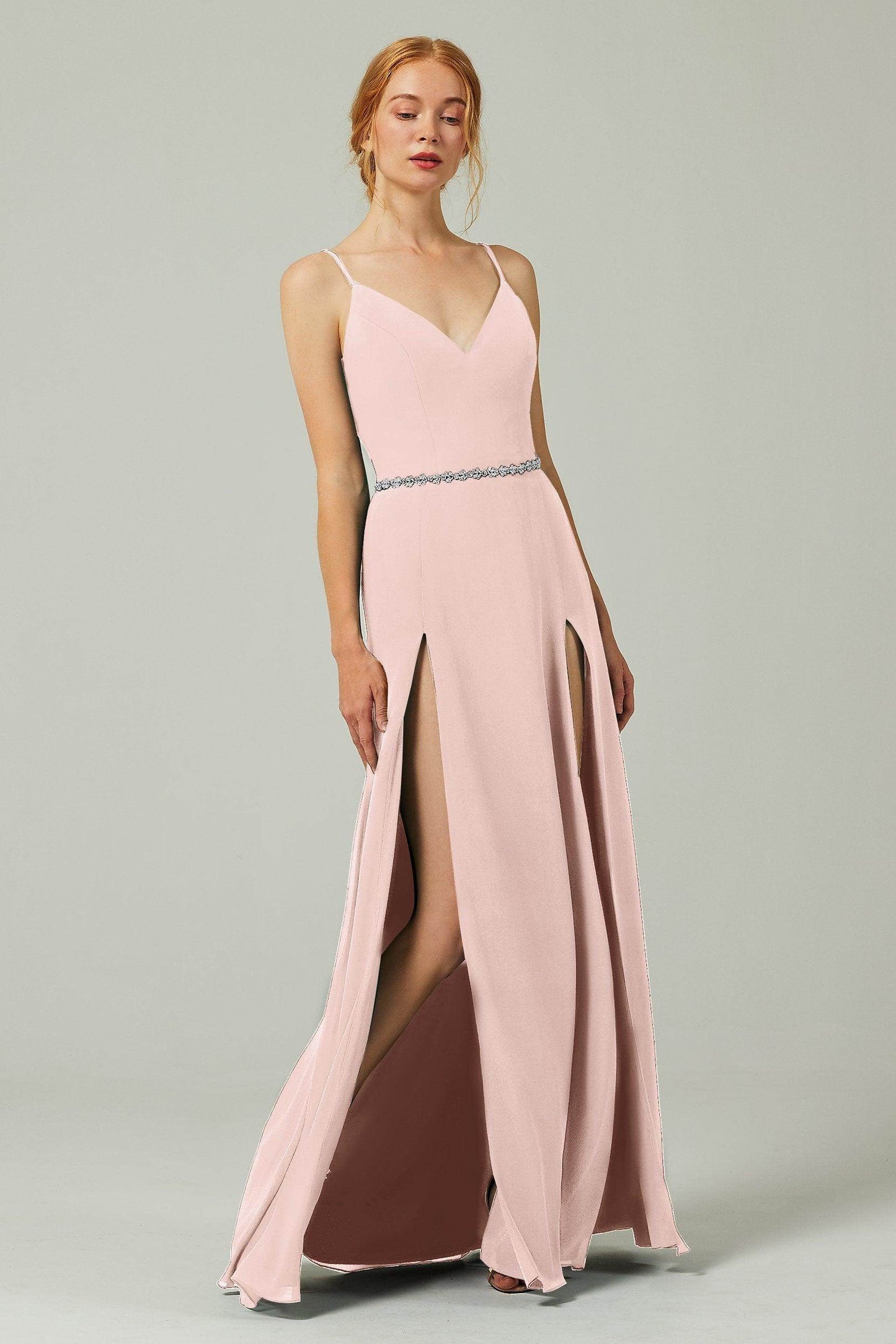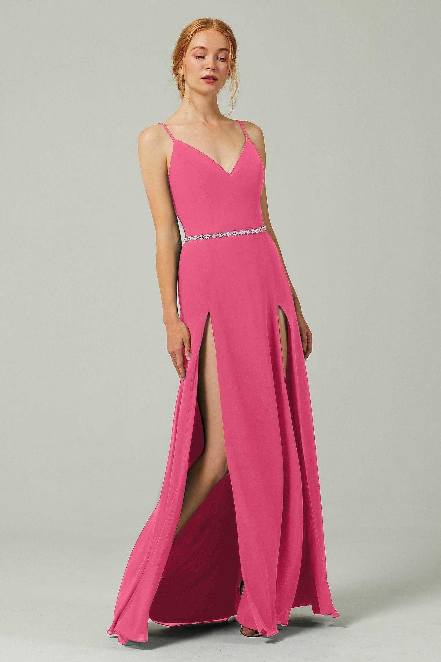 This enchanting bridesmaid gown features lightweight chiffon that flows elegantly to the floor in a stunning A-line silhouette. Delicate spaghetti straps and a hidden zipper ensure comfort, while exquisite beading, sashes, and a side split add a touch of glamour, making it perfect for any formal occasion!