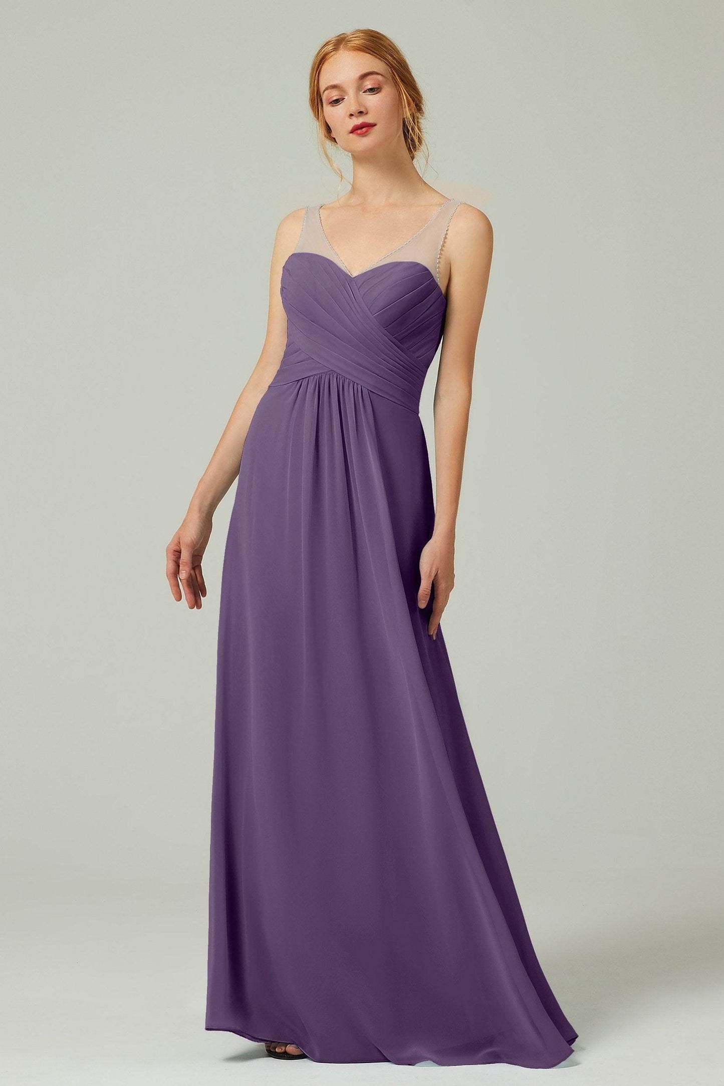 This stunning bridesmaid gown features lightweight chiffon that gracefully flows to the floor in a flattering A-line silhouette. The deep V-neckline adds allure, while delicate pleating and beading enhance its elegance. Perfect for any formal occasion, this dress ensures you shine with confidence!
