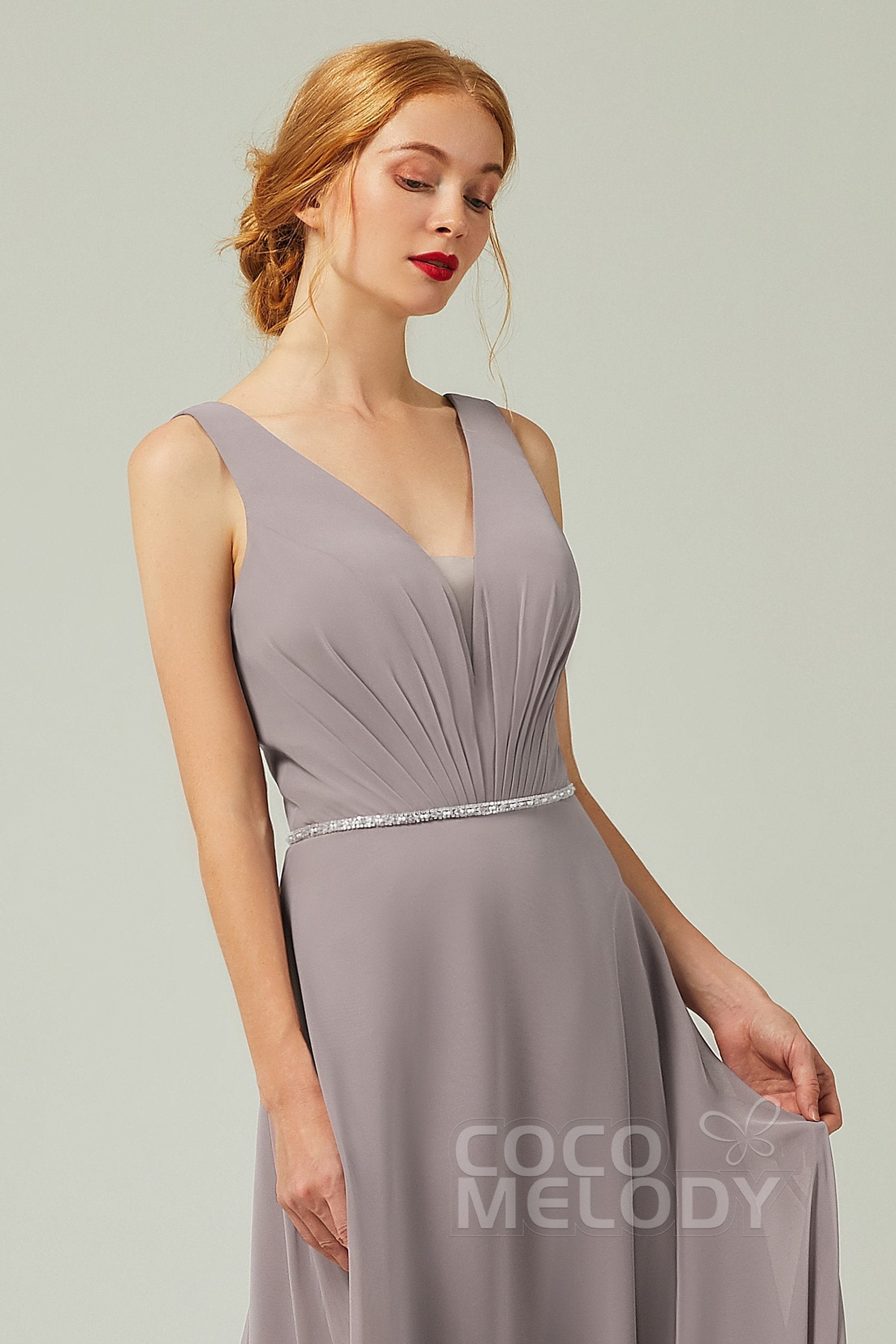 This enchanting bridesmaid dress features lightweight chiffon in a graceful A-line silhouette. The V-neckline and sleeveless design enhance elegance, while delicate pleating, beading, and sashes add a touch of luxury. Perfect for a memorable celebration!