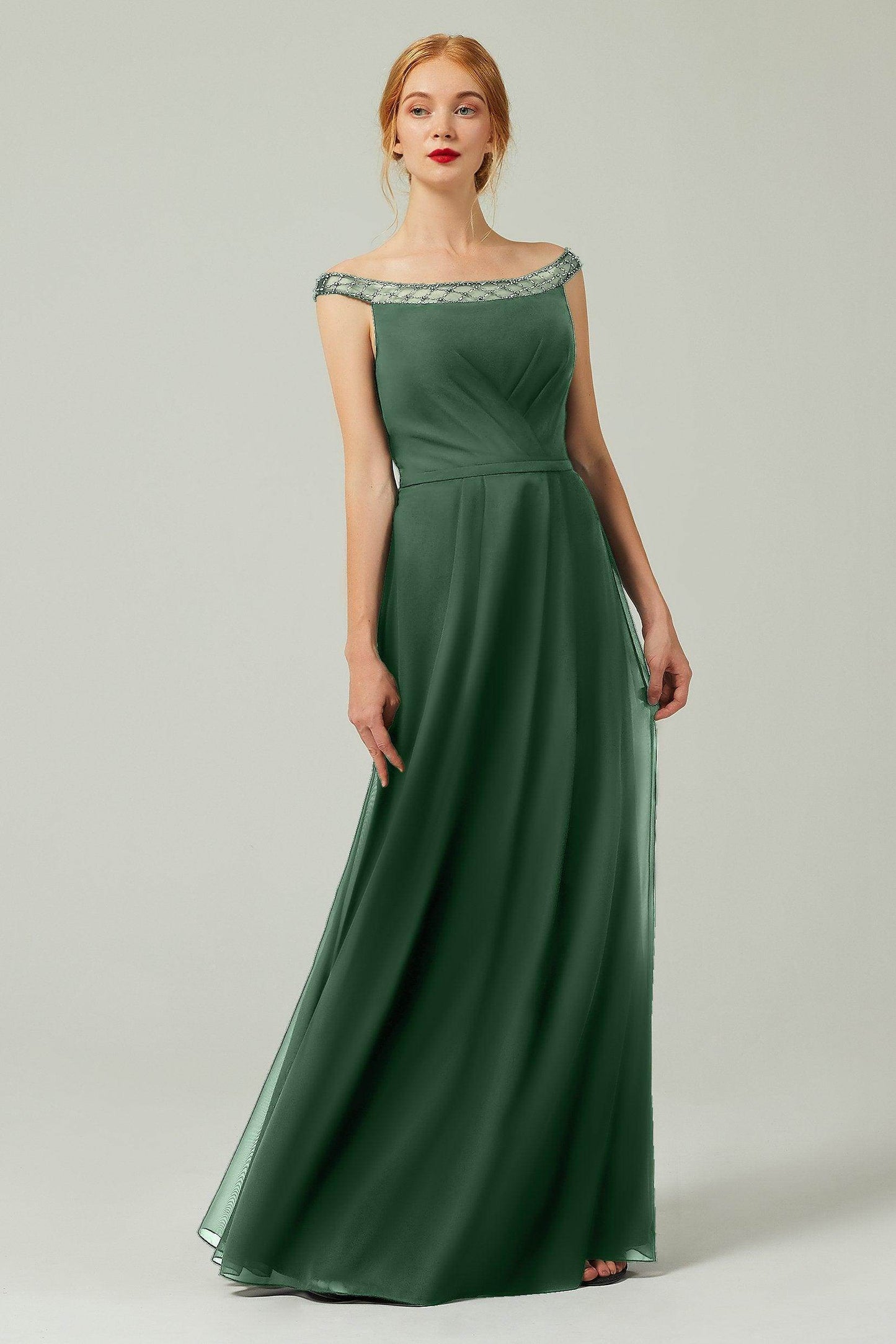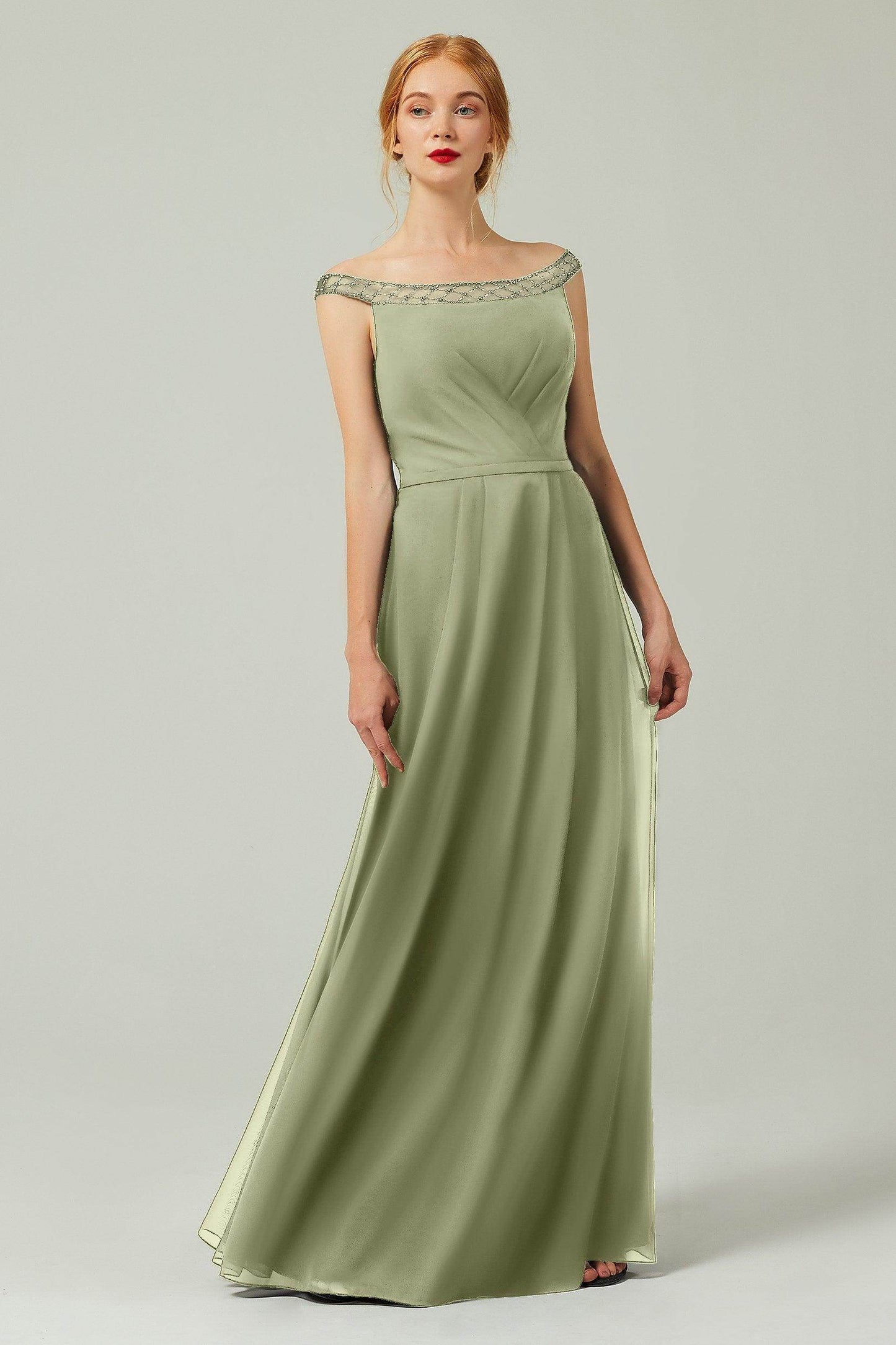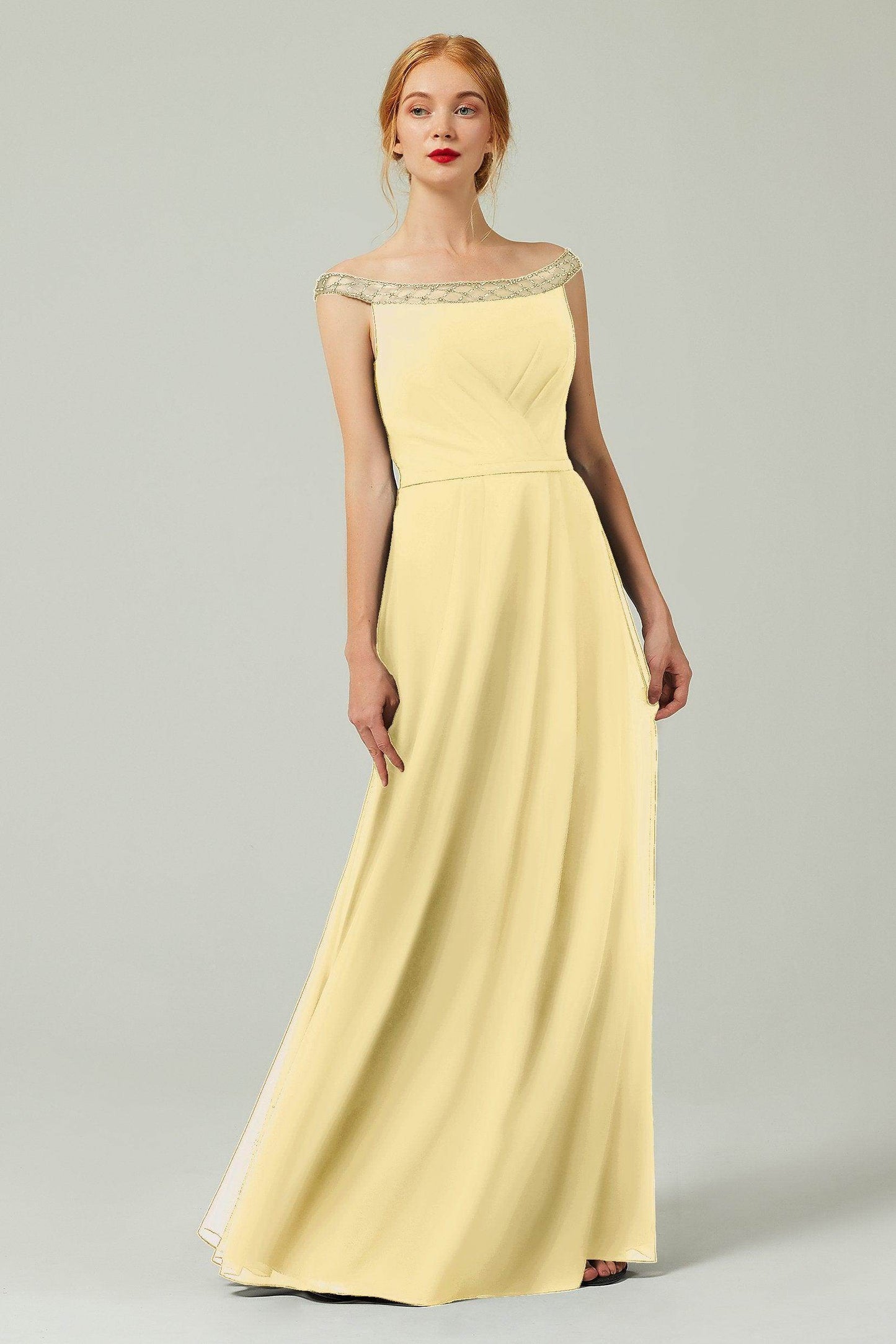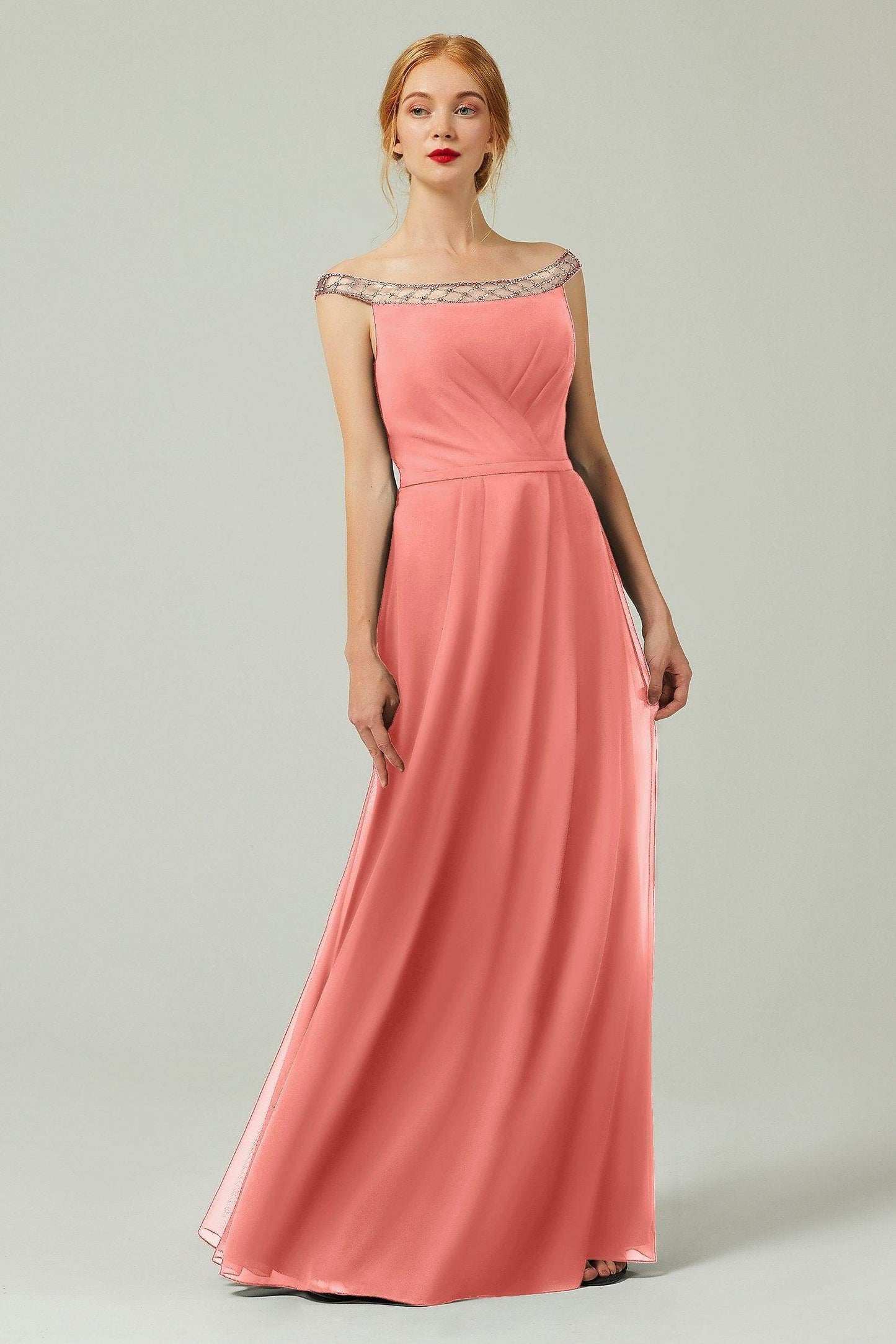 This elegant bridesmaid dress is crafted from lightweight chiffon in a stunning A-line silhouette. The bateau neckline beautifully frames the shoulders, while intricate pleating, shimmering beading, and a stylish sash add sophistication, completed with a zipper and button closure for a refined finish.