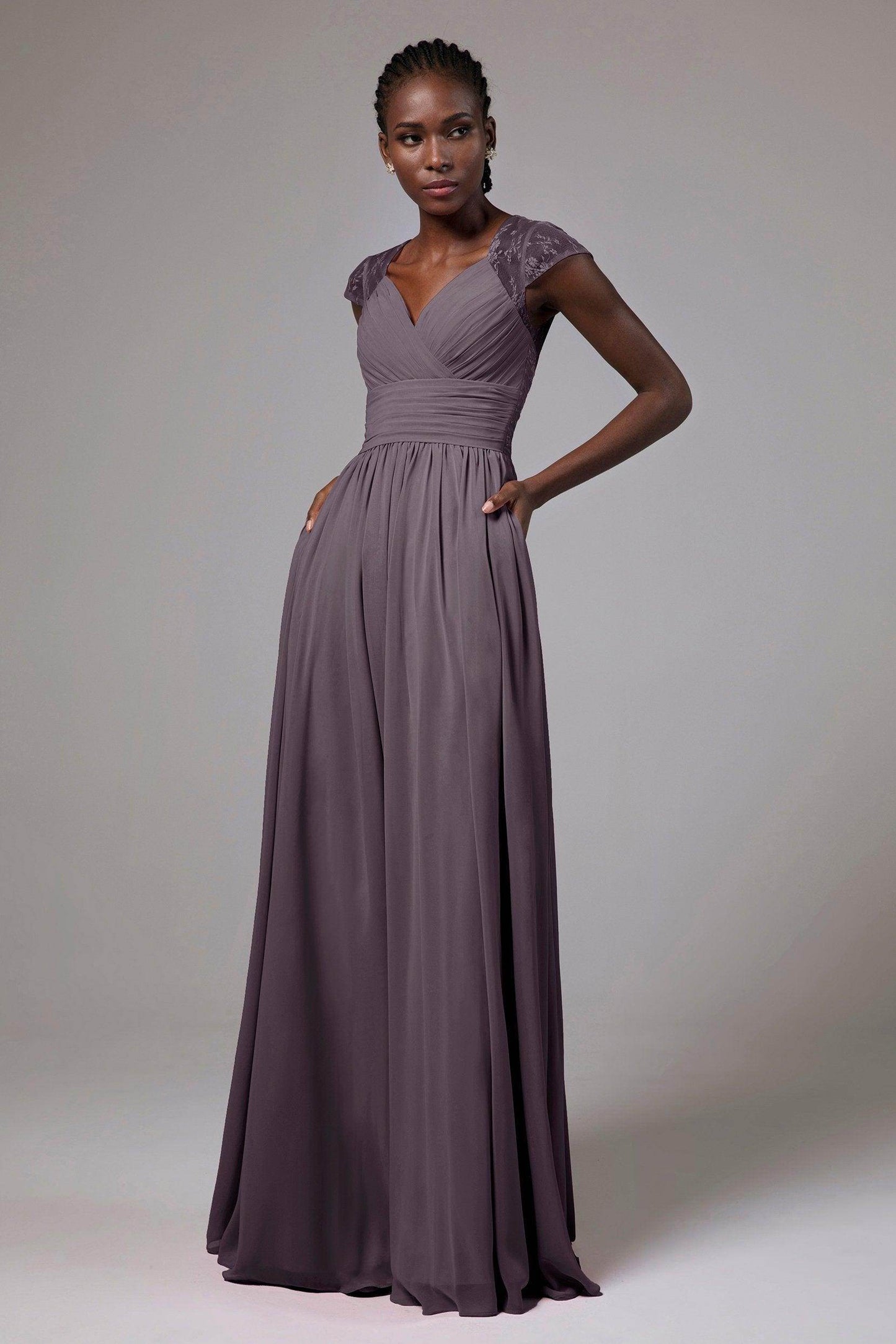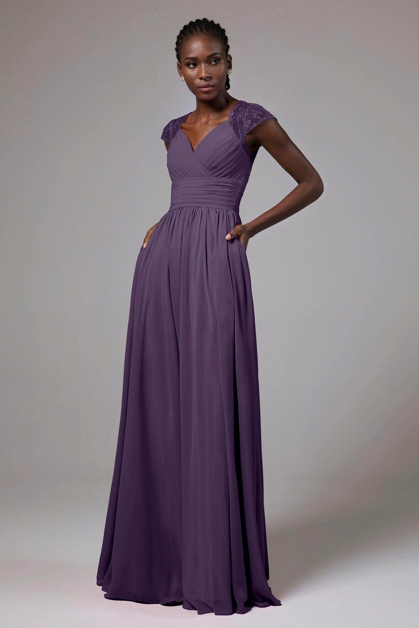This bridesmaid dress combines elegance and charm with a keyhole back, flowing chiffon, and a V-neckline. The floor-length A-line skirt, short sleeves, pleats, and pockets add unique details and practicality, making it perfect for any formal occasion.