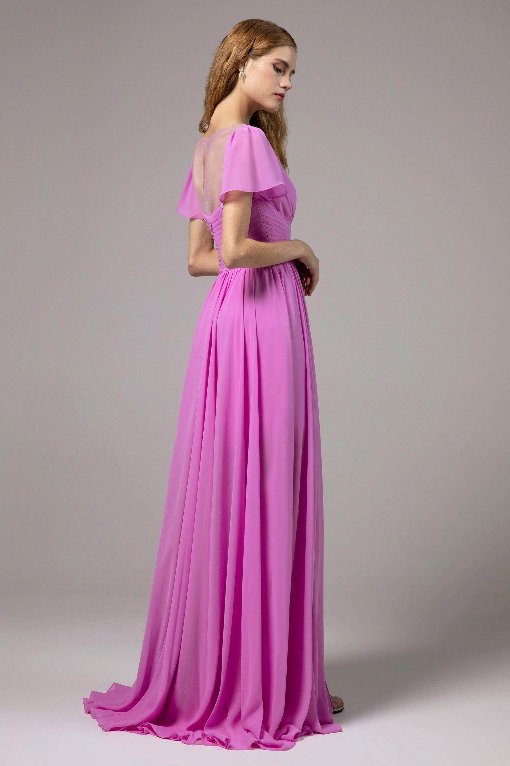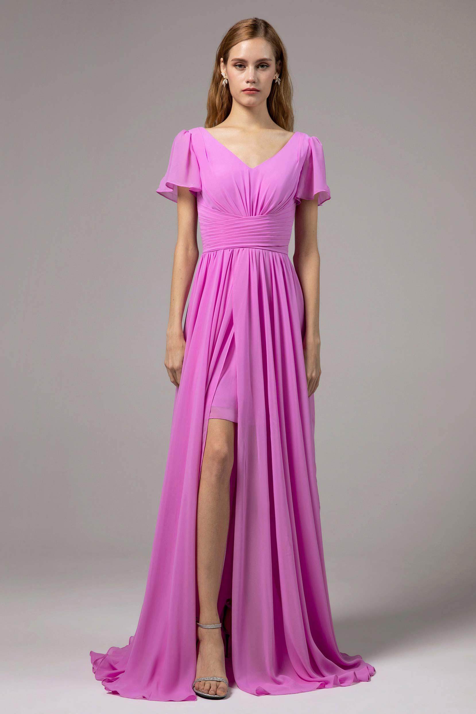 This bridesmaid dress blends elegance and modern style with a zipper back, flowing chiffon, a V-neckline, and a floor-length A-line skirt. Short sleeves highlight the shoulders, while pleats and a chic slit add unique details, making it ideal for any formal event.