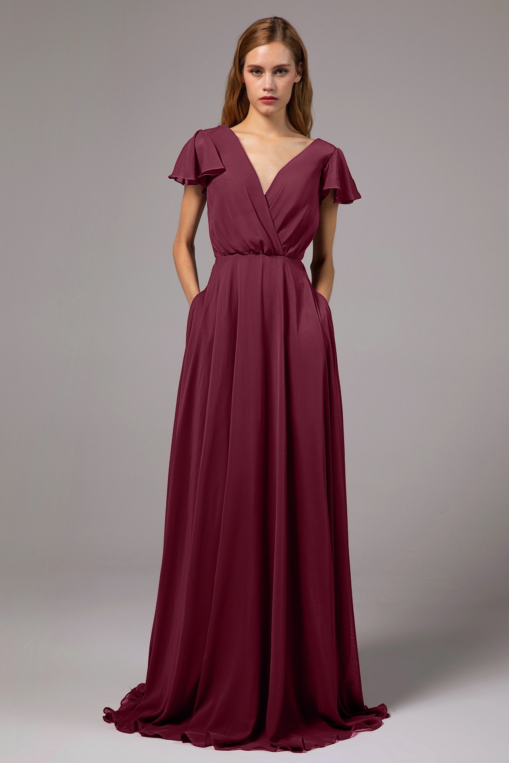 This chiffon bridesmaid dress combines elegance with practicality. A back zipper, flowy chiffon, and A-line skirt offer ease and grace. The V-neck and winged sleeves enhance allure, while the natural waist add unique details and convenience, perfect for any formal event.