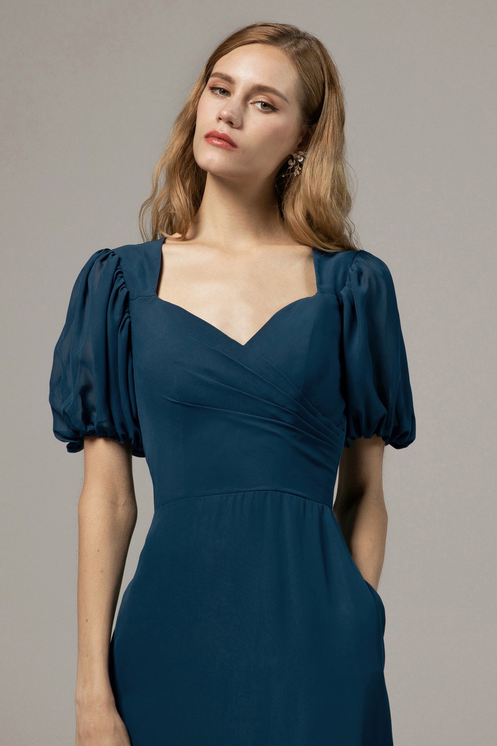 This bridesmaid dress combines elegance and practicality with a back zipper and lightweight chiffon. The floor-length A-line skirt, V-neck, and short sleeves offer graceful style, while the natural waist and split skirt with pockets add charm and convenience, perfect for any formal event.
