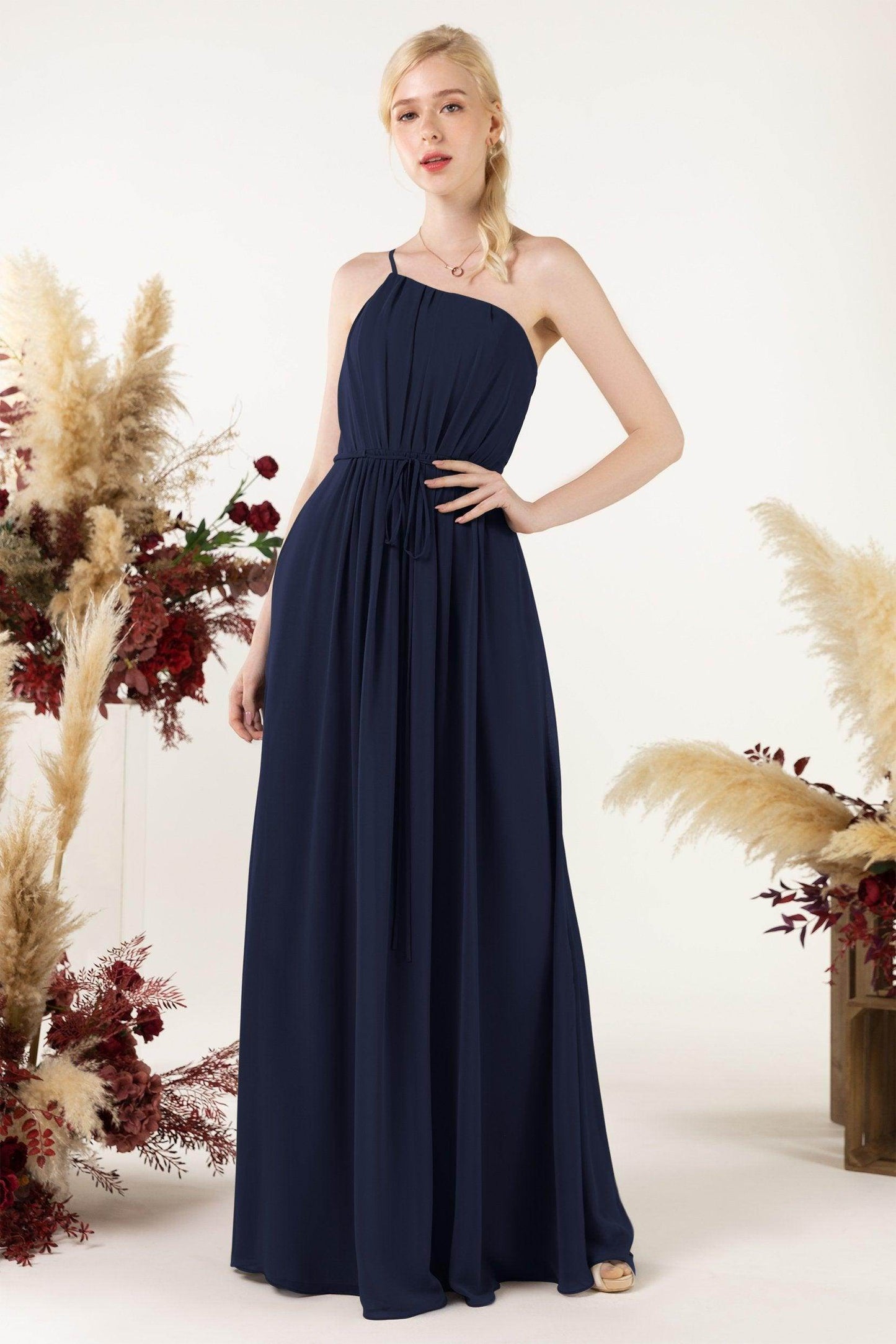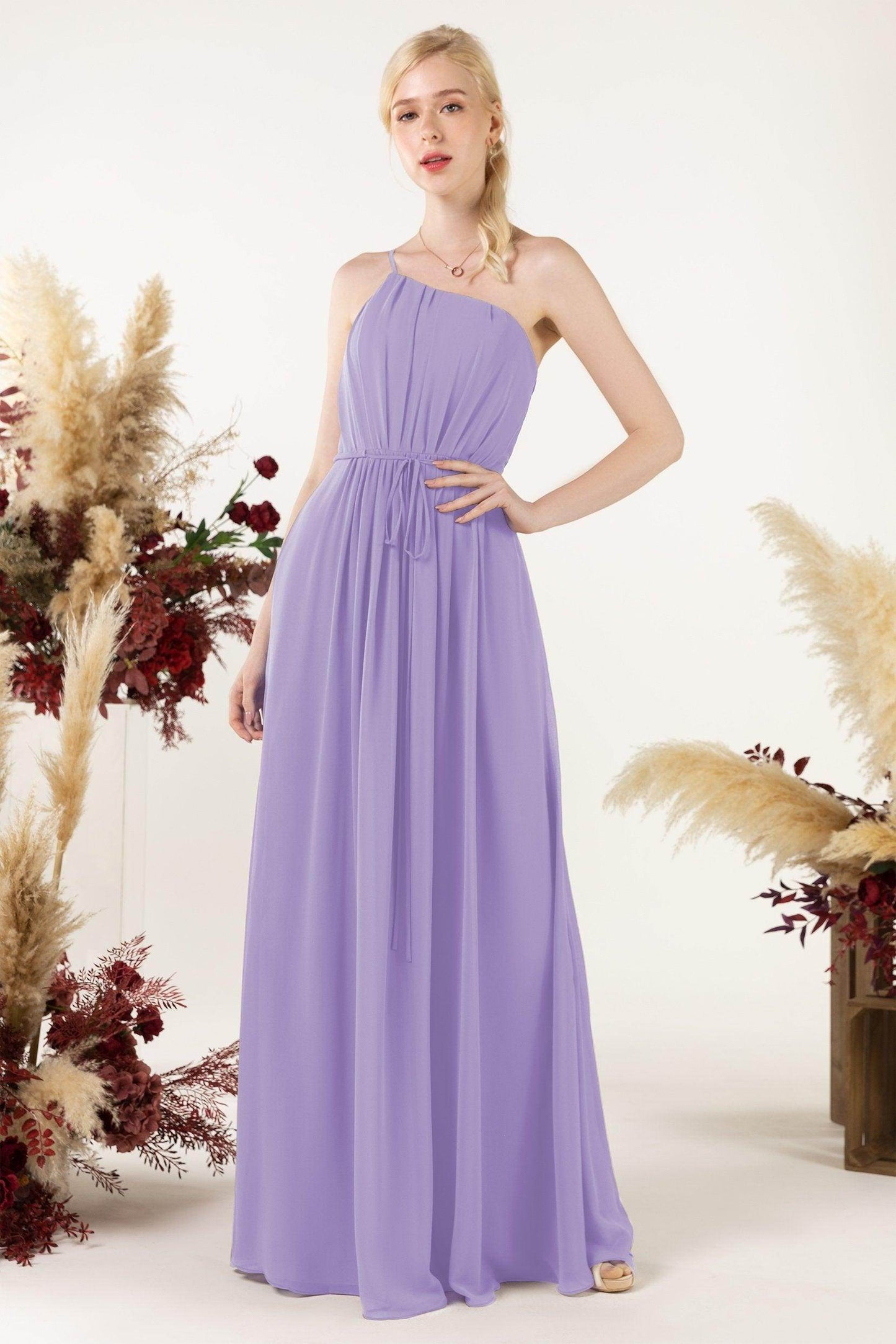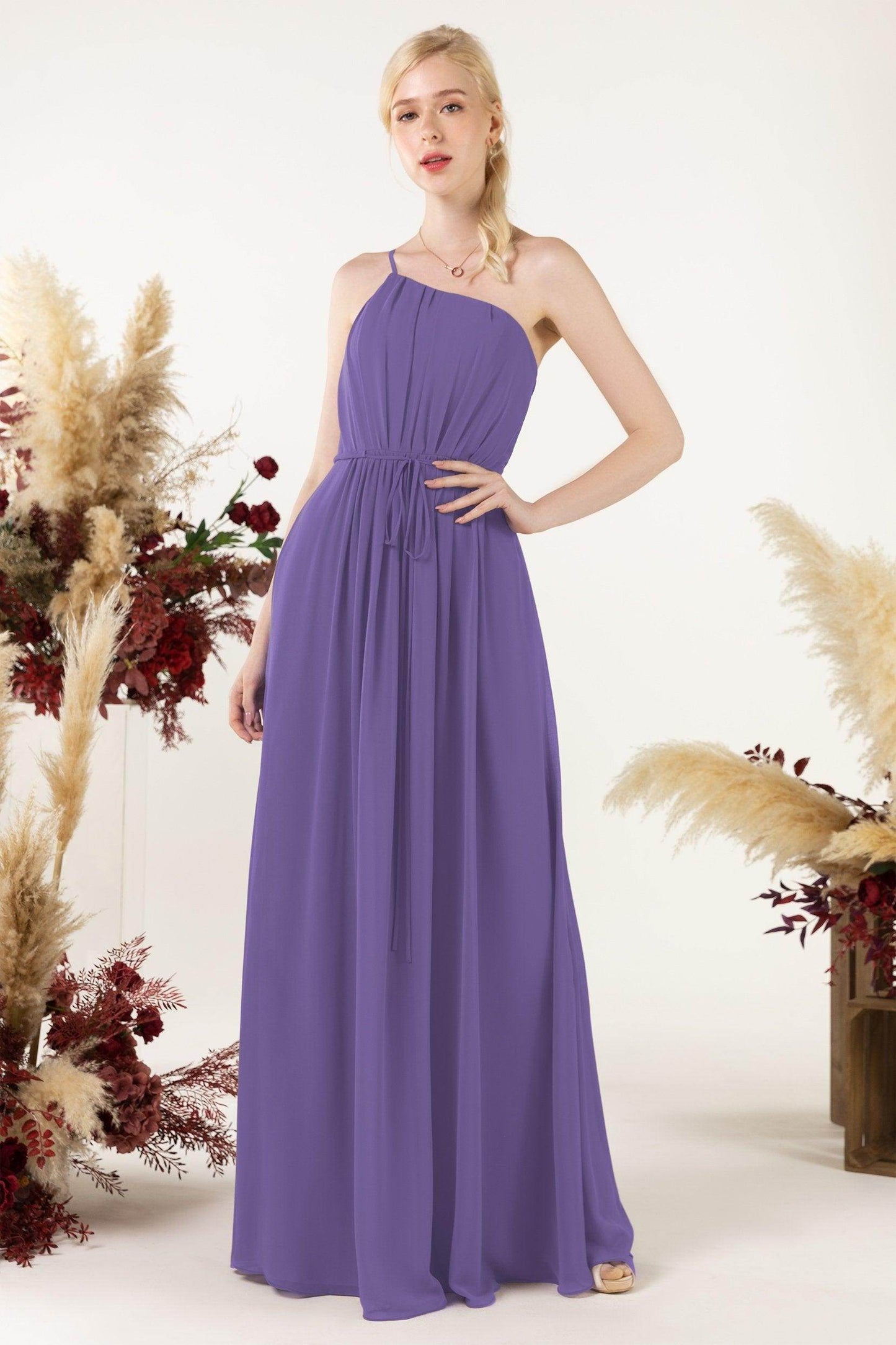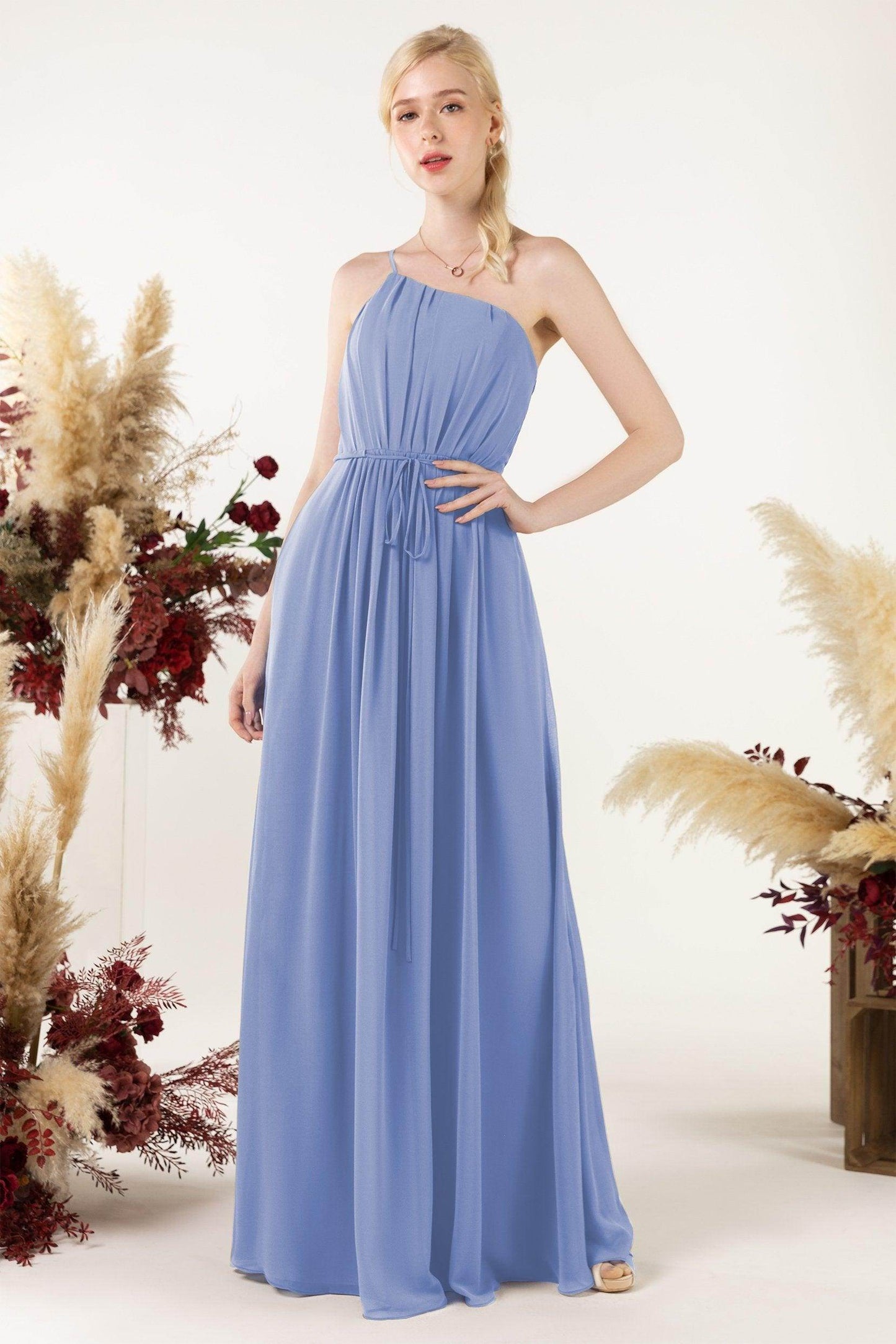 This bridesmaid dress combines elegance and practicality with its lightweight chiffon, one-shoulder design, and A-line silhouette. The flowing skirt, side split, sashes, and pockets add style and function, while the side zipper ensures a perfect fit.