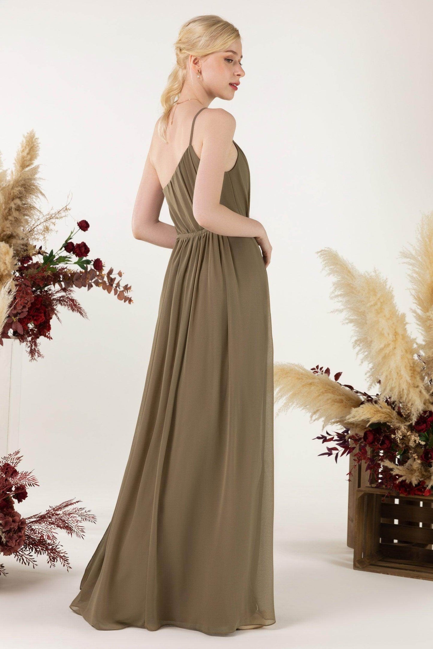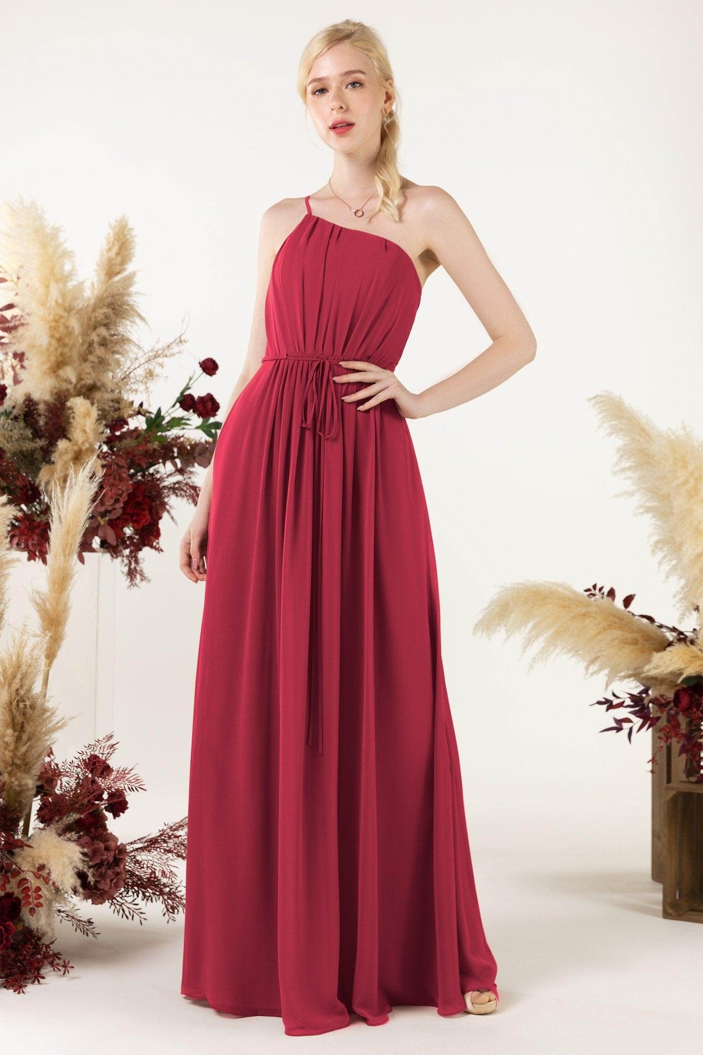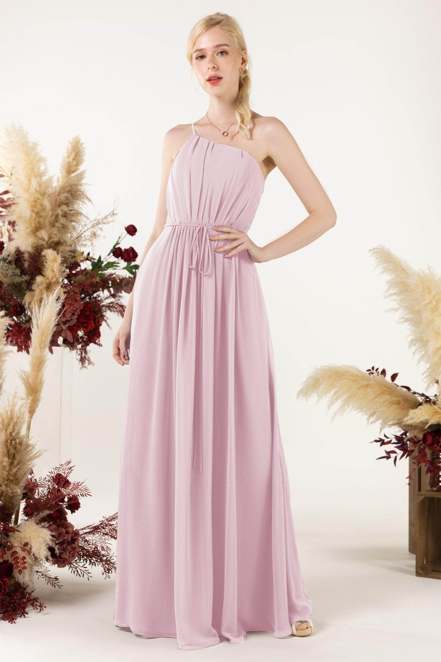 This bridesmaid dress combines elegance and practicality with its lightweight chiffon, one-shoulder design, and A-line silhouette. The flowing skirt, side split, sashes, and pockets add style and function, while the side zipper ensures a perfect fit.