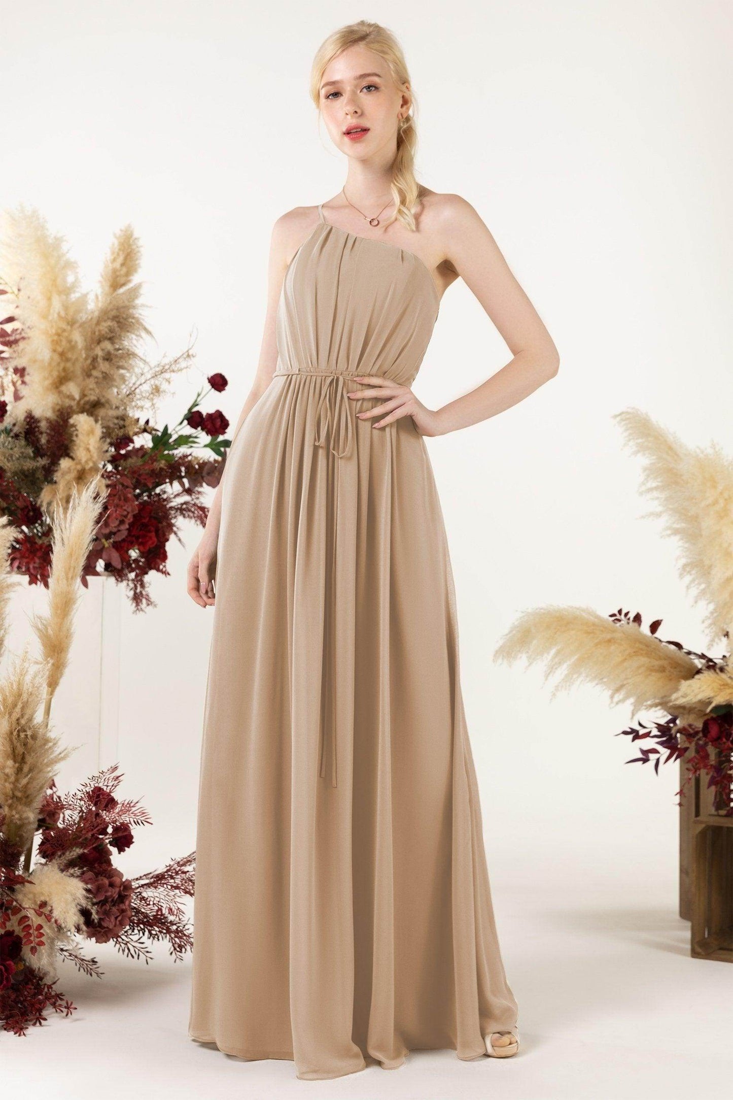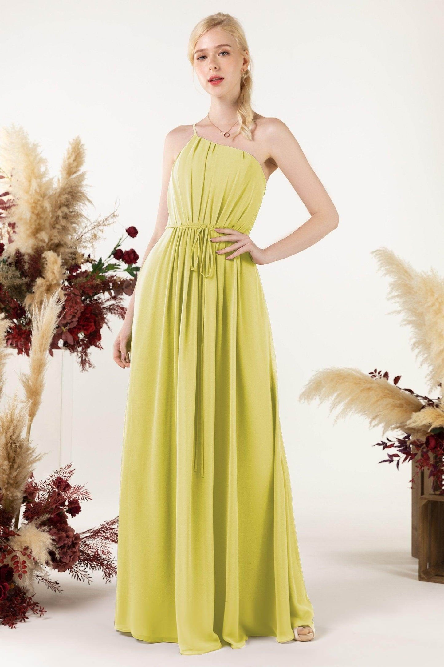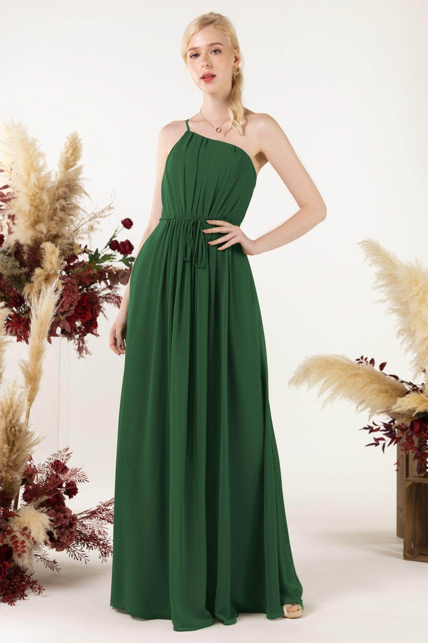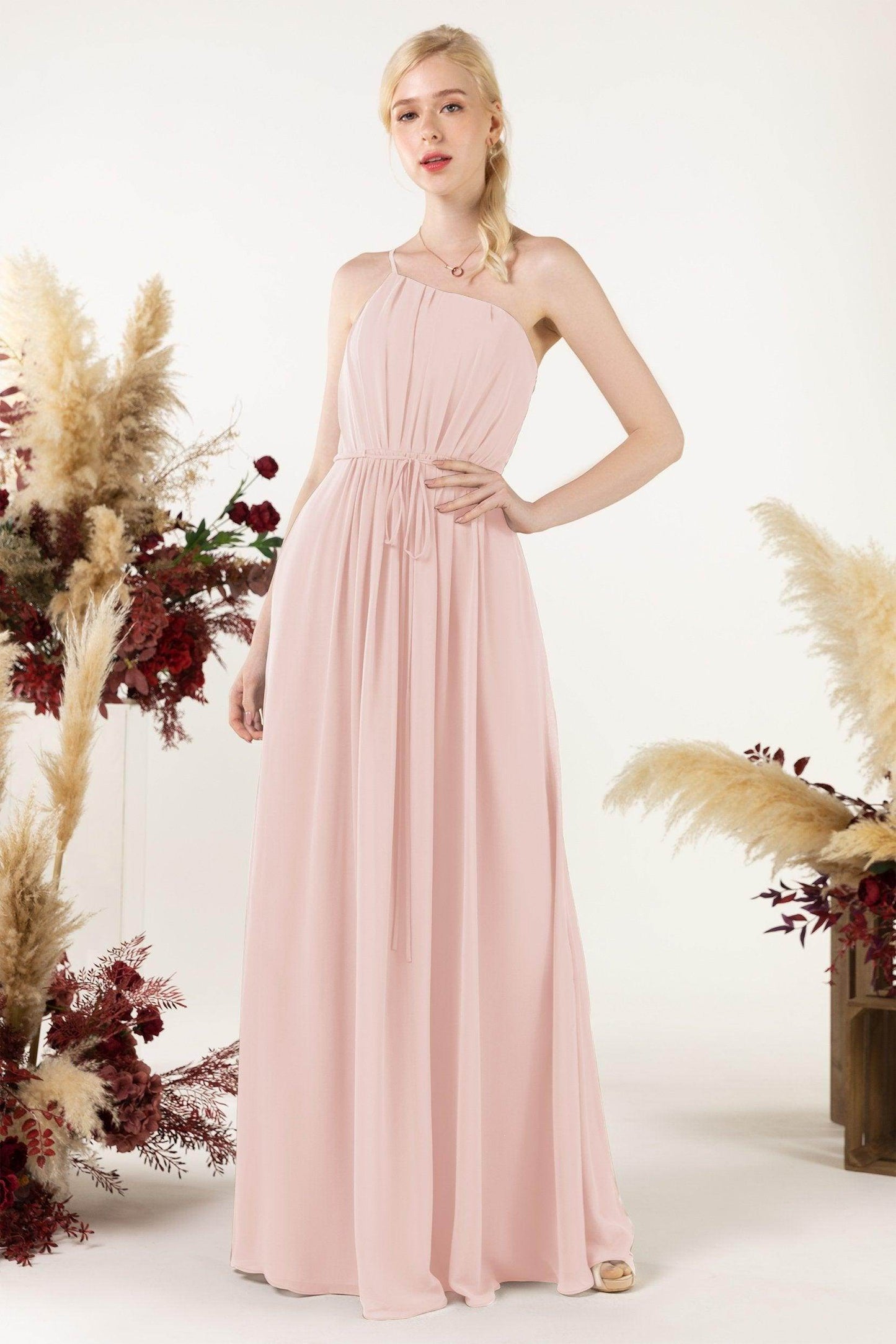 This bridesmaid dress combines elegance and practicality with its lightweight chiffon, one-shoulder design, and A-line silhouette. The flowing skirt, side split, sashes, and pockets add style and function, while the side zipper ensures a perfect fit.