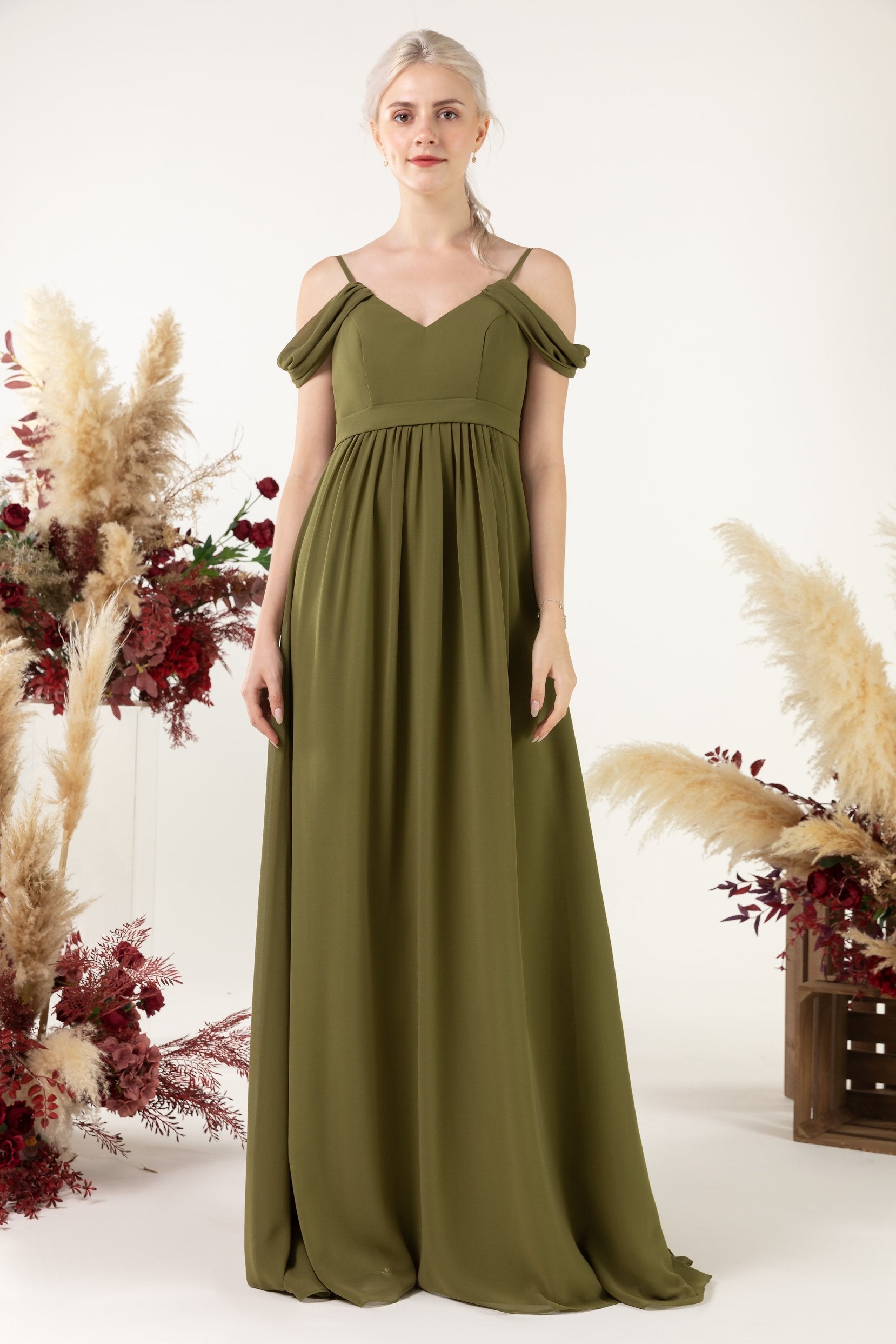 This bridesmaid dress combines elegance with practicality. Lightweight chiffon shines, while spaghetti straps and a high waist enhance your silhouette. The A-line skirt with pleats adds a touch of sophistication, and pockets offer convenience. A back zipper ensures a perfect fit.