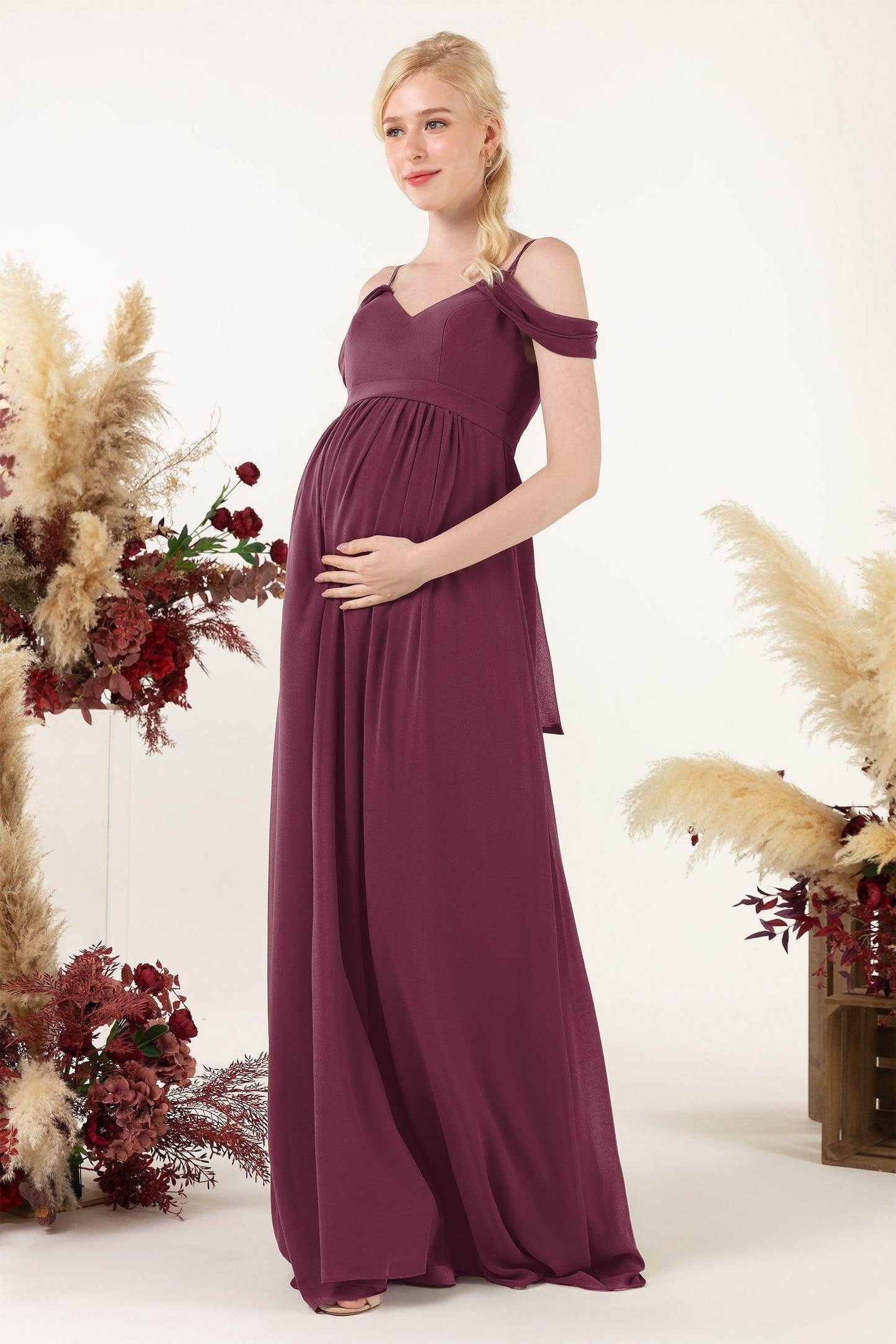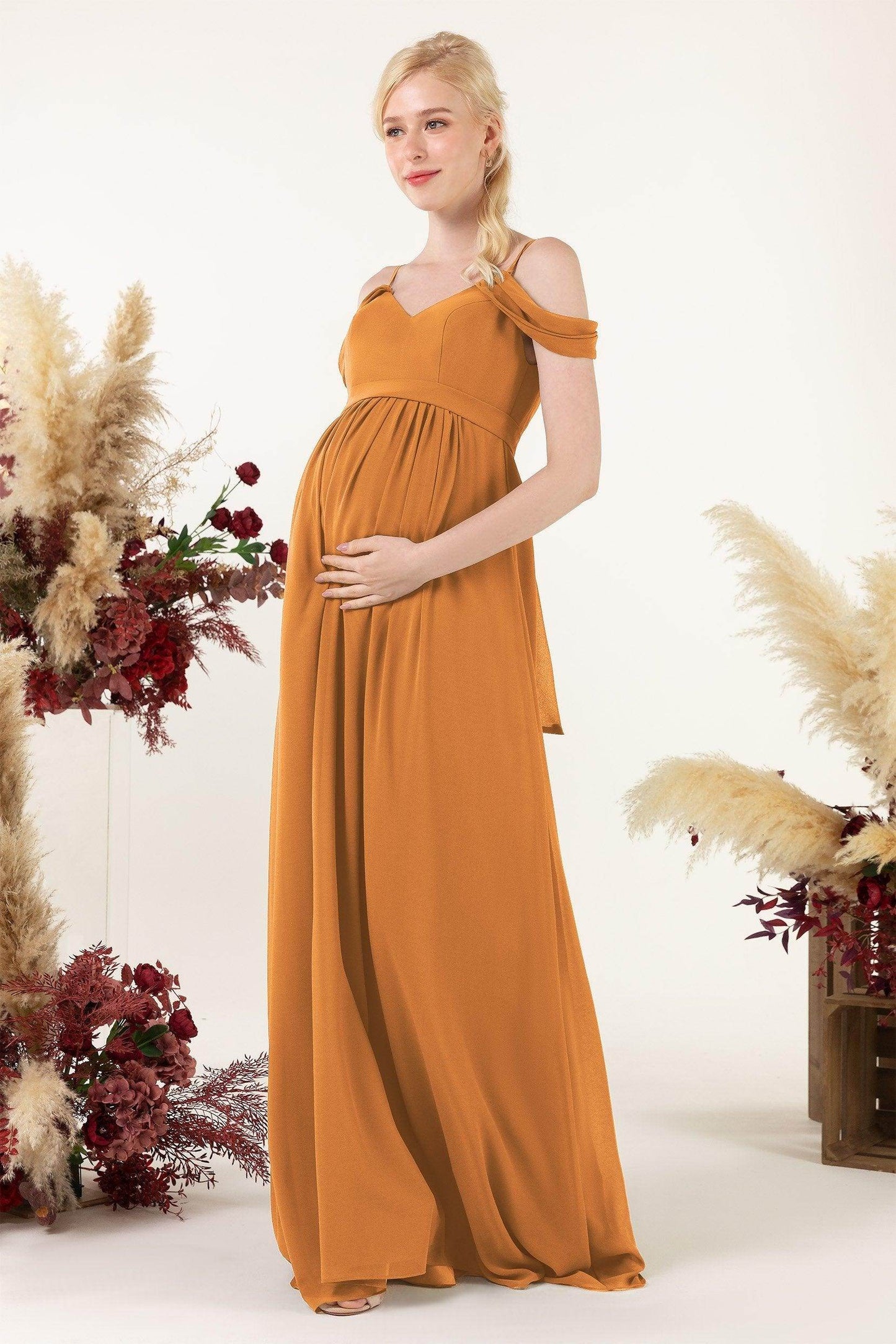 This bridesmaid dress blends modern elegance with practicality. A sleek back zipper, flowing chiffon, and spaghetti straps exude grace. The A-line skirt, empire waist, and pleating enhance sophistication, while pockets add functionality.