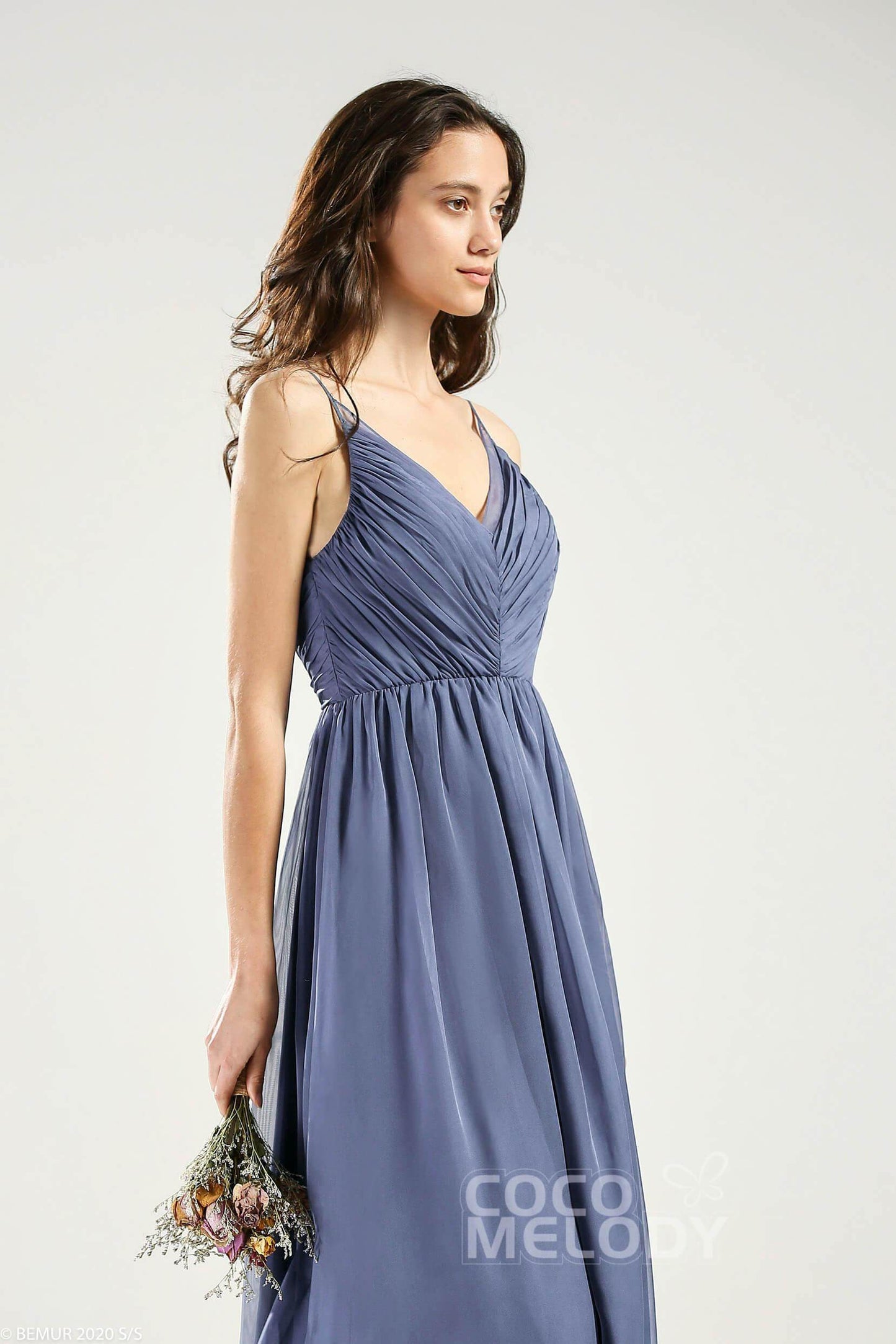 This elegant bridesmaid dress in soft chiffon creates a dreamy look, featuring delicate straps and a flattering A-line cut. The floor-length design highlights graceful shoulders and natural curves, while the modern back zipper adds practicality. Perfect for making every bridesmaid shine on the special day.