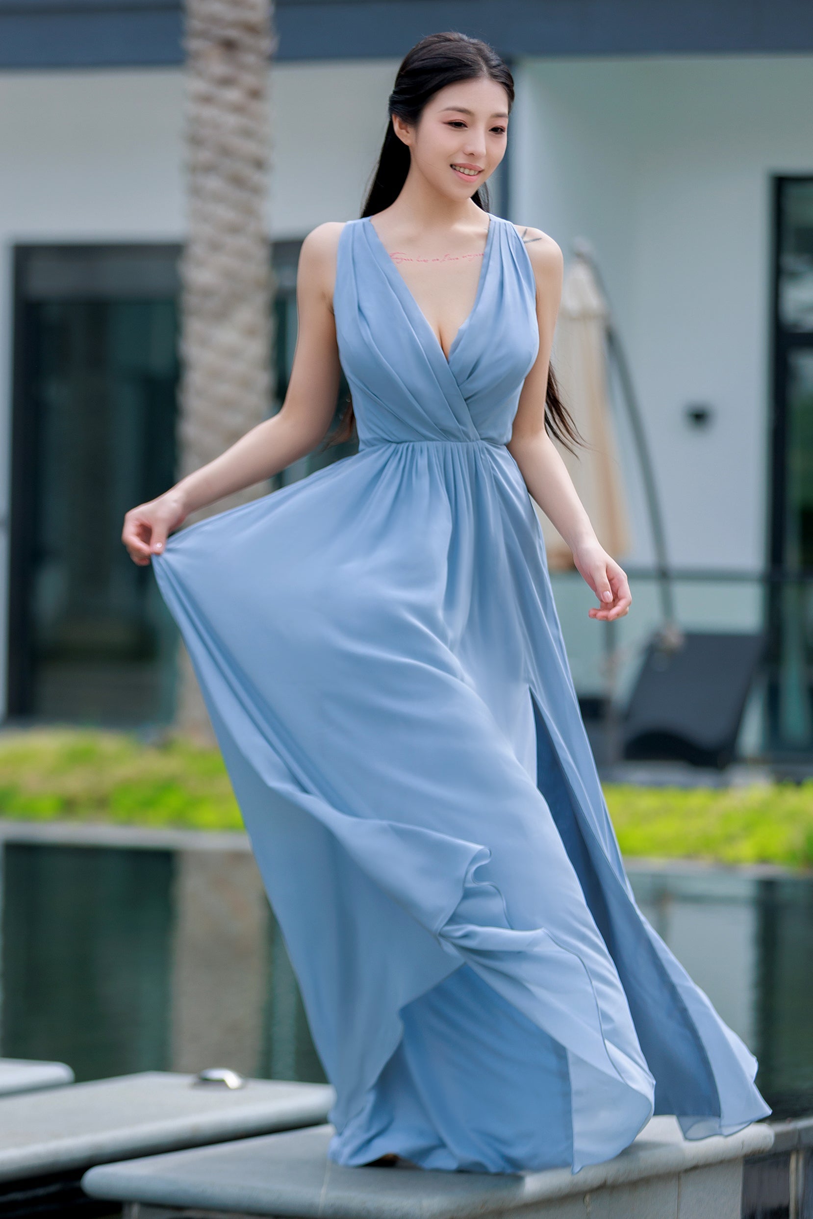 This chiffon A-line gown features a flattering V-neckline and sleeveless design, perfect for showcasing the natural waistline. With a zipper closure at the back and a floor-length hem, it's adorned with a stylish split and delicate pleating, ideal for adding a touch of elegance to any formal affair.