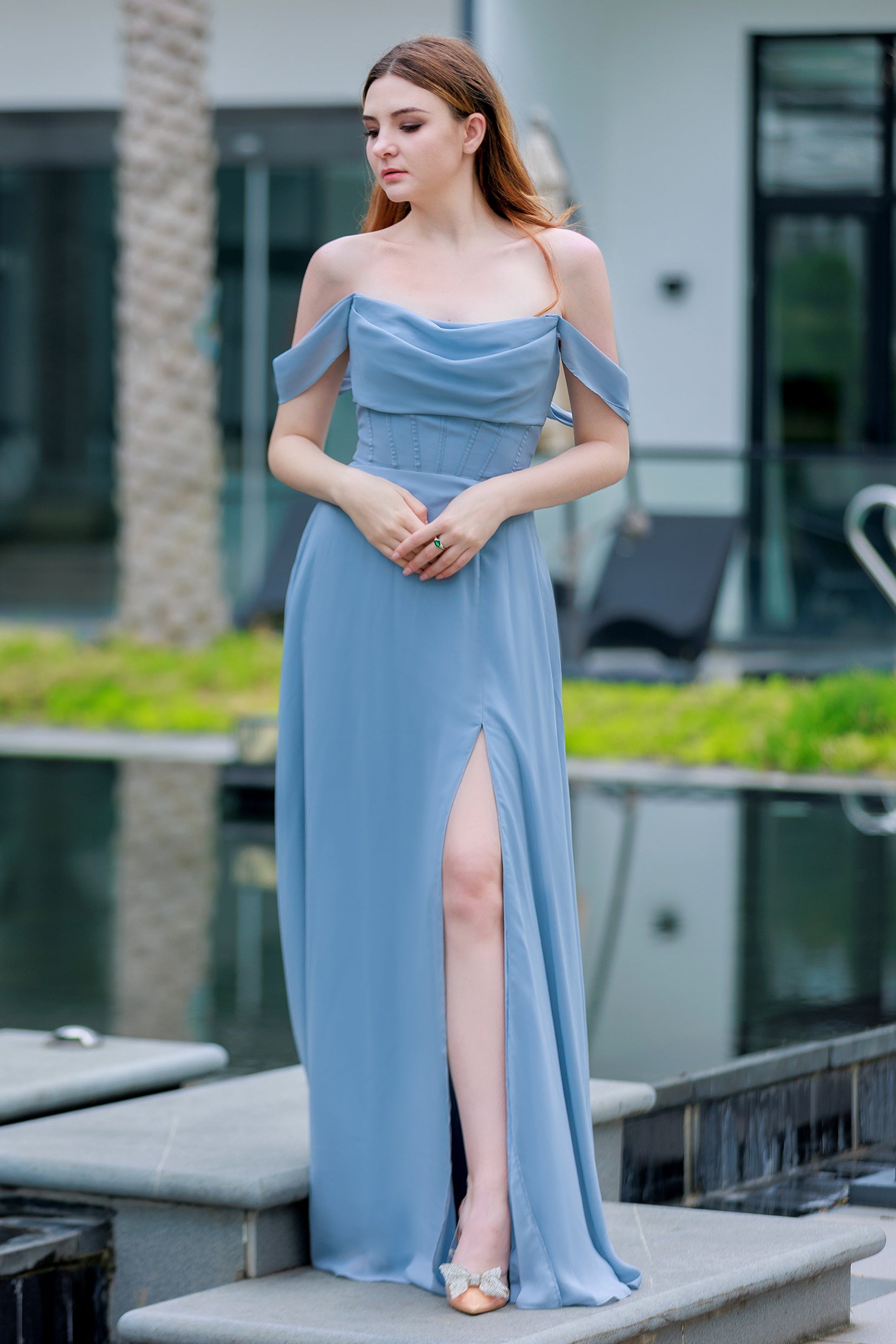 This Chiffon A-line gown combines off-the-shoulder sleeves with a flattering neckline and natural waistline. The floor-length design is accented by practical pockets, a stylish slit, and delicate pleating, ensuring elegance and functionality for formal occasions and special events.