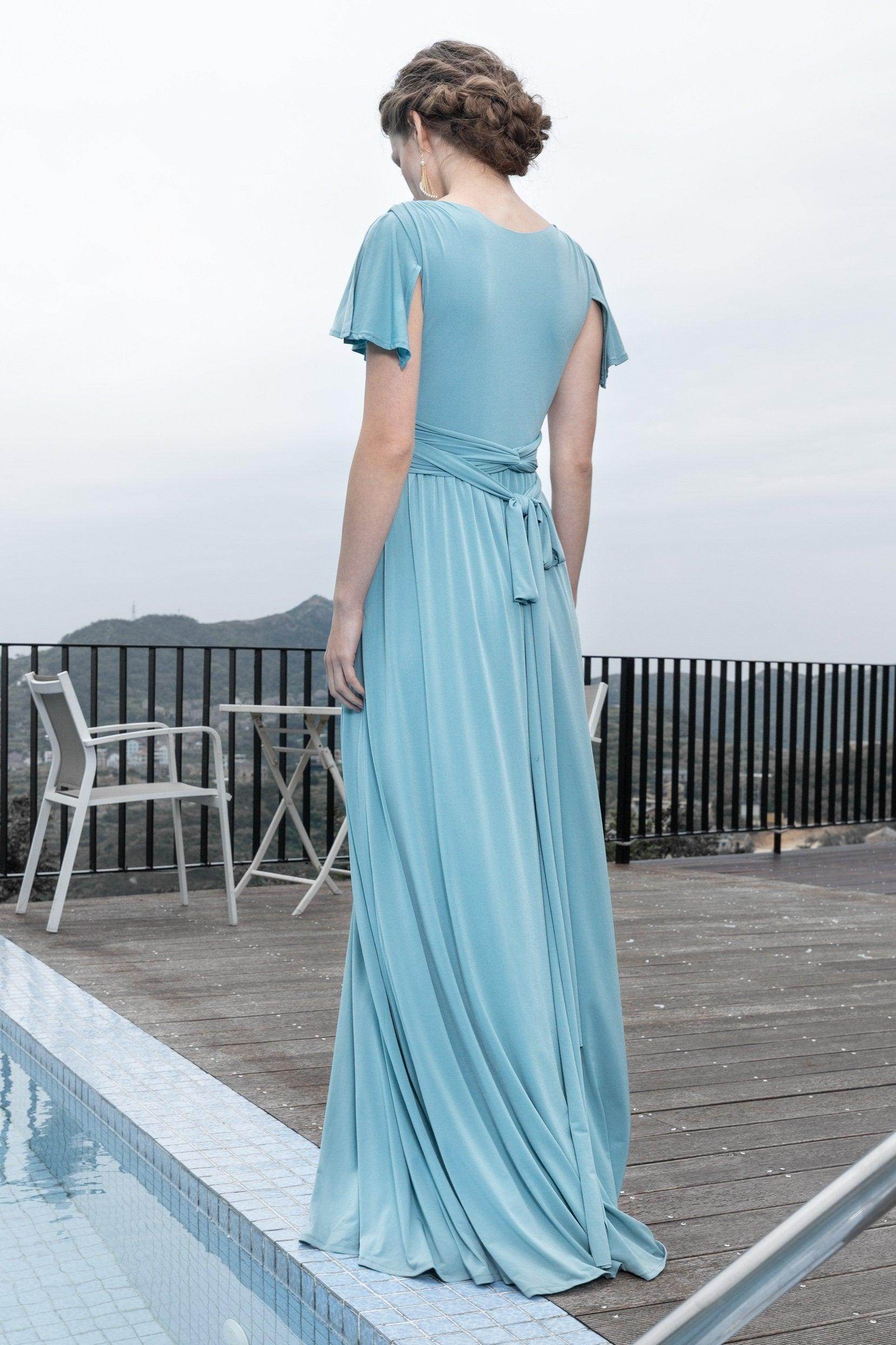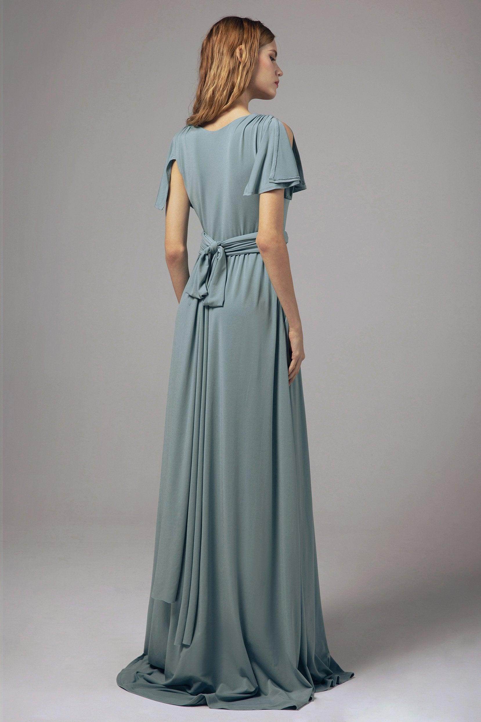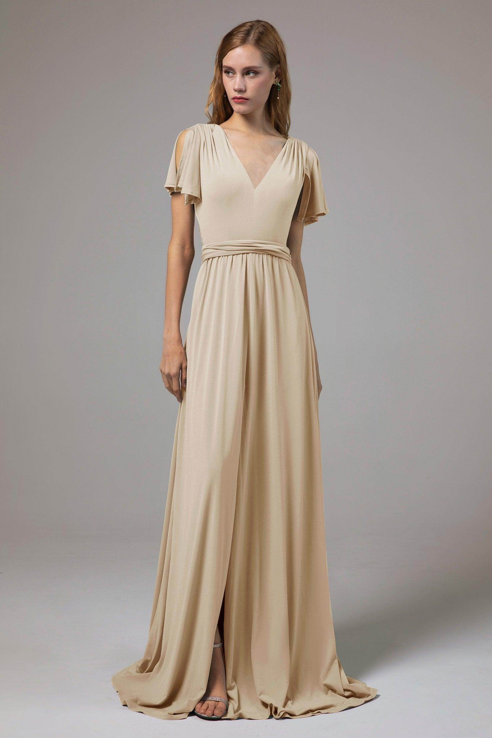 This bridesmaid dress blends elegance with practicality. The side zipper and soft knit fabric ensure comfort. A floor-length A-line skirt, V-neckline, and short sleeves enhance grace. The natural waist and split skirt with pockets add style and function, perfect for any formal event.