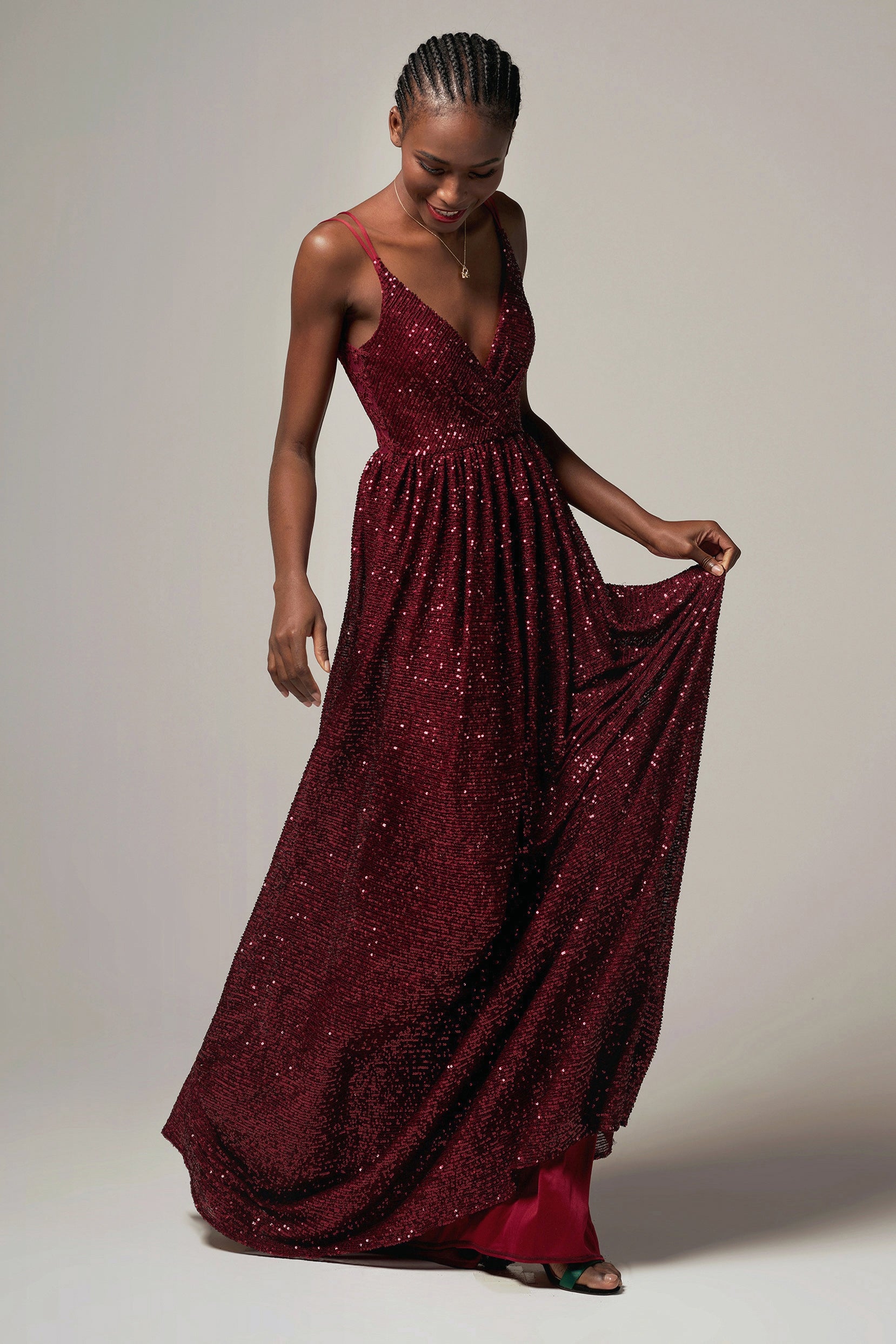 This bridesmaid dress combines unmatched glamour and elegance. Shimmering sequins and intricate appliqué details enhance its allure. The floor-length A-line cut, spaghetti straps, and sleeveless design highlight a graceful silhouette and perfect curves, making it ideal for formal events.