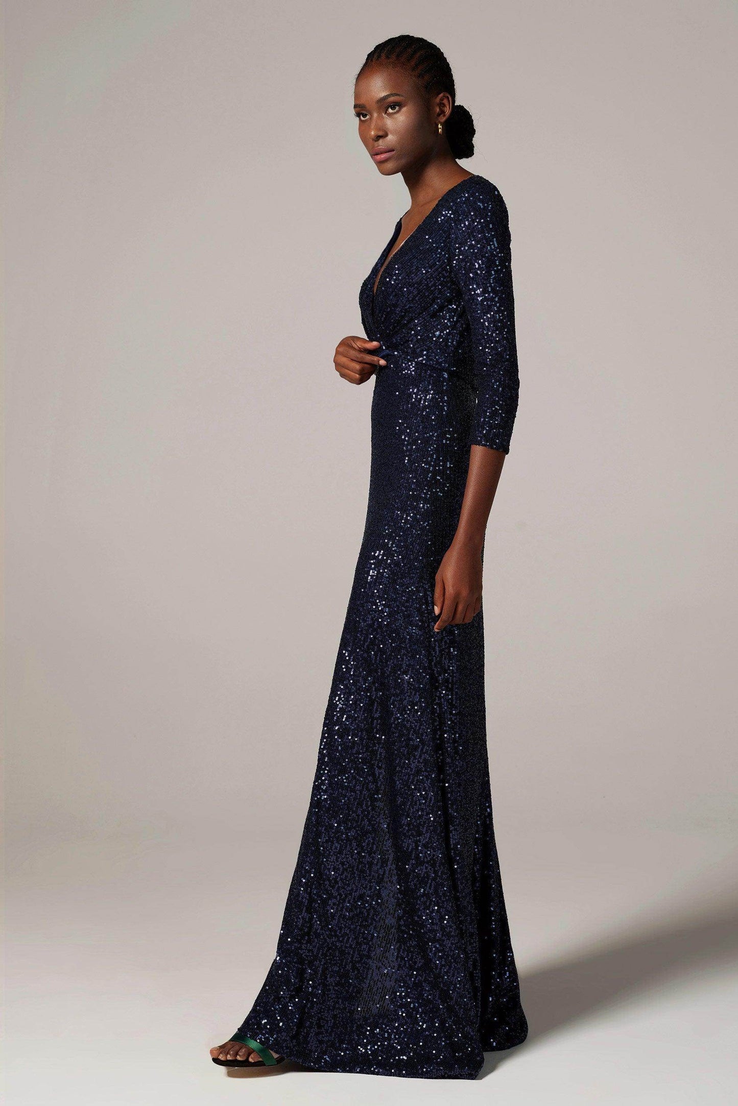 A-Line V-Neck Natural Floor Length Sequined 3/4 Length Sleeve Key Hole Dress with Split CS0292