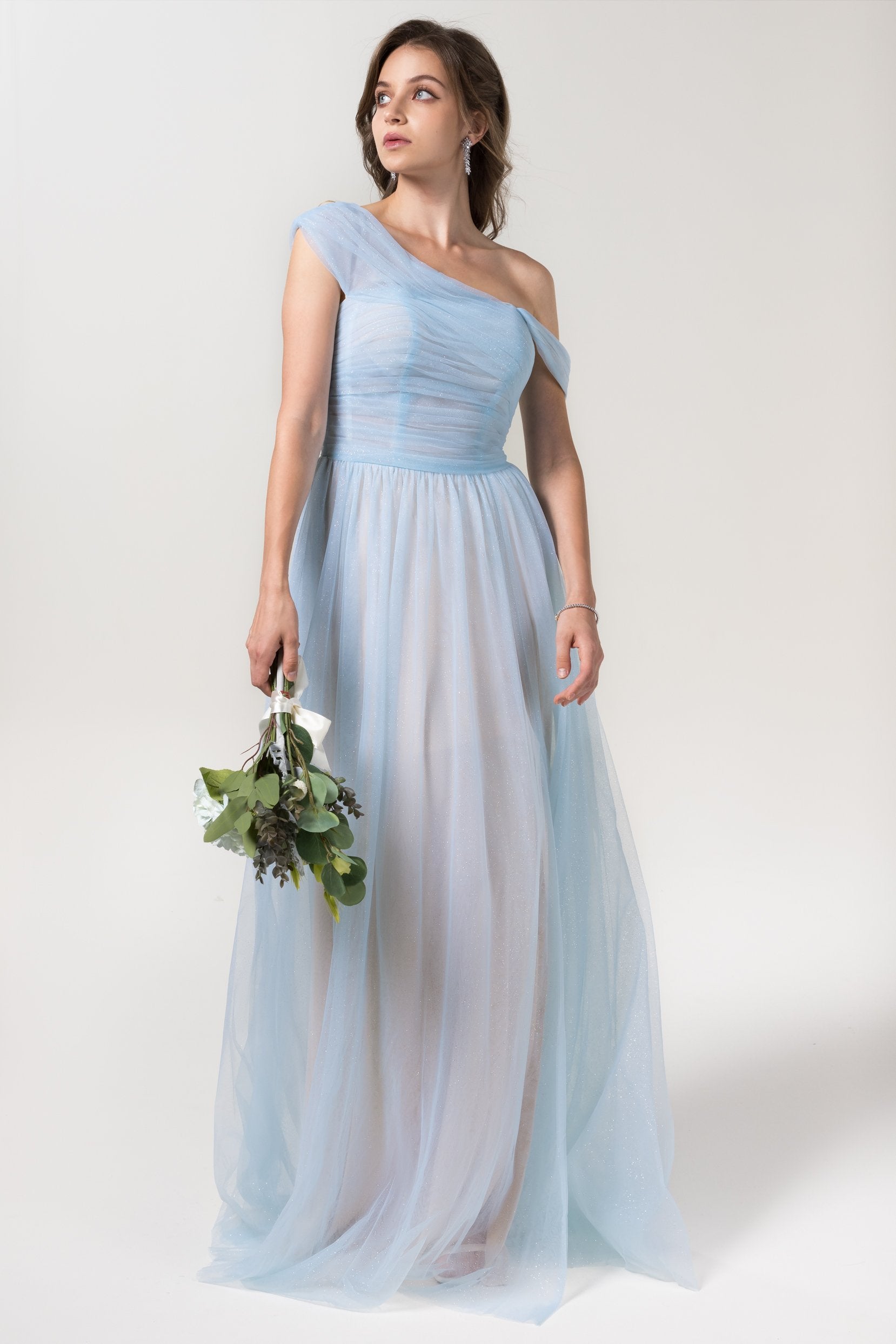 Cocomelody's CB0614 dress is a beautiful choice for your bridesmaids. It comes in three colors, has sparkling tulle, one shoulder, asymmetrical sleeves, and pleating and split details.