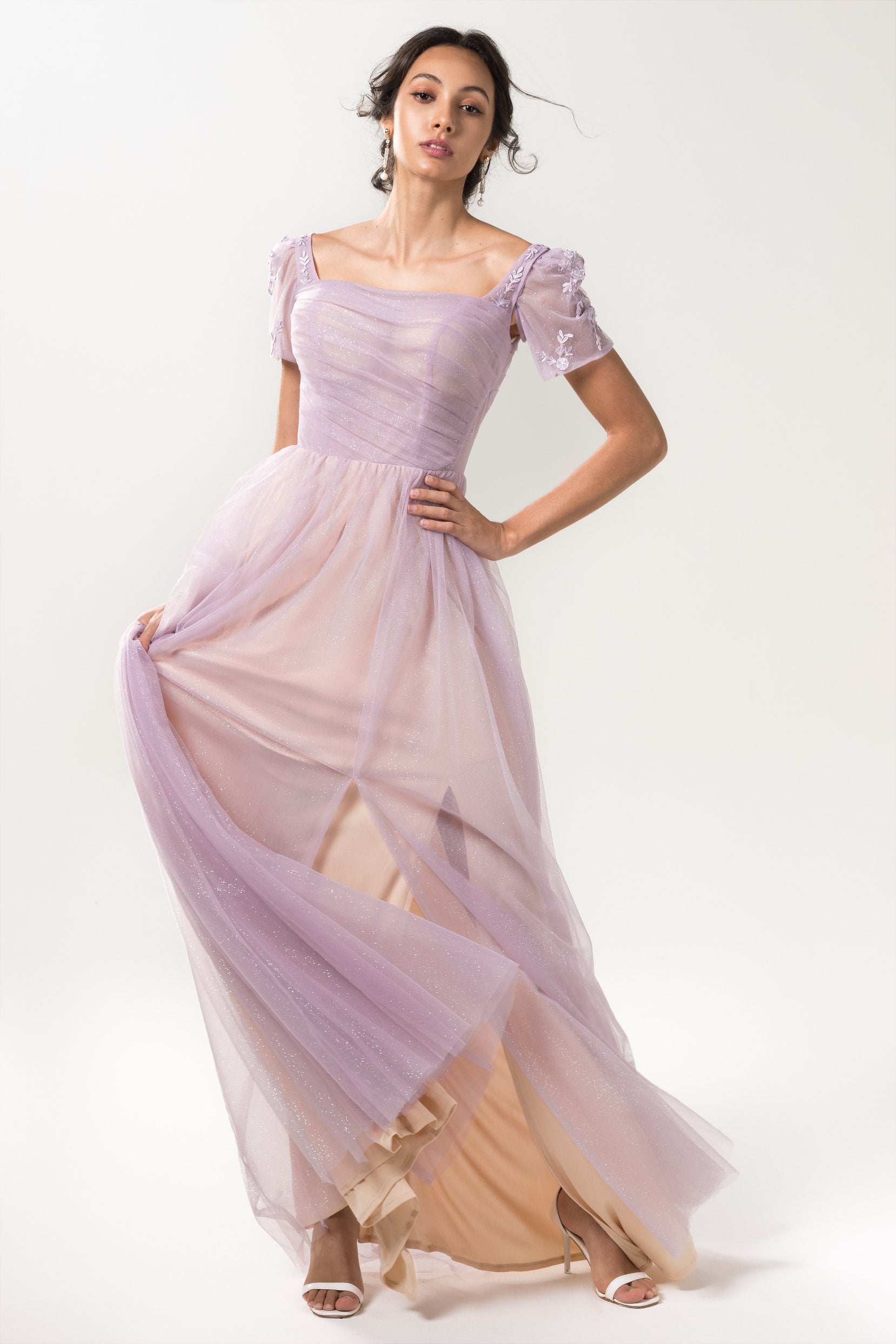 This beautiful tulle bridesmaid dress is perfect for any formal occasion. The purple dress has a square neckline and features pleating and a split in the skirt. The a-line silhouette is figure-flattering and the detachable short sleeve adds a touch of elegance.