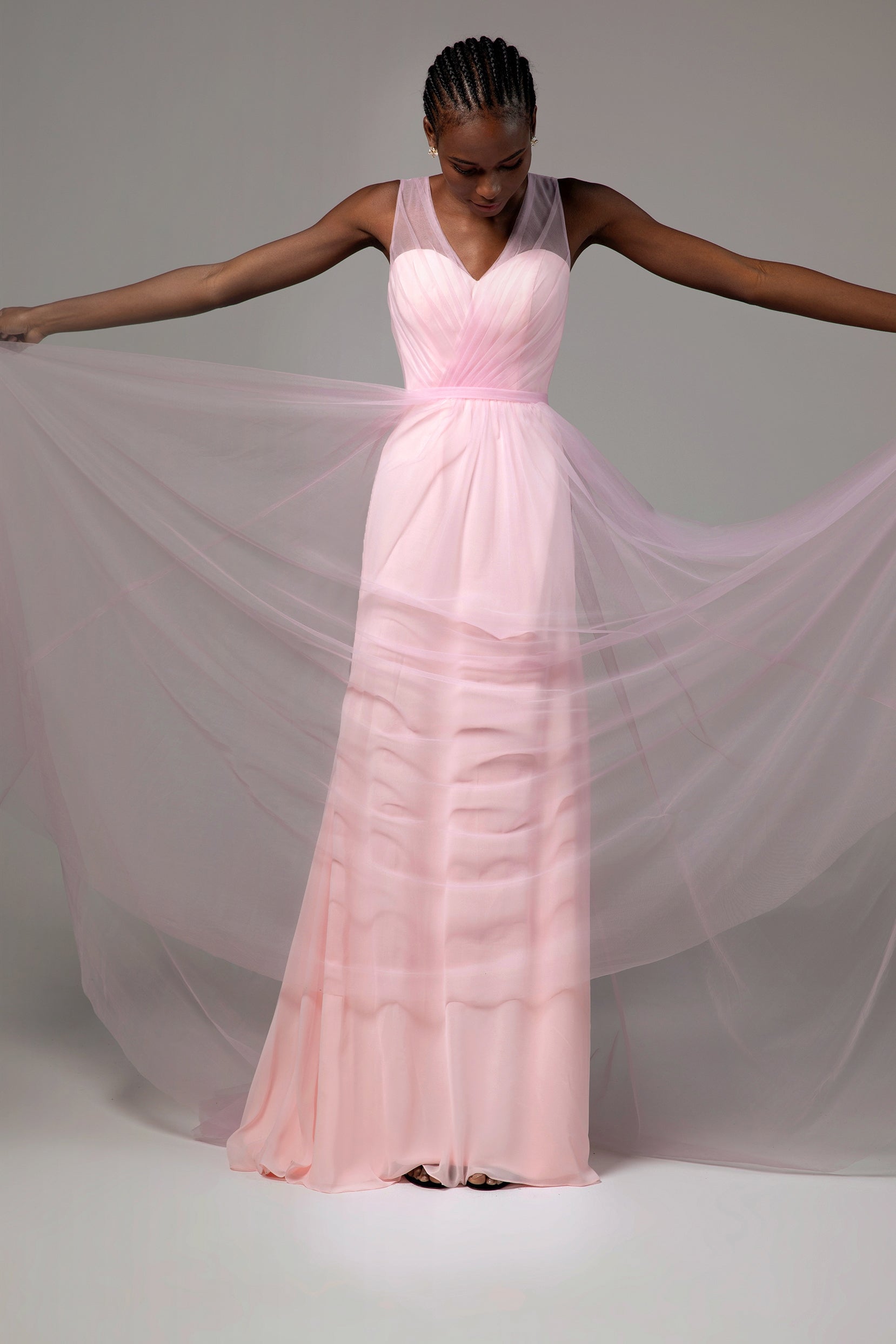 This bridesmaid dress blends elegance and romance perfectly. The back zipper and lightweight tulle create a dreamy, flowing effect. The V-neck and sleeveless design highlight your figure, while the natural waist and intricate pleats add unique detail, making it ideal for any formal event.