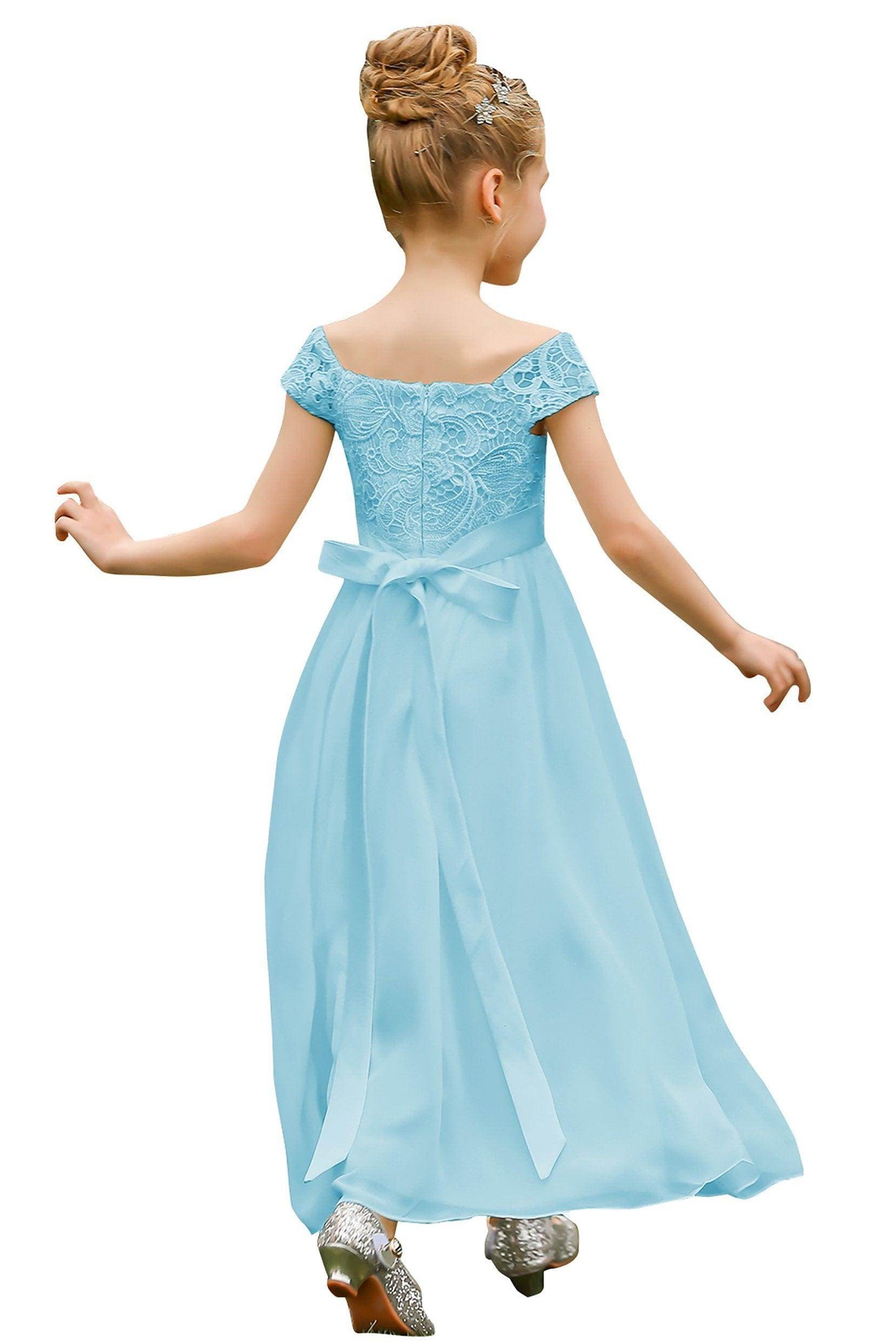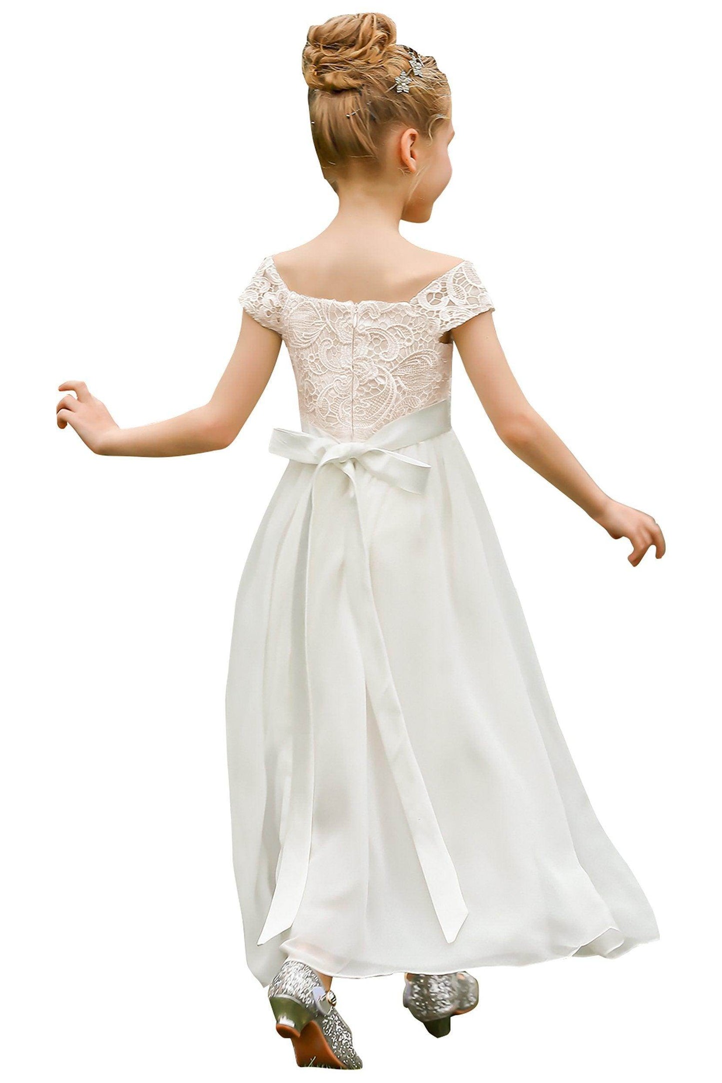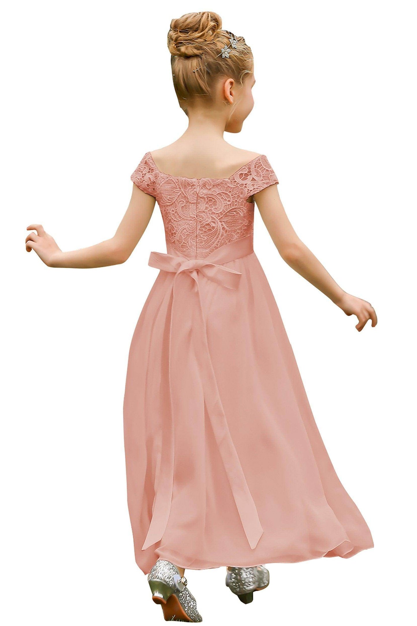 This stunning off-the-shoulder A-line floor-length flower girl dress with cap sleeves and a natural waist is perfect for weddings and special occasions.