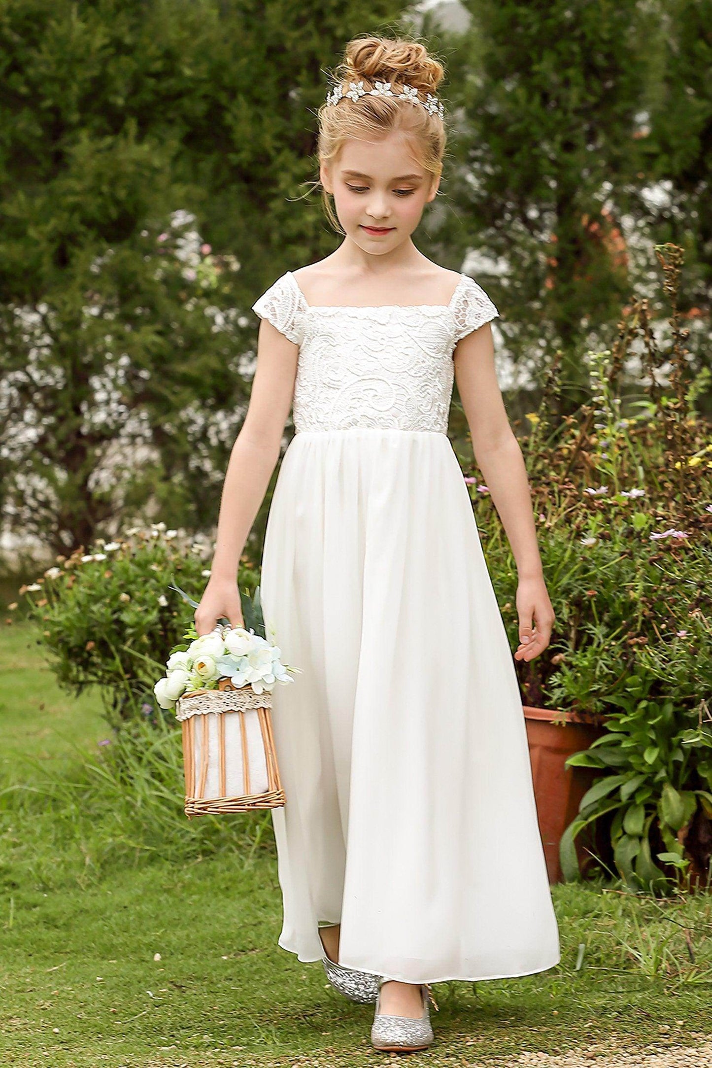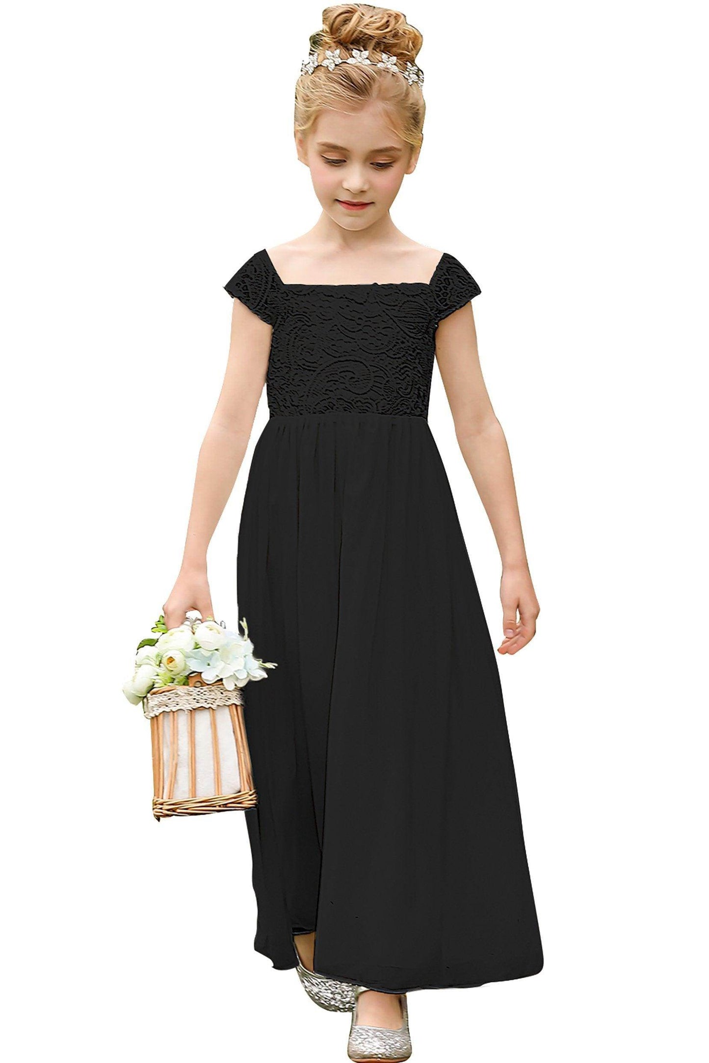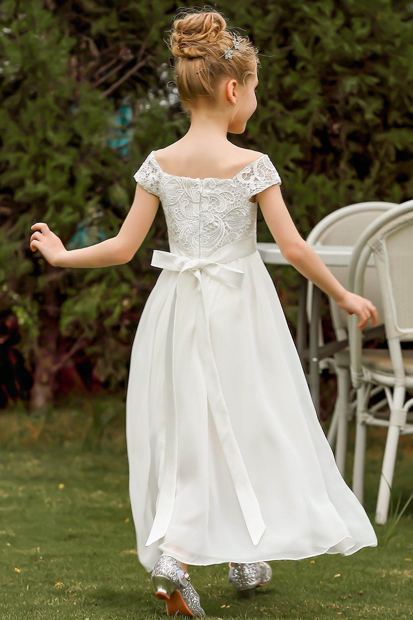 This stunning off-the-shoulder A-line floor-length flower girl dress with cap sleeves and a natural waist is perfect for weddings and special occasions.