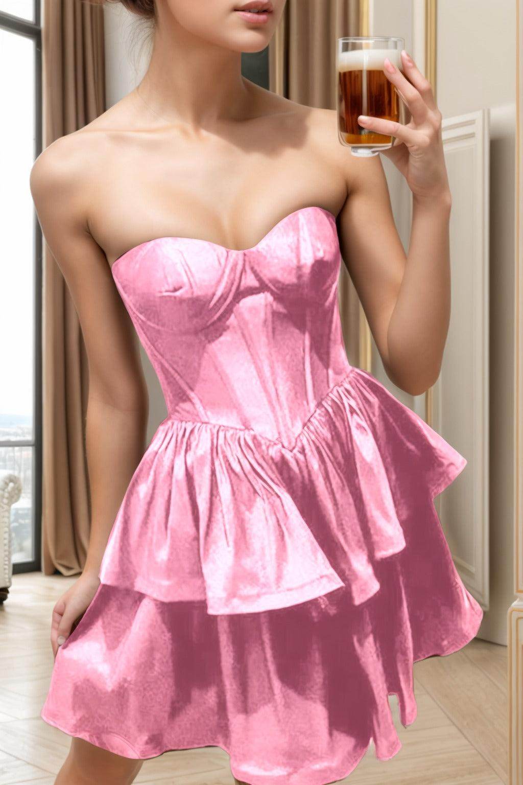A chic A-line dress with a strapless neckline and natural waist, crafted from elegant taffeta fabric adorned with graceful ruffles. Its sleeveless design, zipper back, and knee-length cut create a stylish and sophisticated look, perfect for upscale events and special occasions.