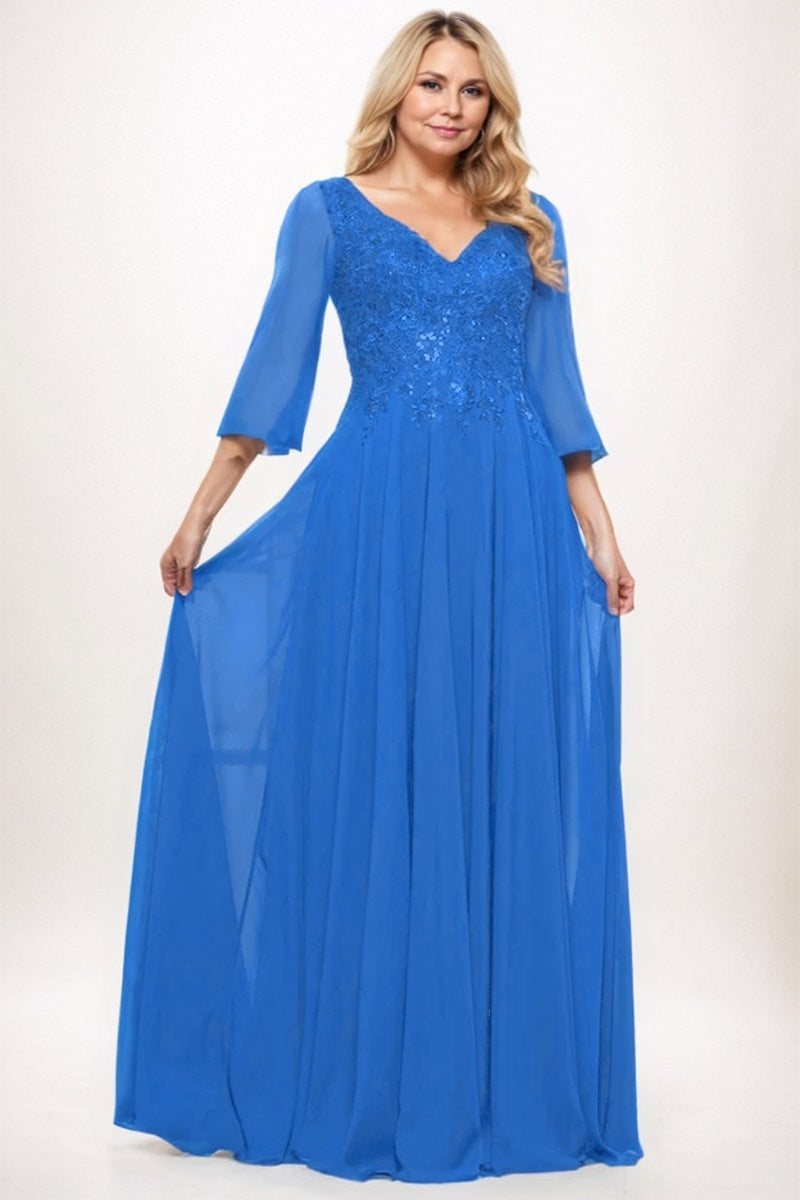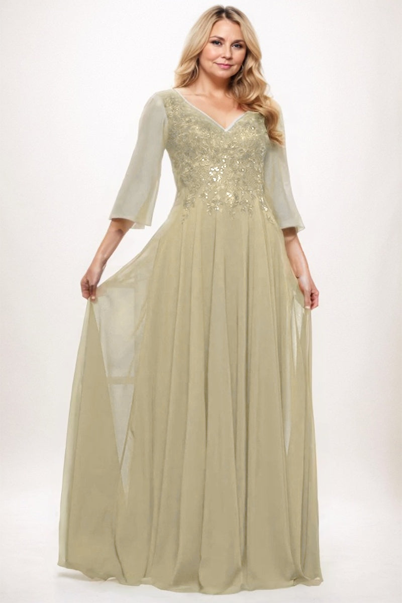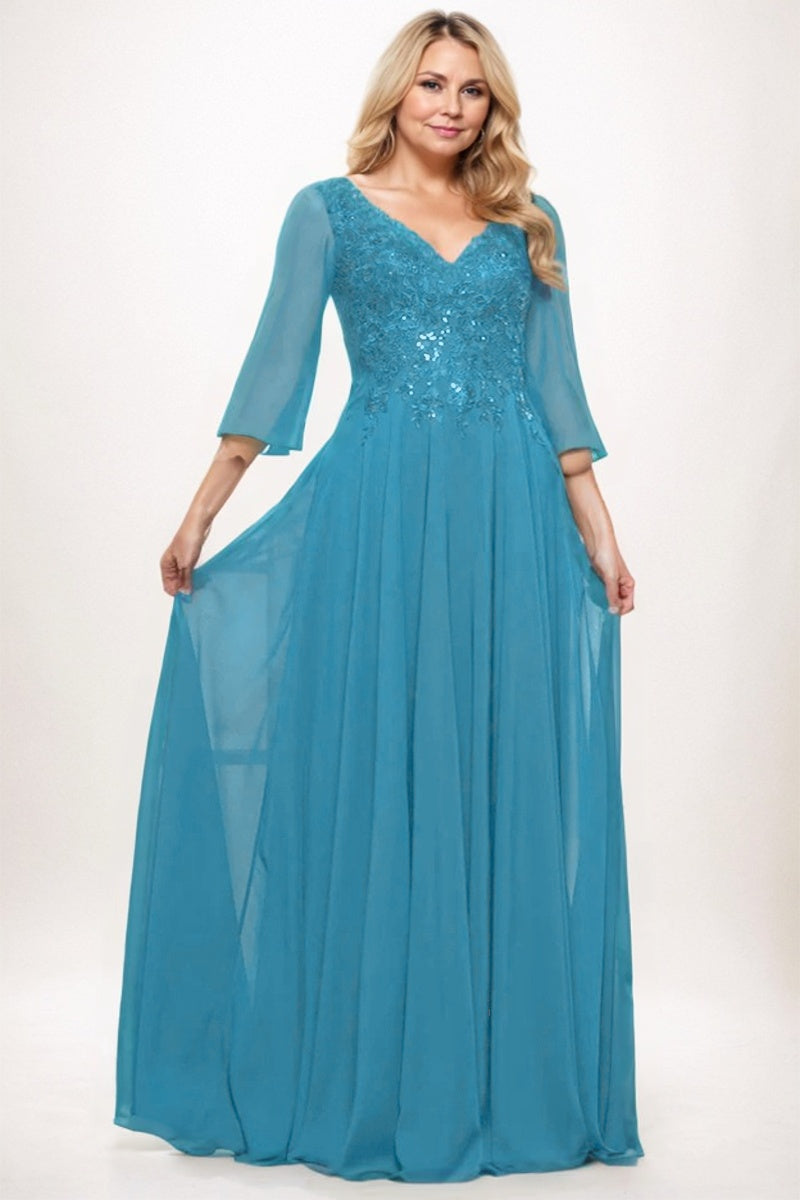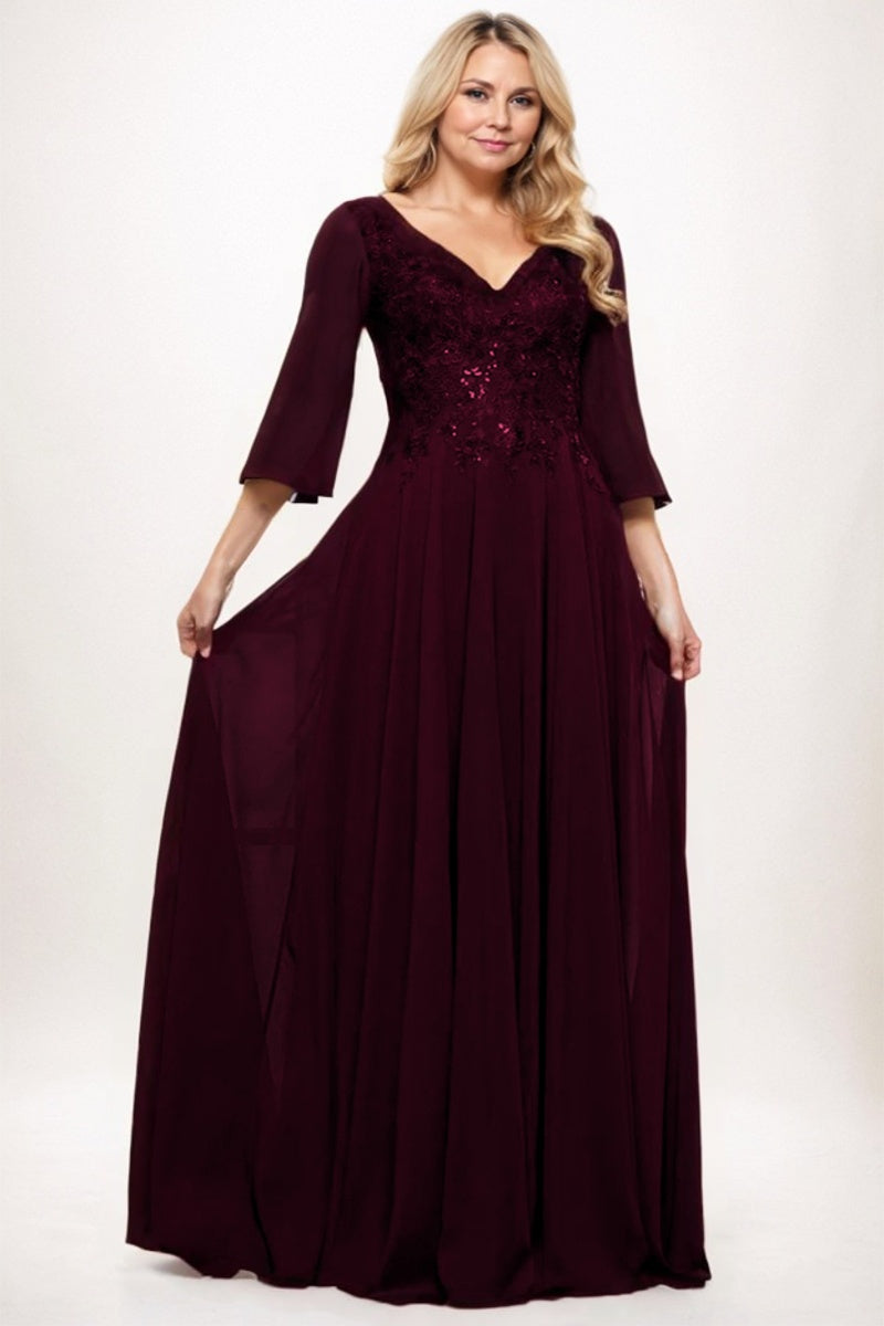 This elegant A-line maxi chiffon dress with a V-neck and 3/4 sleeves features lace and beading, perfect for Mother of the Bride Dresses, designed with a natural waist and a zipper back.
