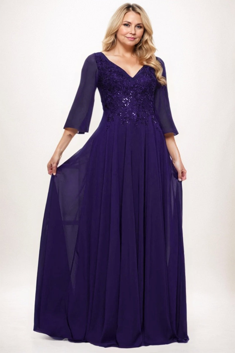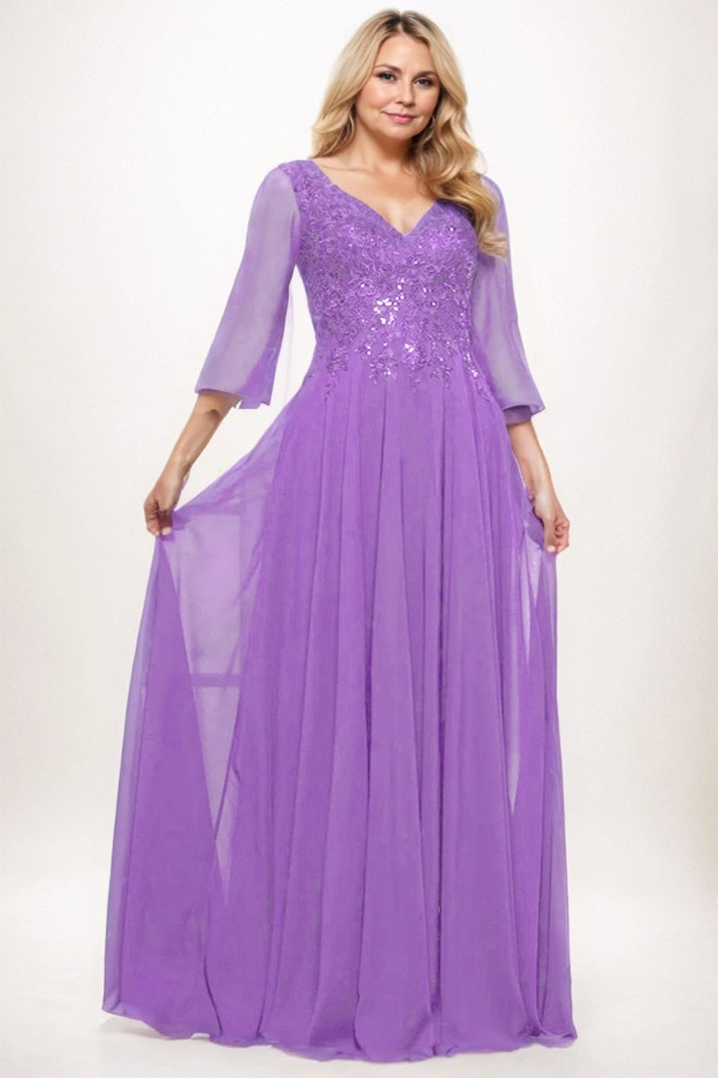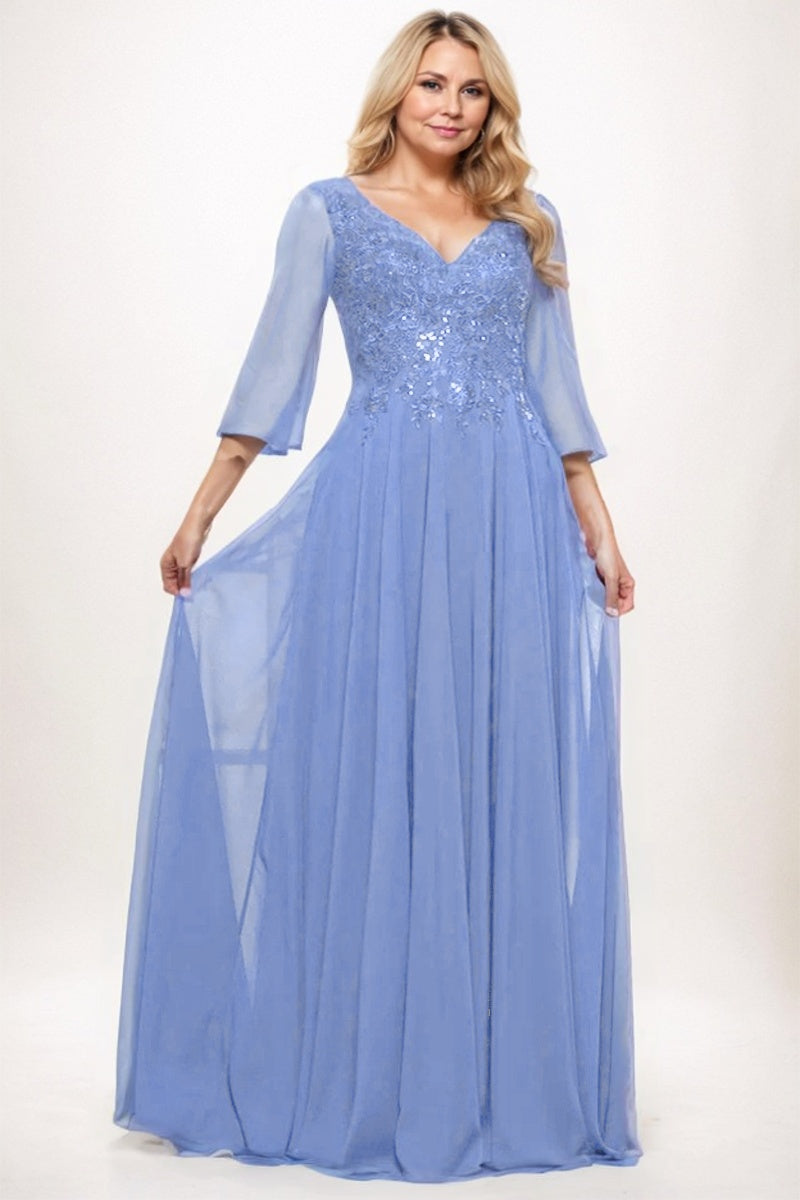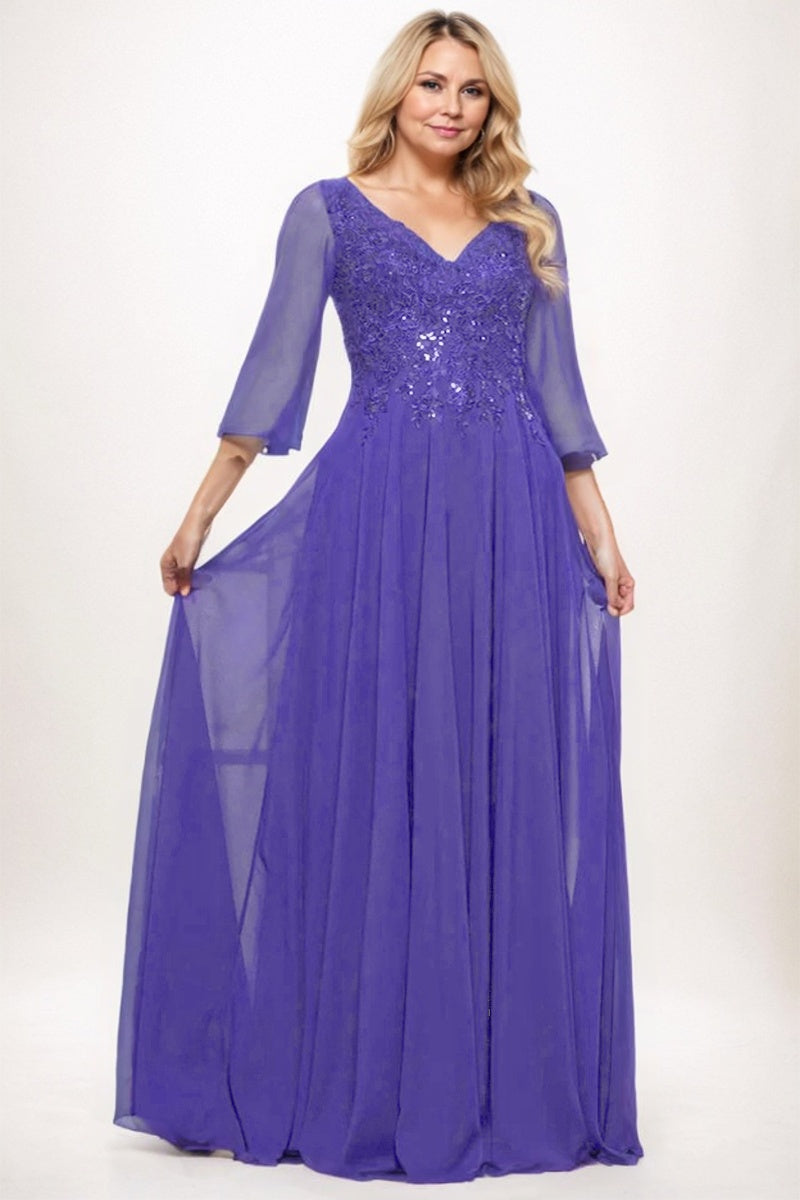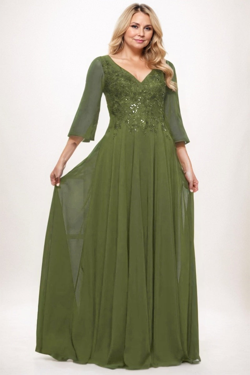 This elegant A-line maxi chiffon dress with a V-neck and 3/4 sleeves features lace and beading, perfect for Mother of the Bride Dresses, designed with a natural waist and a zipper back.