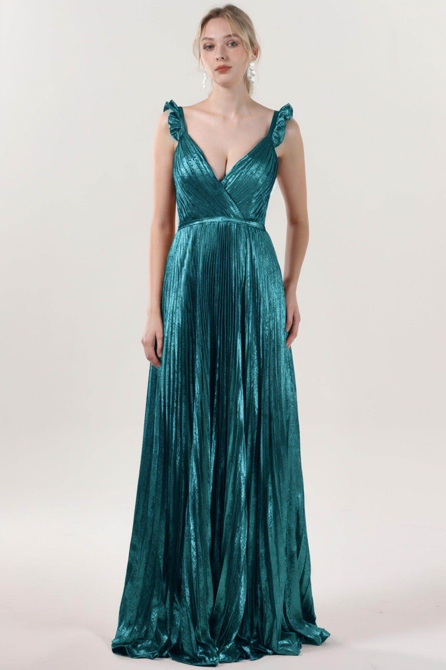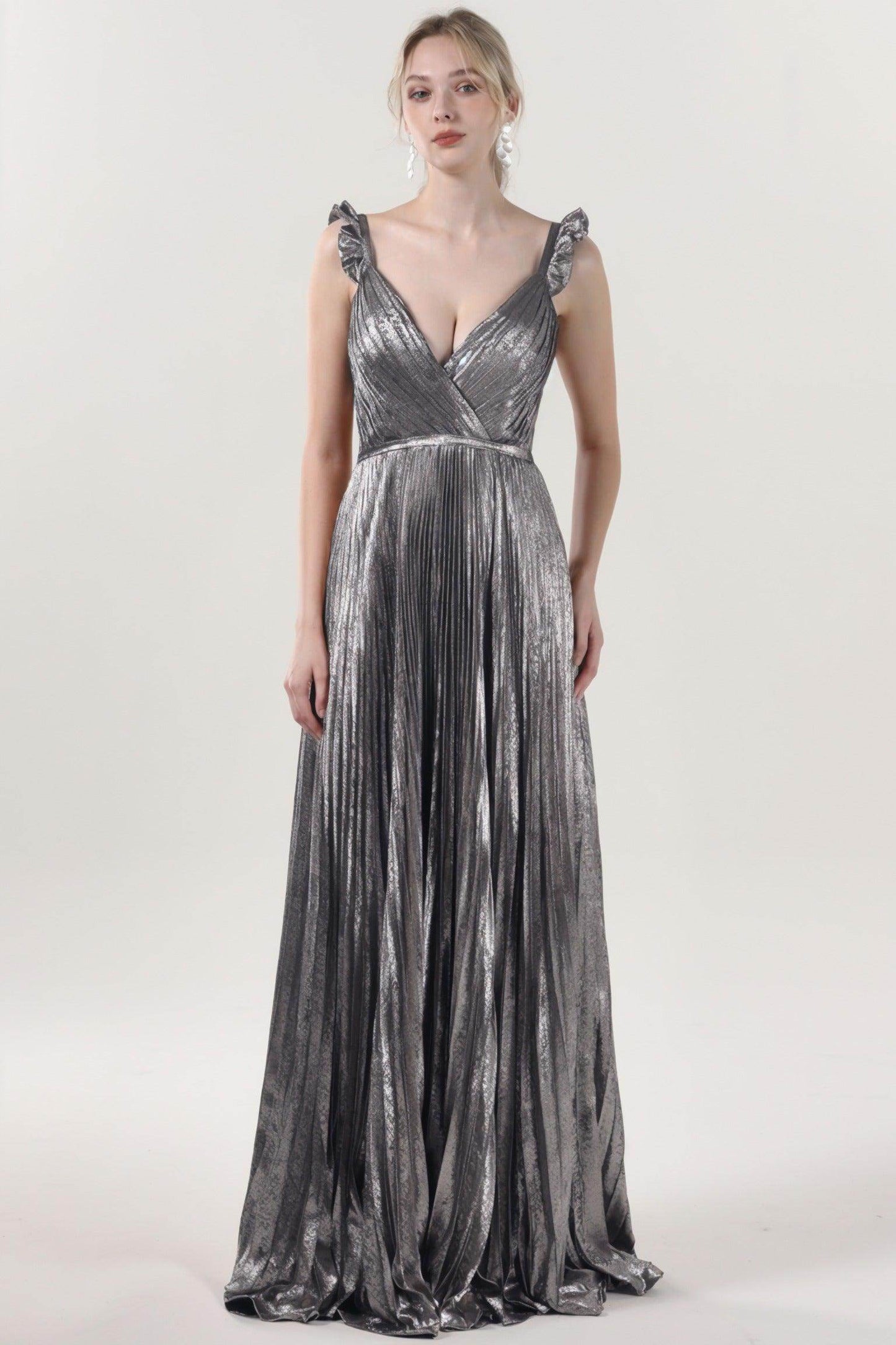 Dazzle in our V-Neck A-Line Maxi Dress, featuring radiant metallic fabric and elegant pleating! Perfect for Formal & Evening Dresses, Wedding Guest Dresses, Homecoming Dresses, Cocktail & Party Dresses, and Prom & Formal Dresses, make every moment unforgettable with this stunning piece!
