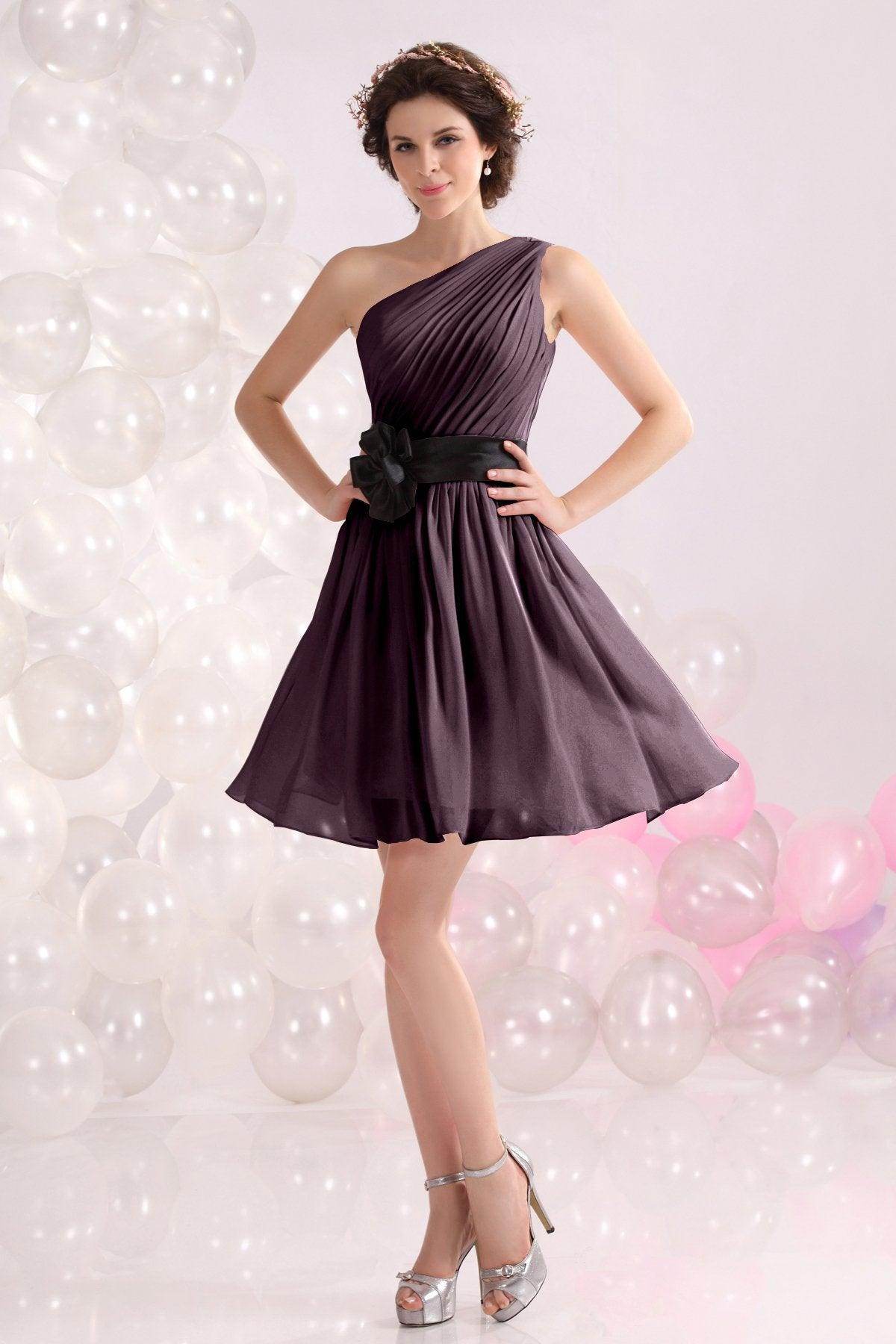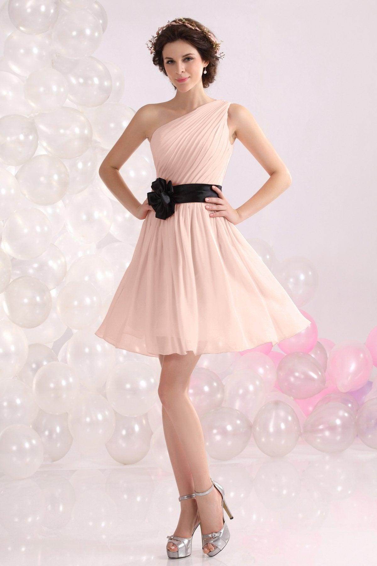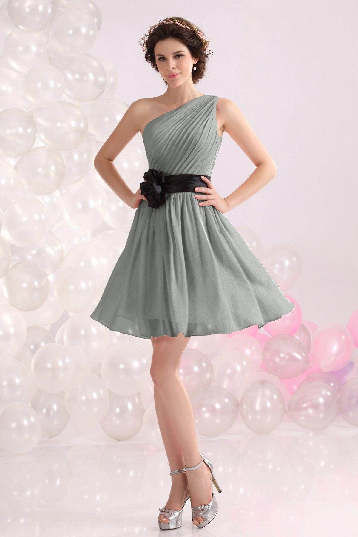 This bridesmaid dress features a chic one-shoulder design and a stylish side zipper. Made from airy chiffon, it offers a playful short A-line silhouette with a natural waist. The dress is adorned with delicate pleating and floral accents, adding a touch of elegance and charm.