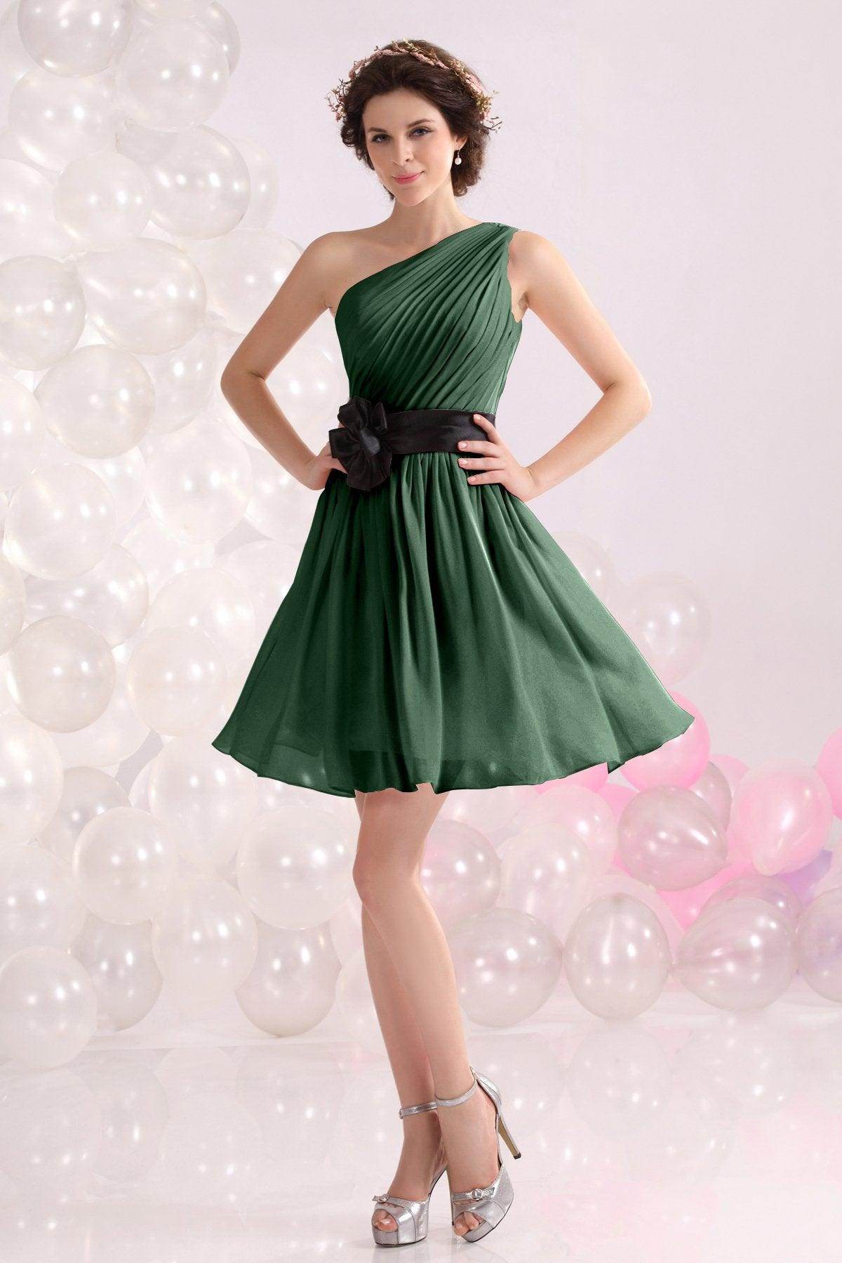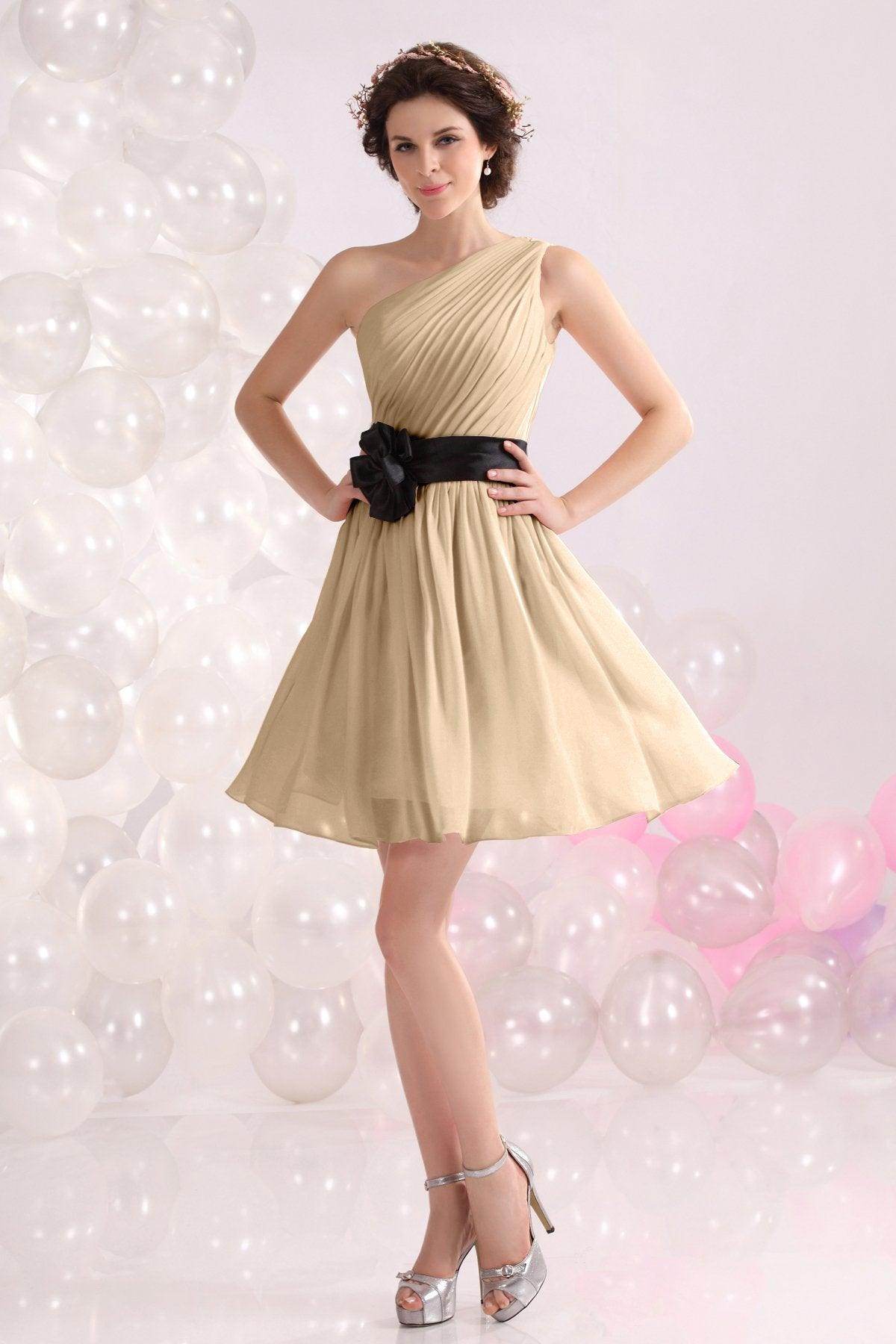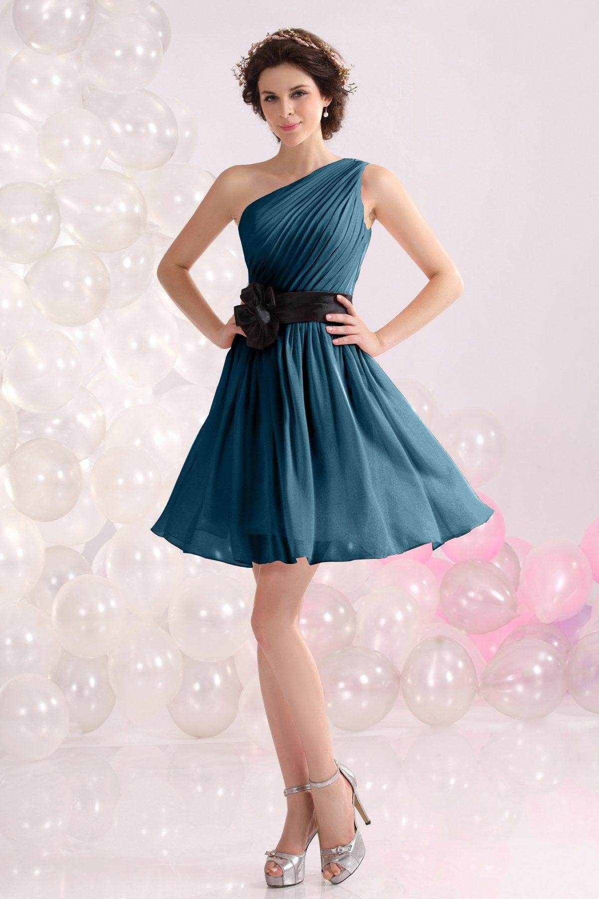 This bridesmaid dress features a chic one-shoulder design and a stylish side zipper. Made from airy chiffon, it offers a playful short A-line silhouette with a natural waist. The dress is adorned with delicate pleating and floral accents, adding a touch of elegance and charm.